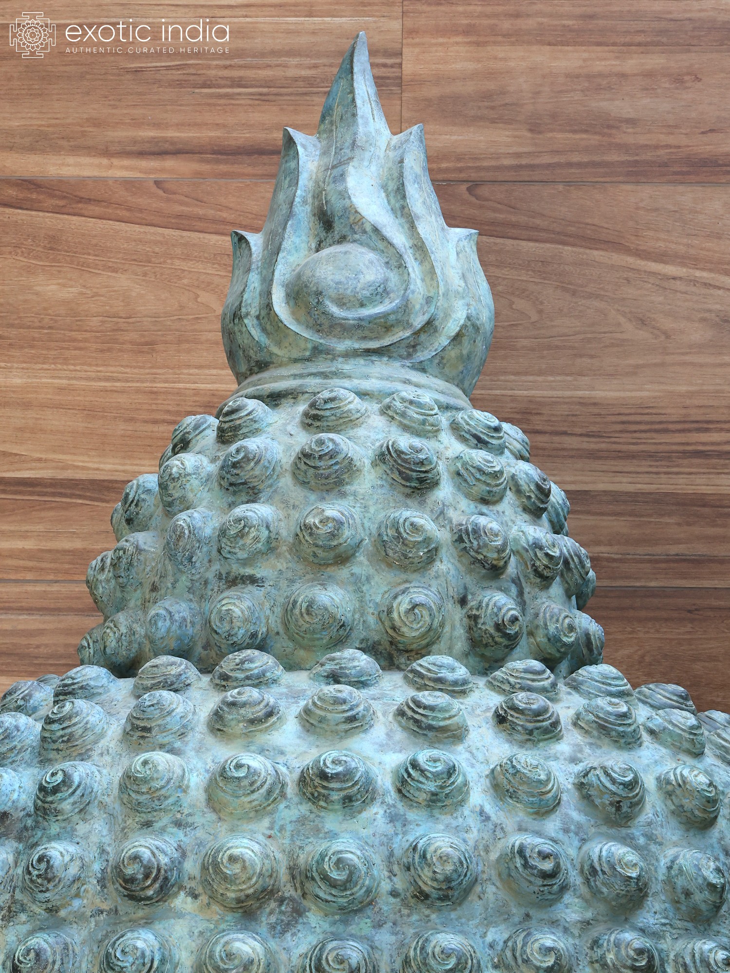 Depicts the serene countenance of Buddha, adorned with the symbolic sacred flame ushnisha.