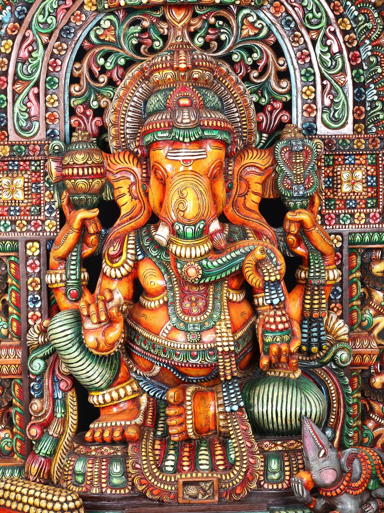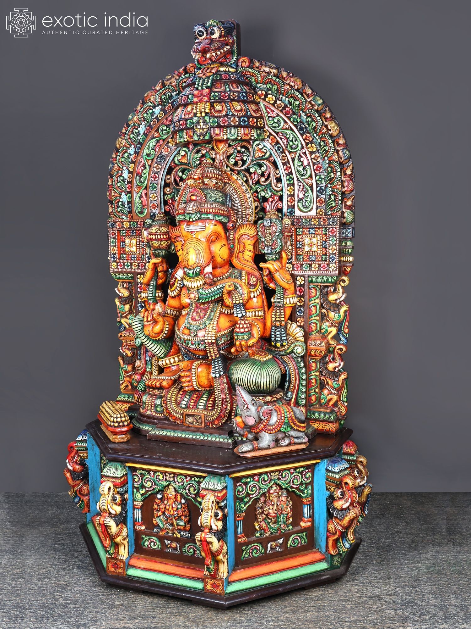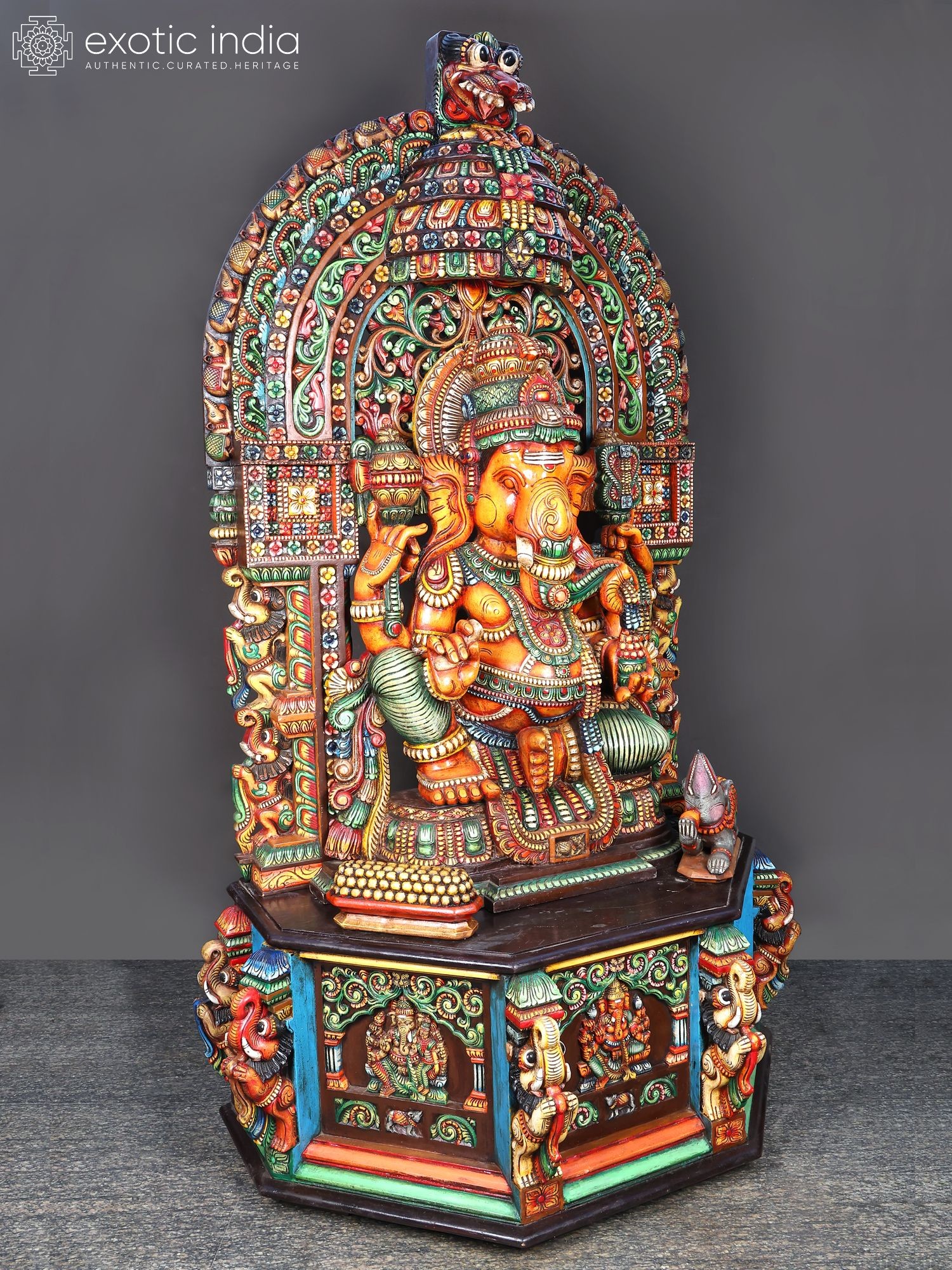 61" Large Wooden Ganesha Seated on Mouse With Kirtimukha Prabhavali