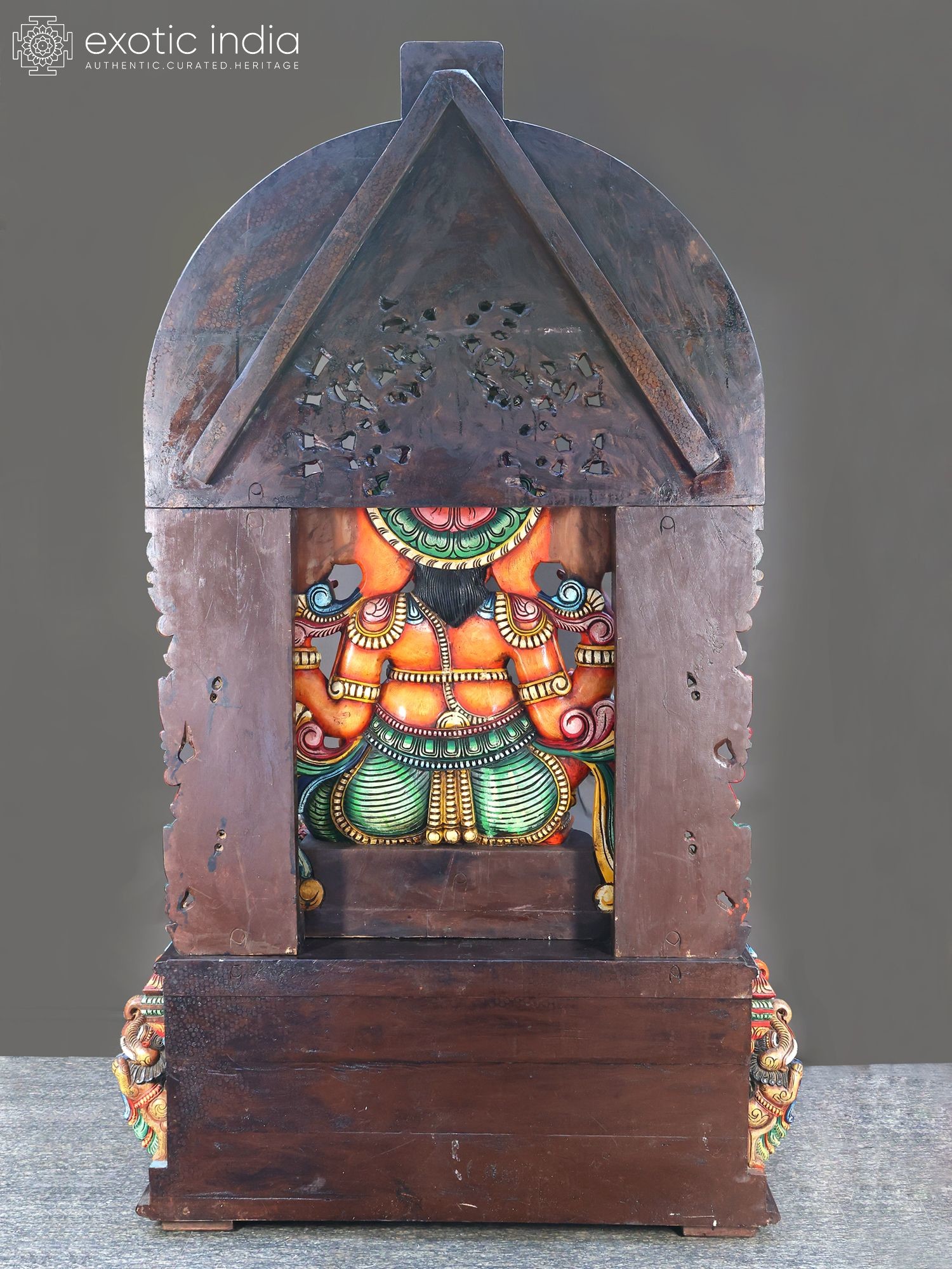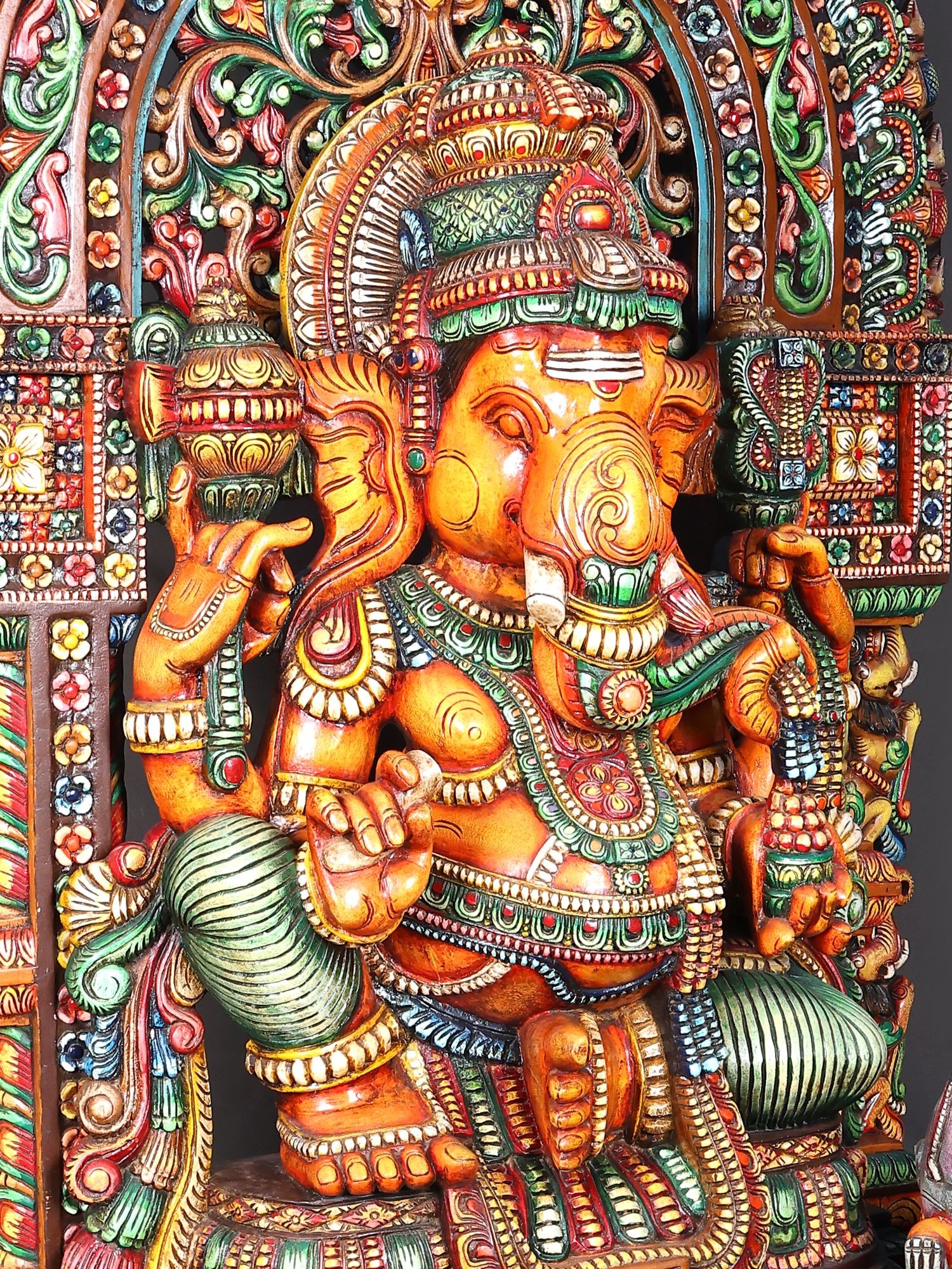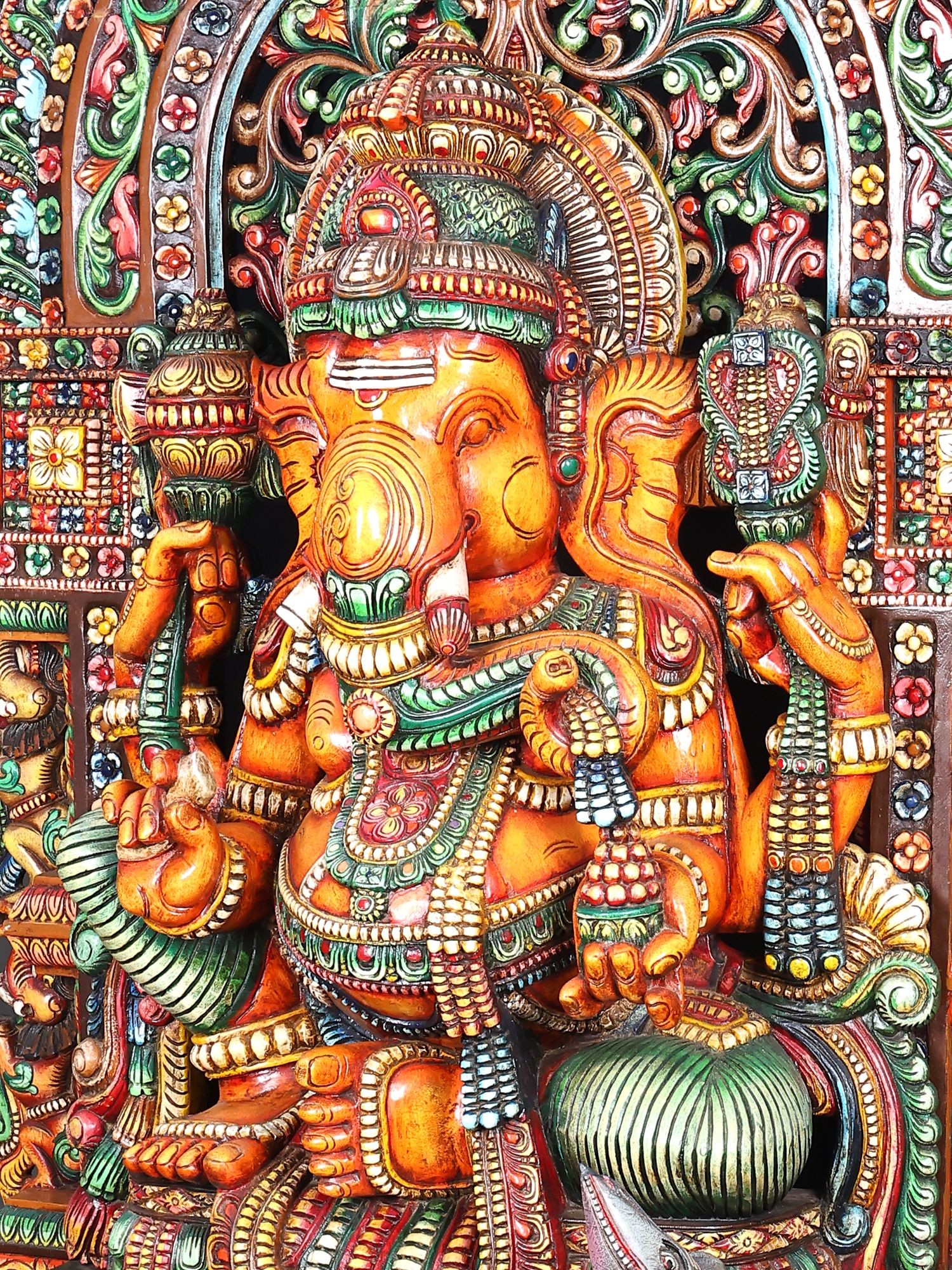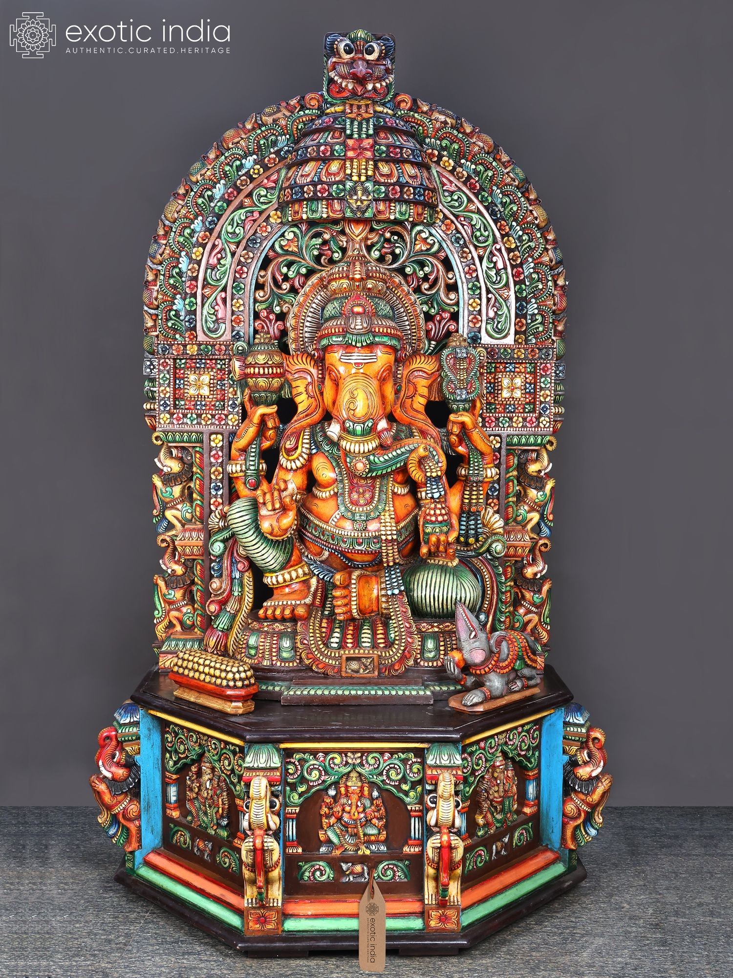 61" Large Wooden Ganesha Seated on Mouse With Kirtimukha Prabhavali