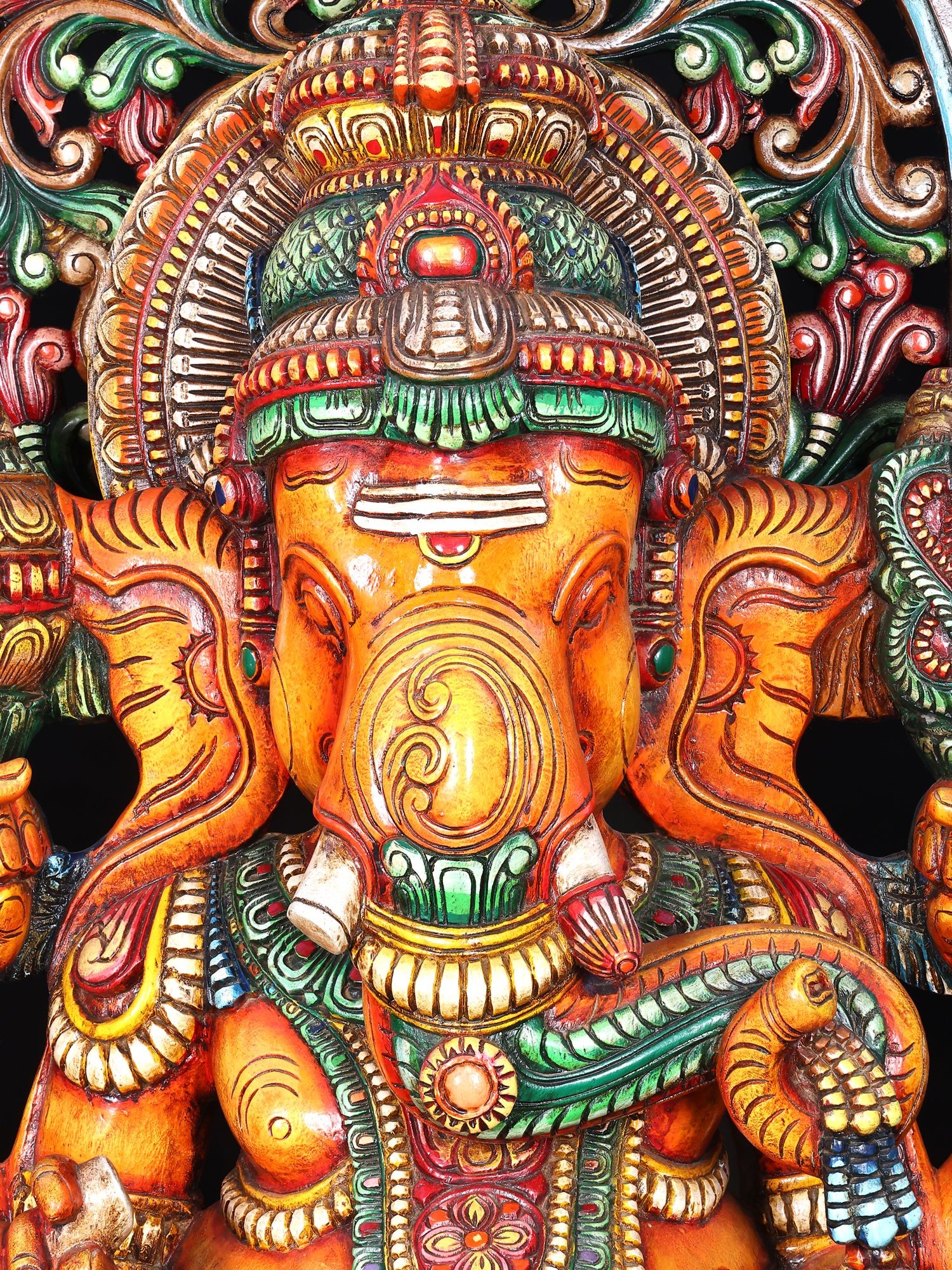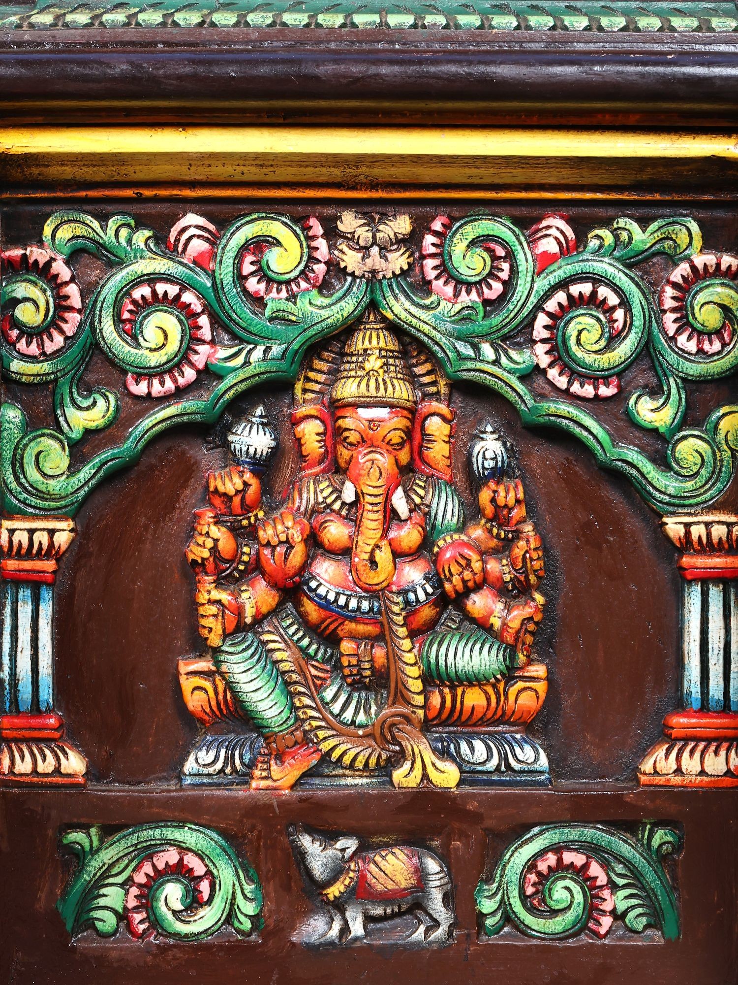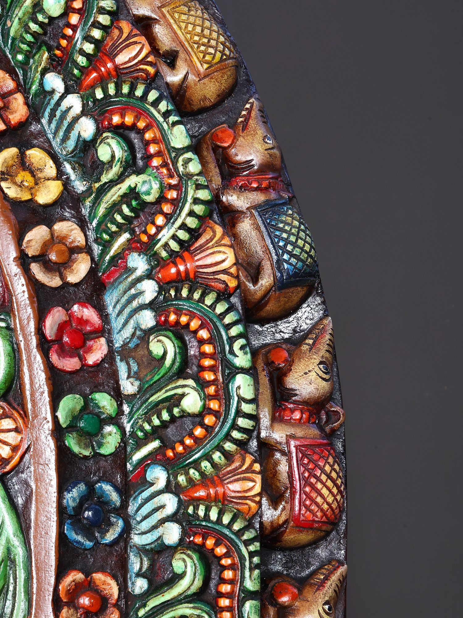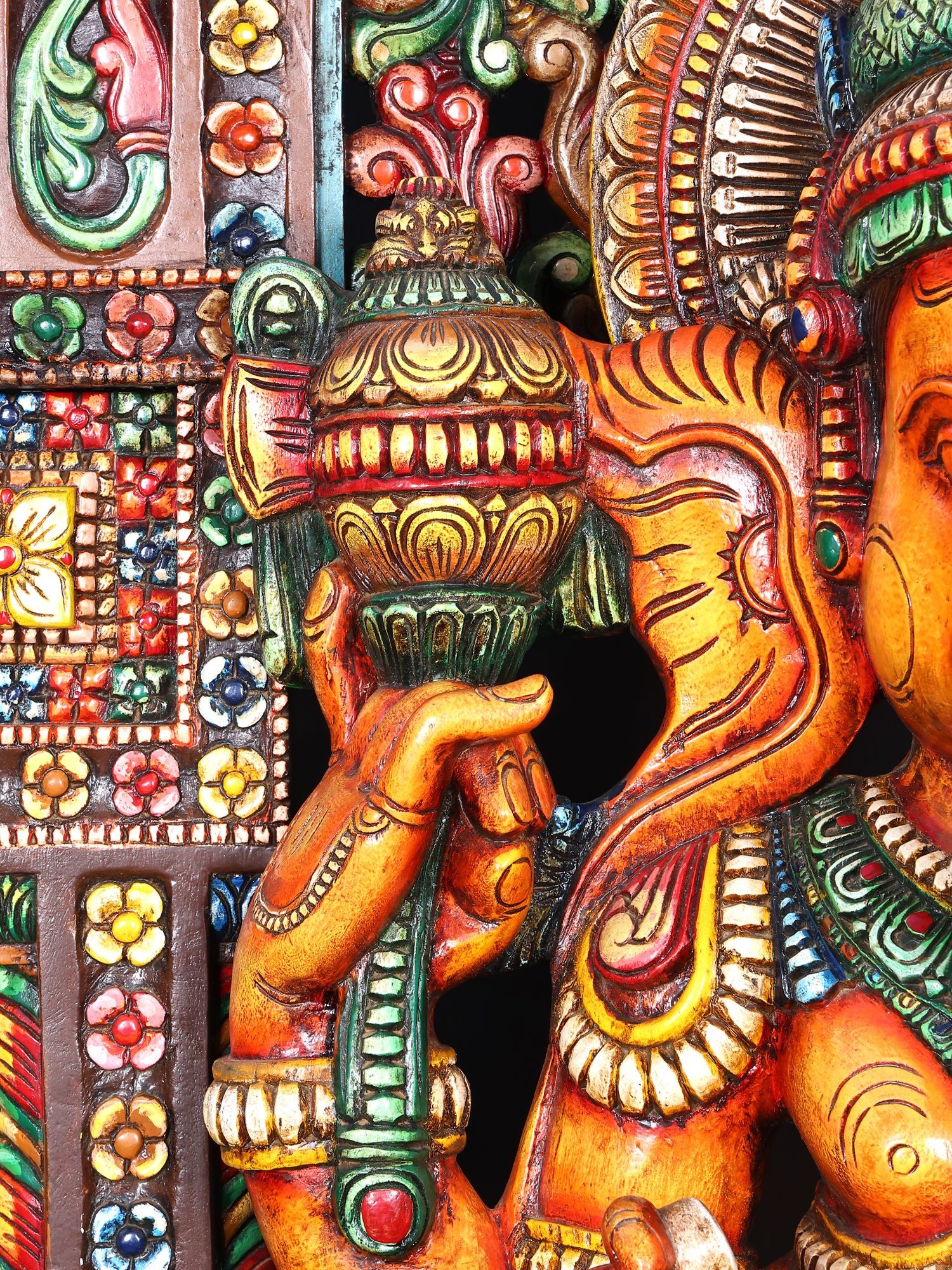 Large Ganesha Wood Carving Panel with Mouse Mount | Colorful Wall Art