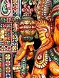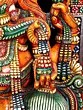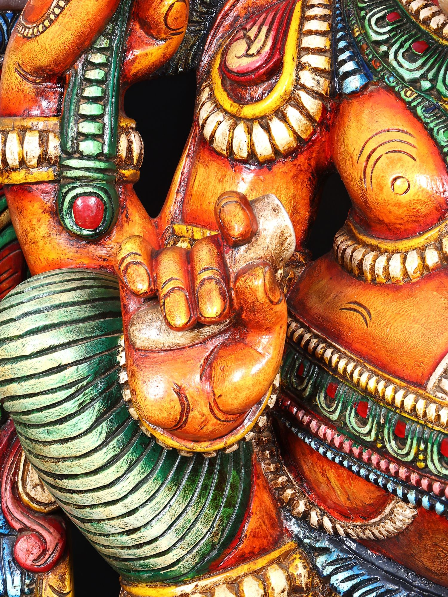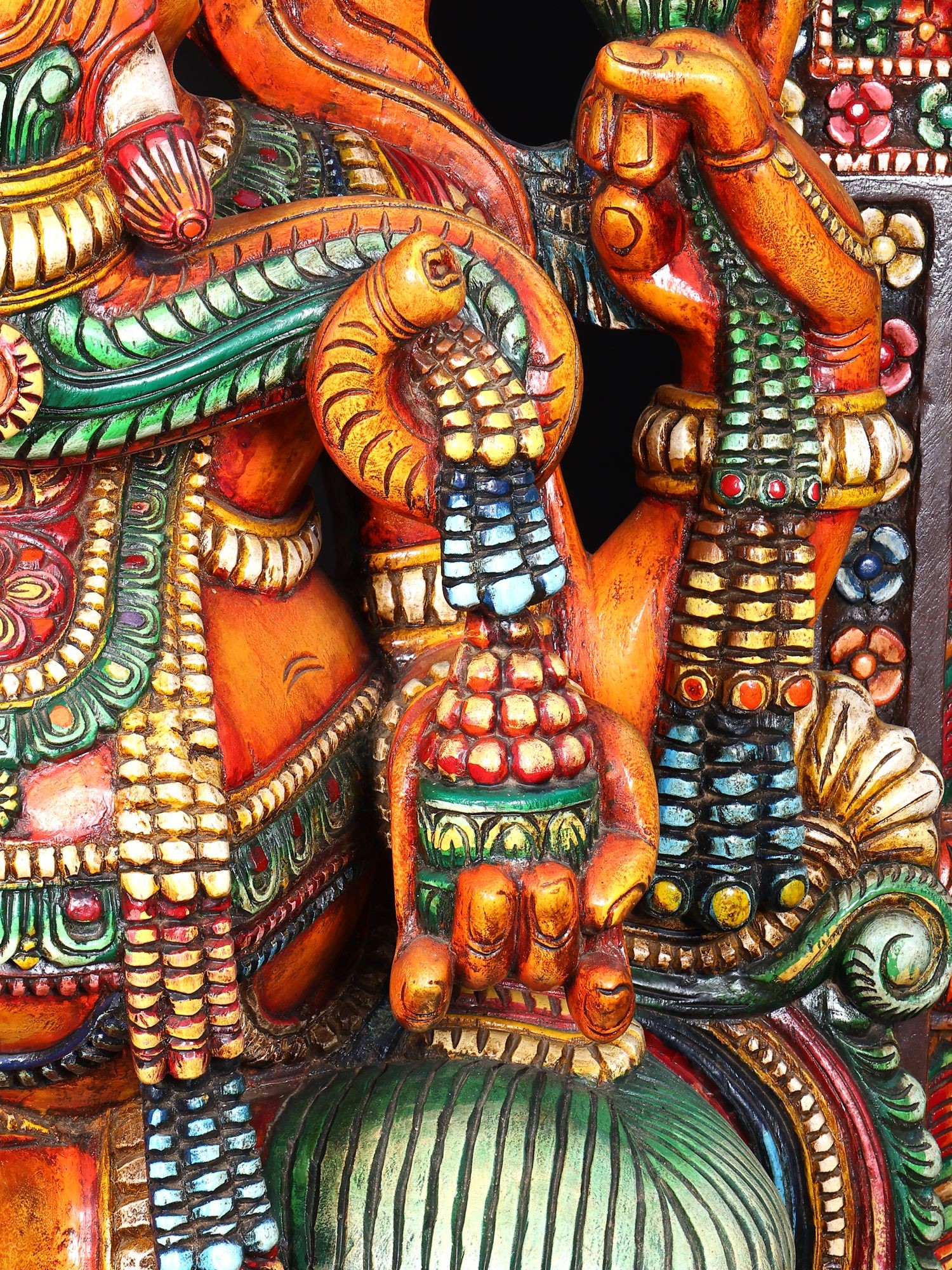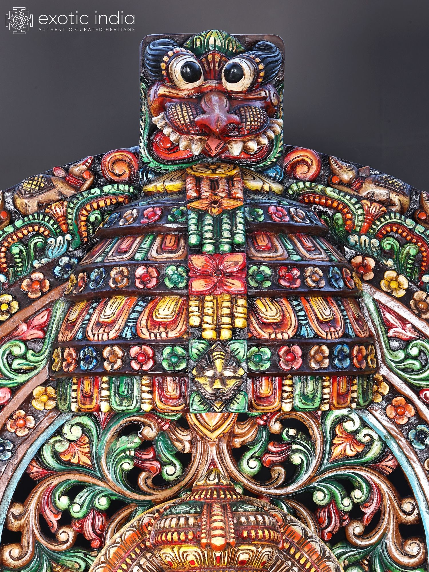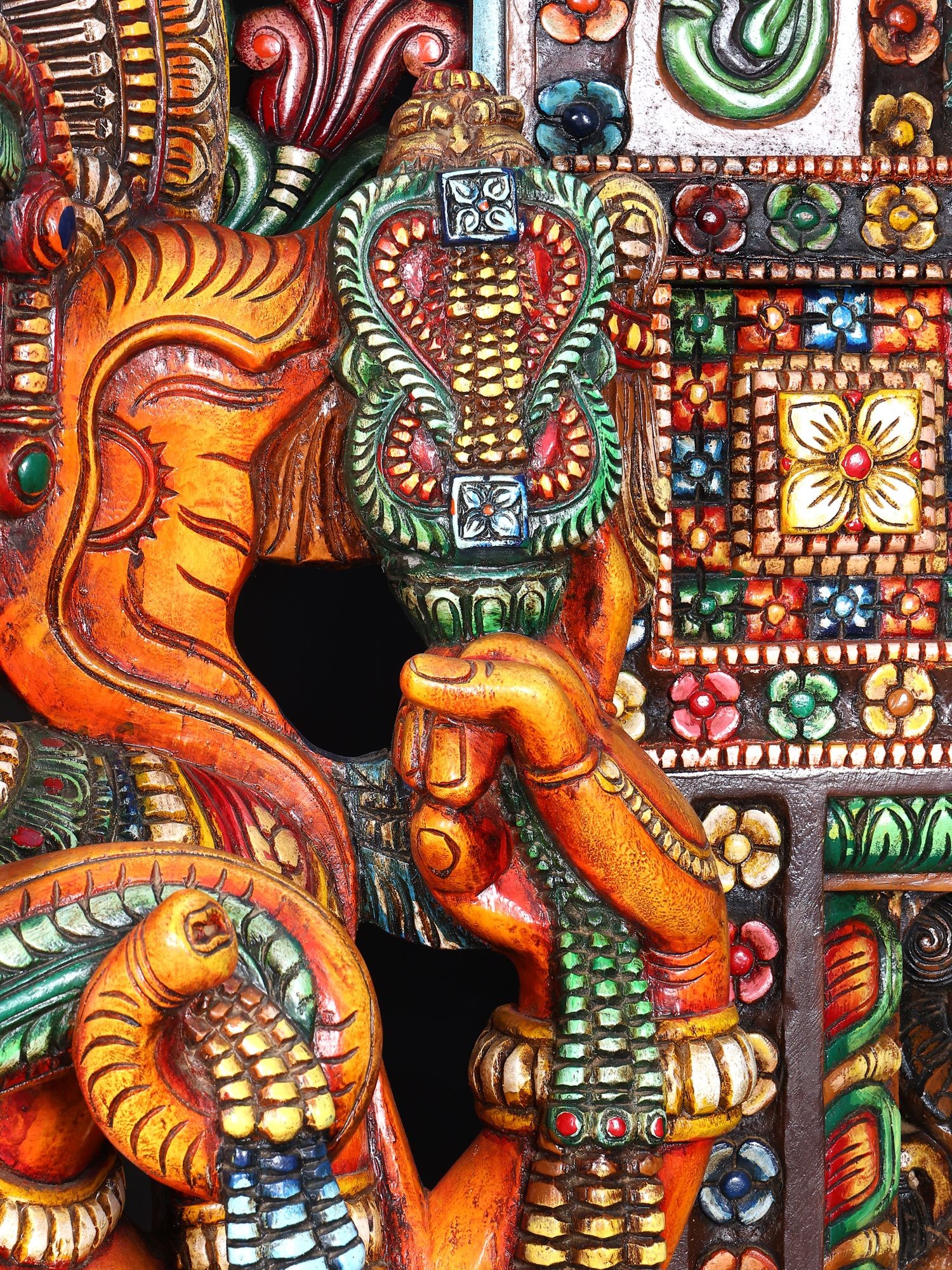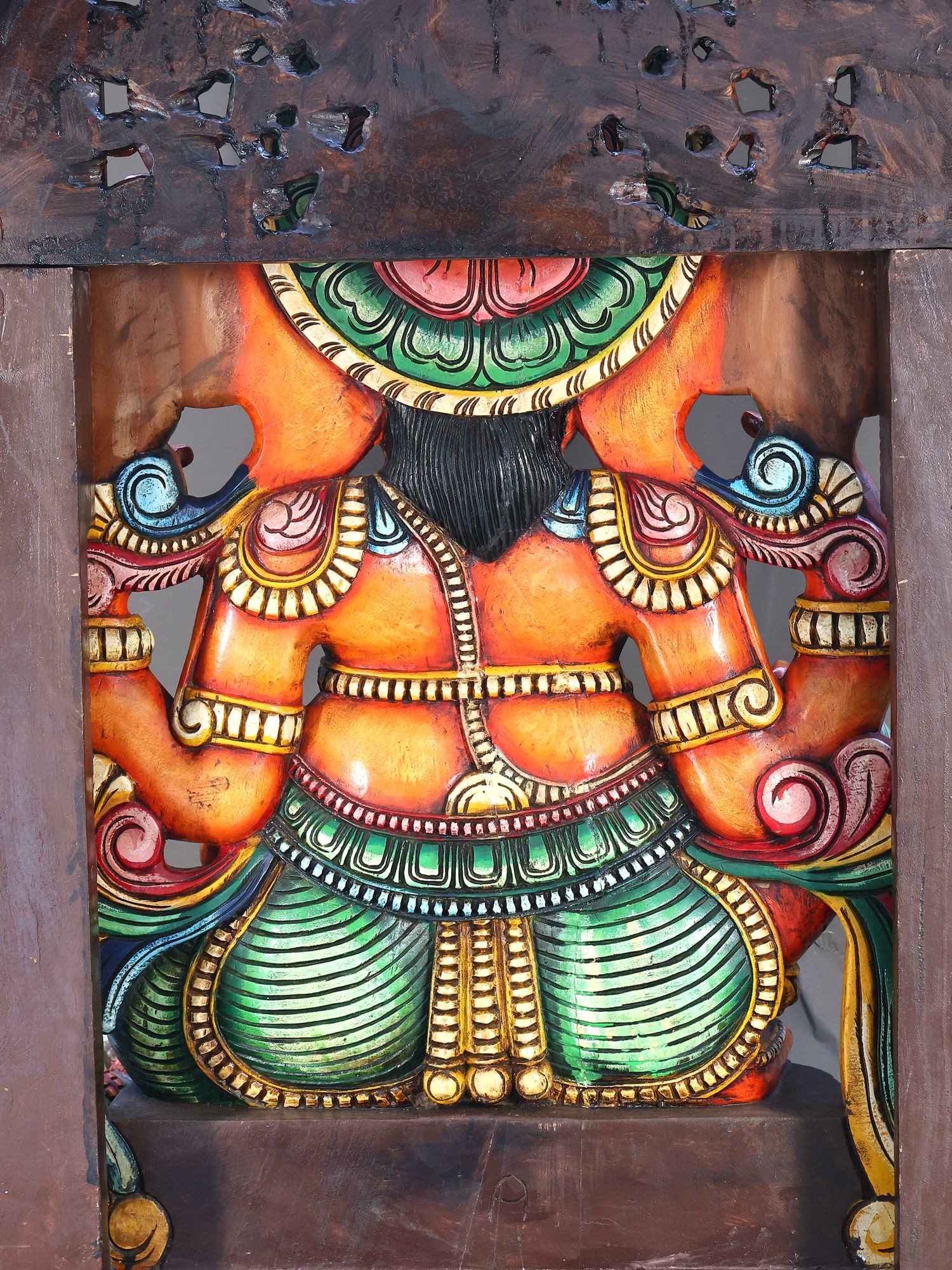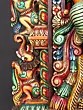 Crafted from wood with intricate carvings and vibrant, multi-colored detailing.
