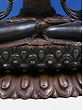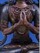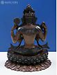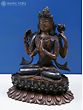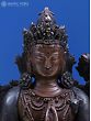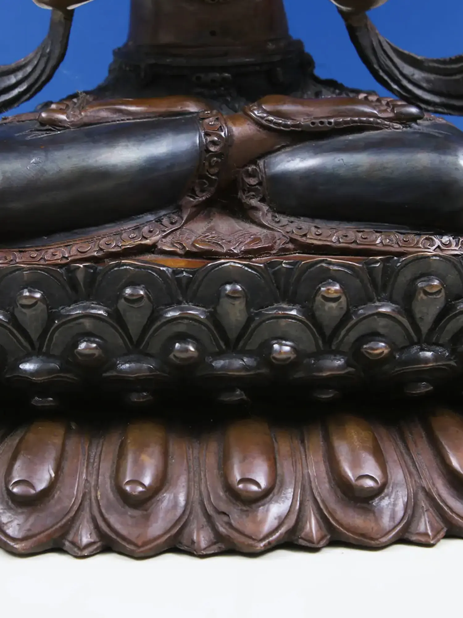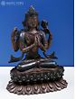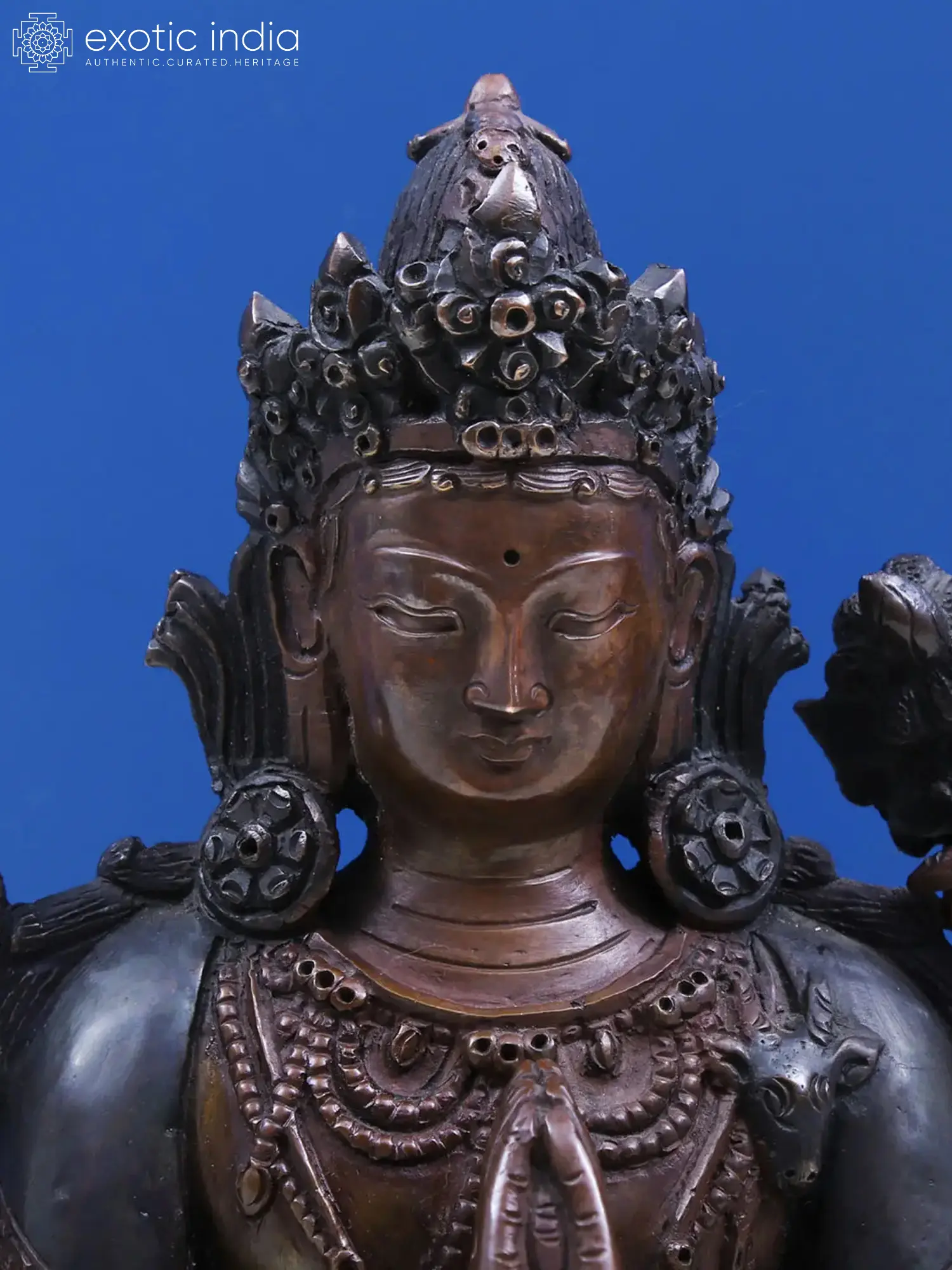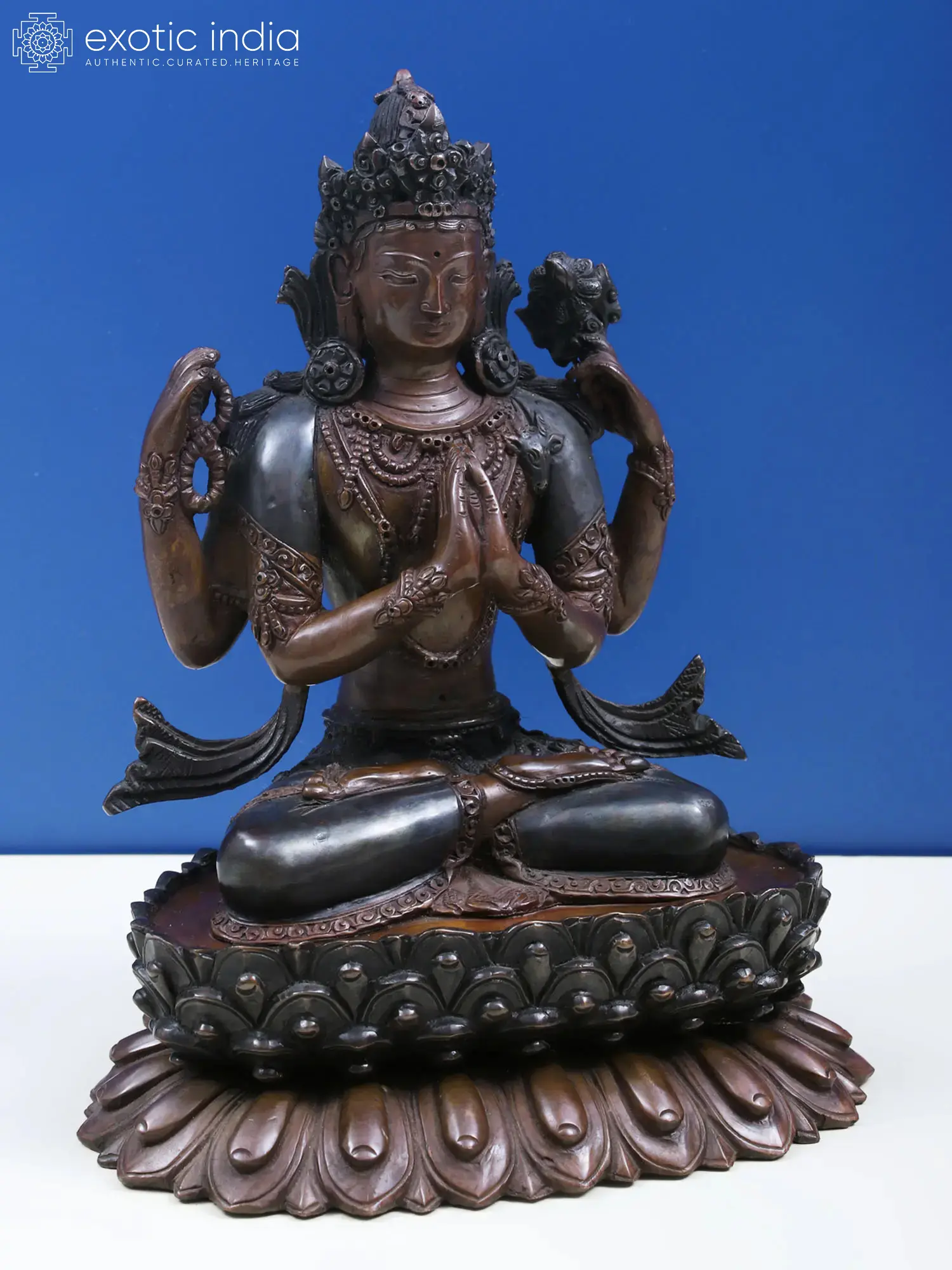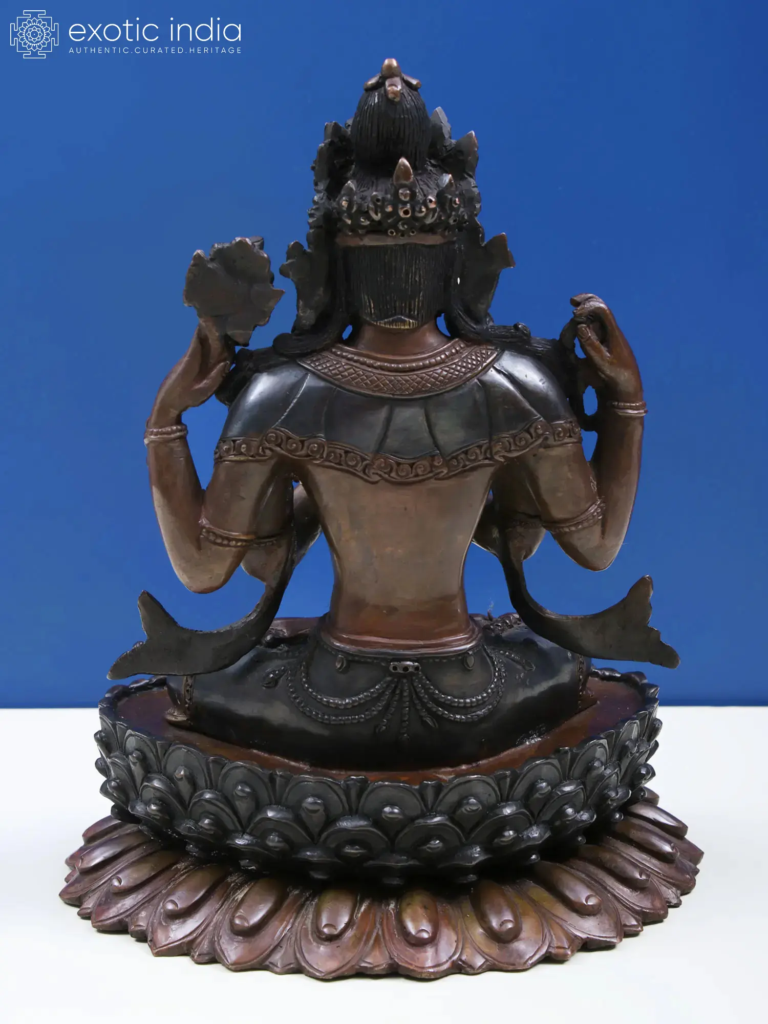 The all-powerful Bodhisattva Chenrezig appears to be meditating with a profound tranquility, in his heavenly abode in this breathtaking representation of Avalokiteshvara in the idiom of the Nepalese sculptures. His magnificent lotus throne is delineated as a symbolic version of the thousand-petalled lotus seat, the most celestial throne reserved for the higher beings in Buddhism. Chenrezig is stunningly adorned with ornaments and is wrapped in a fine dhoti, which amplifies the delicate appeal of his form. The dark tone of the composition lends it a pristine aesthetic feel, residing in which Chenrezig fills the ambiance with a sublime aura.