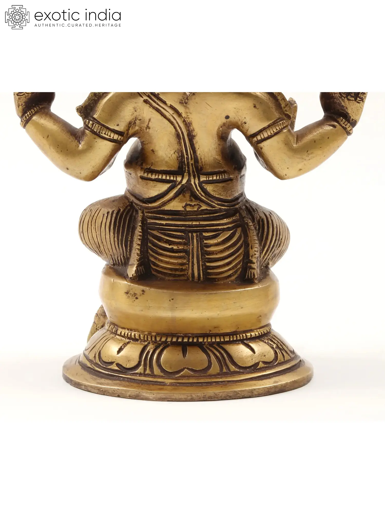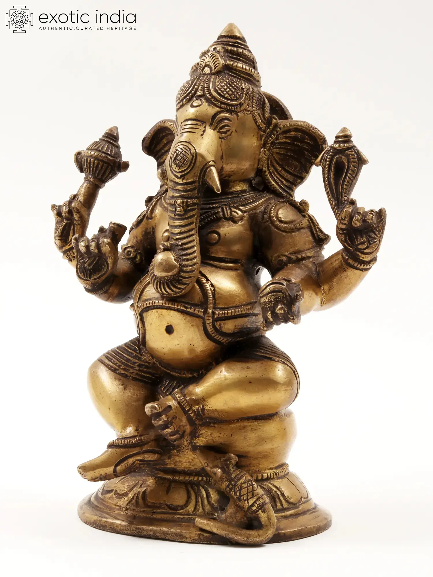 Ganesha, also known as “Vinayaka” or “Pillaiyar”, is the patron of Arts and Sciences and the deva of Wisdom and Intellect. In this brass sculpture, Ganesha is seated gracefully, radiating an enchanting aura. His upper hands hold a goad, symbolizing his ability to steer and guide his devotees on the righteous path, and a noose, signifying his power to remove obstacles. In his left hand, he cradles a Modak, a sweet treat symbolizing the rewards of devotion. The lower right hand, tightly clutching a broken tusk, reflects his wisdom and sacrifice. This artistic rendition captures the essence of Ganesha’s multifaceted persona, revered for wisdom, protection, and benevolence.