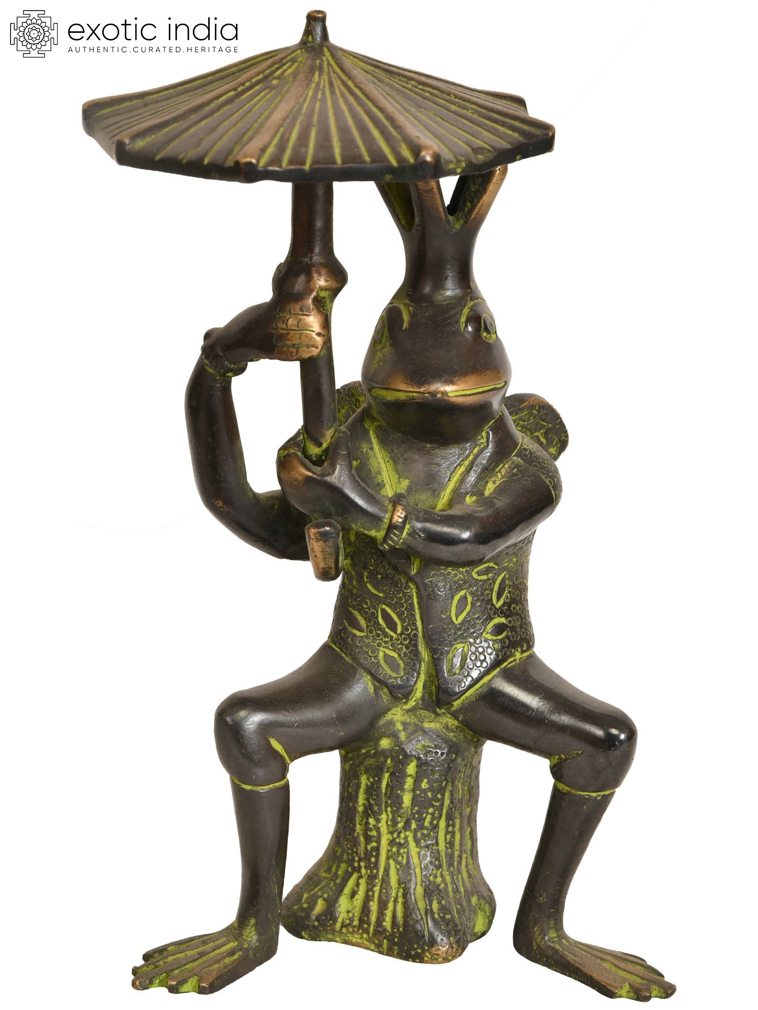 Step into a realm where folklore and craftsmanship intertwine with this captivating brass statue of a frog, poised regally beneath an umbrella. This piece is more than just a decorative item; it's a narrative sculpted in metal, evoking ancient tales and cultural symbolism. The deep, lustrous patina of the brass hints at a timeless quality, while the intricate details speak of meticulous artistry passed down through generations.
