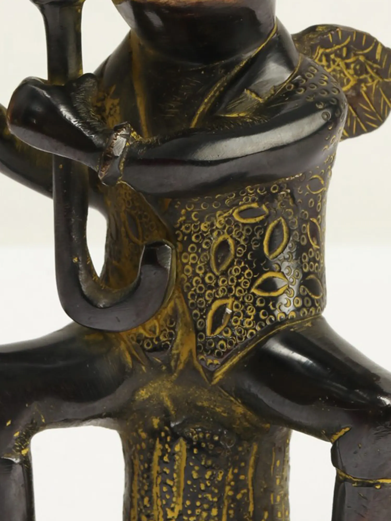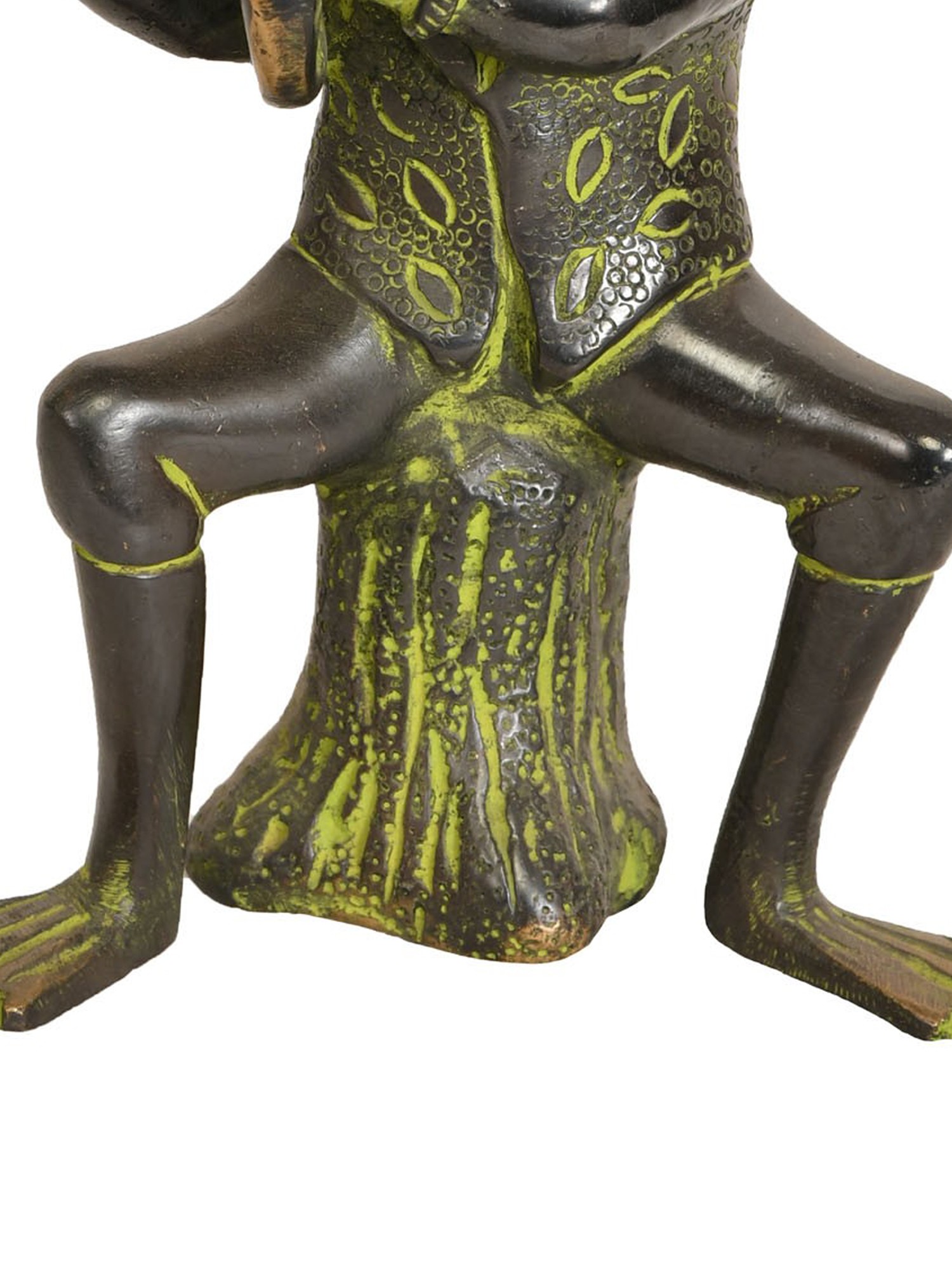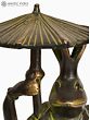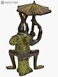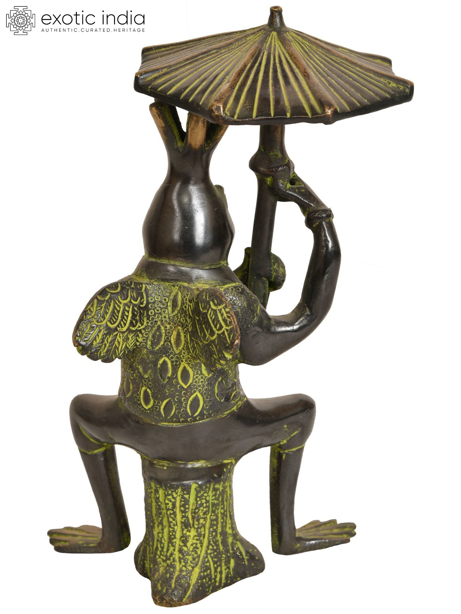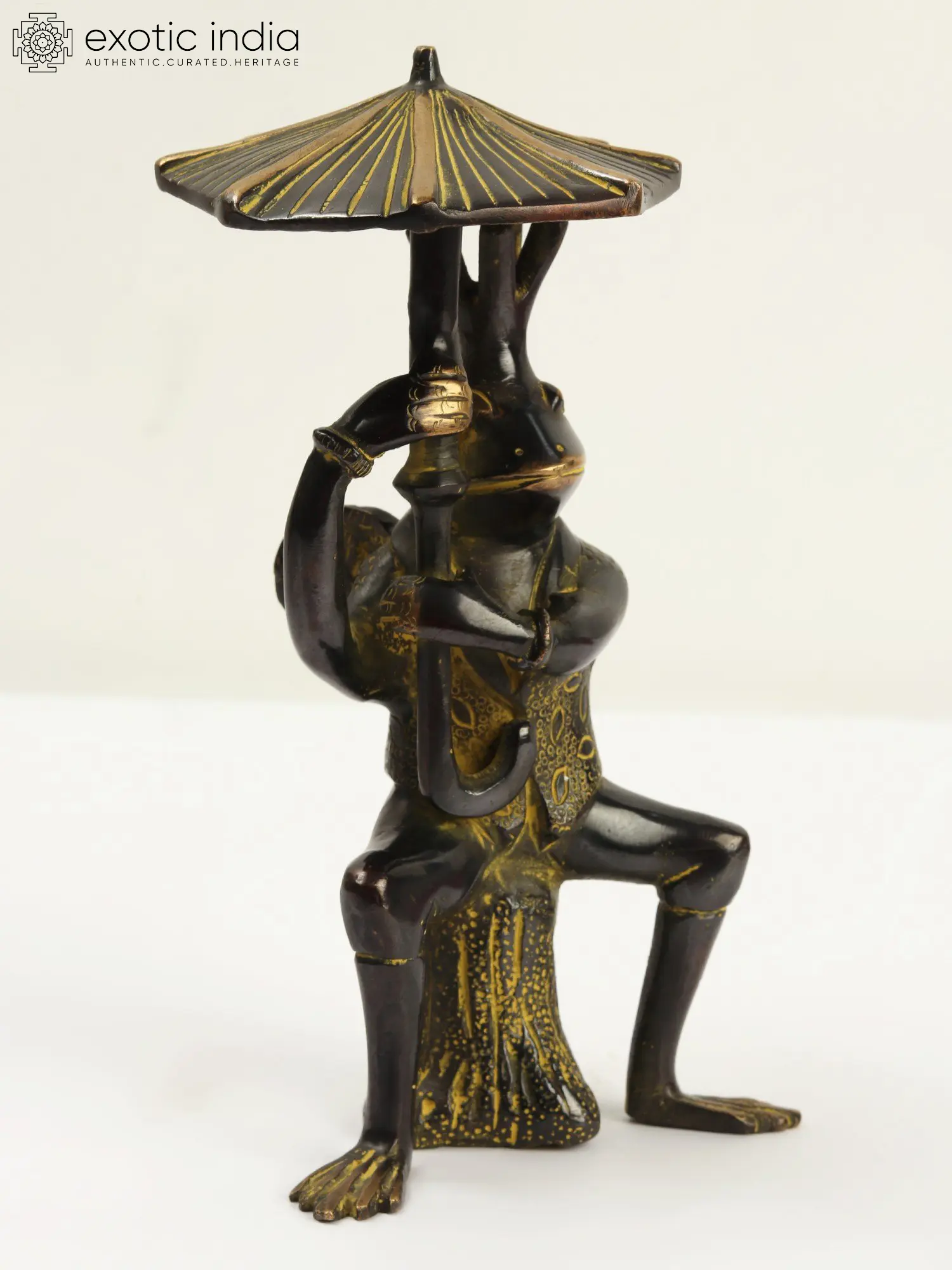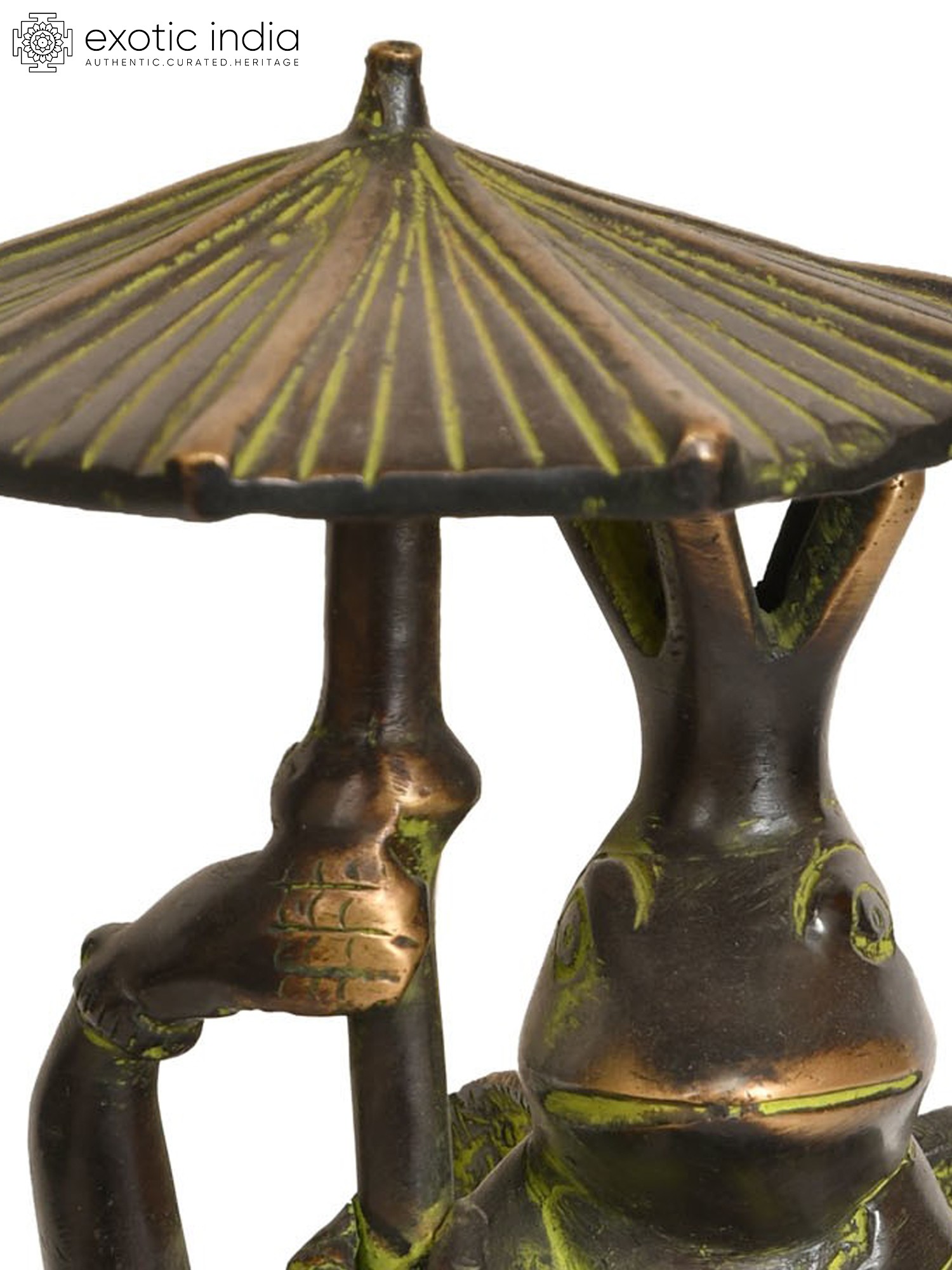 The artisan's hand is evident in every curve and contour of this statuette. The frog is depicted in a seated posture, its form expertly rendered to convey a sense of both repose and inherent power. The subtle musculature of its legs and the distinctive character of its face are brought to life through the skilled manipulation of brass. The clothing or adornment on its chest, etched with delicate patterns, adds a layer of sophistication. The umbrella itself is a marvel of design, with its radiating spokes and sturdy shaft, suggesting the immense effort and skill required to create such a delicate yet durable structure from metal. The contrast between the dark, aged brass and the highlighted golden accents draws the eye and emphasizes the exquisite detail of the work. This piece is a testament to the enduring legacy of brass casting, a craft that has adorned temples, palaces, and homes for centuries.