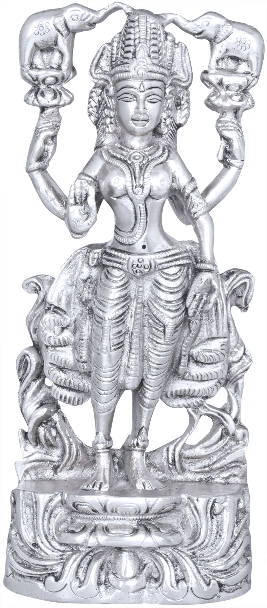 The provider of unbounded wealth, goddess Lakshmi, flanked by elephants is shown standing on a padmasana. Elephants are magnificent animals, who among other qualities are associated with royals. In the early times, kings proudly maintained elephants in the royal stables, which were used while the performance of the Rajyabhisheka or royal consecration ceremony. This brass statue highlights the deep-rooted belief that the receiver of the boons of Sri becomes a king among his fellow humans.