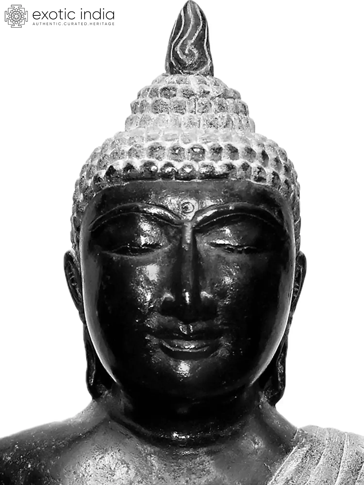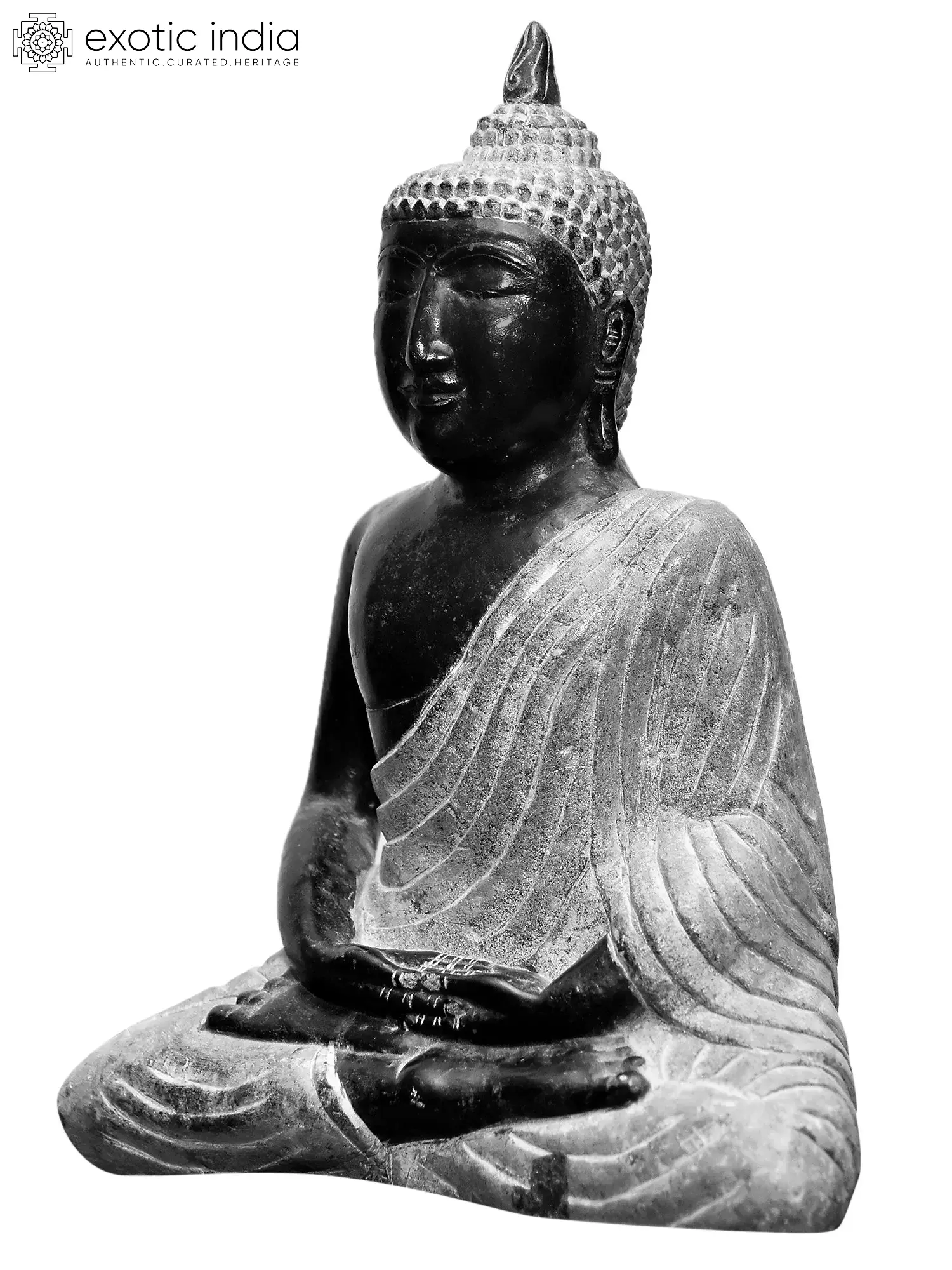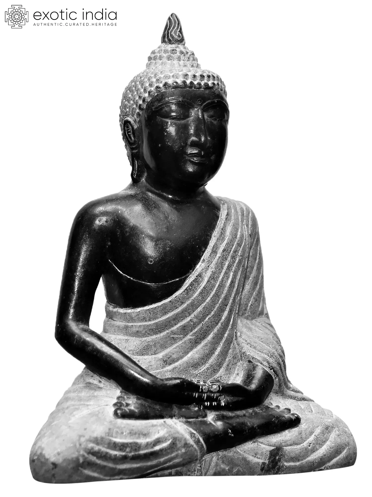 This exquisite statue captures the profound peace and enlightenment of Gautama Buddha in the Dhyana Mudra, the gesture of meditation. Carved from durable Kadappa stone, its understated grey hue lends an air of timelessness and gravitas, making it a truly captivating piece for any spiritual or decorative setting. The intricate detailing, from the serene expression on the Buddha's face to the folds of his robe, speaks volumes about the reverence and skill imbued in its creation.
