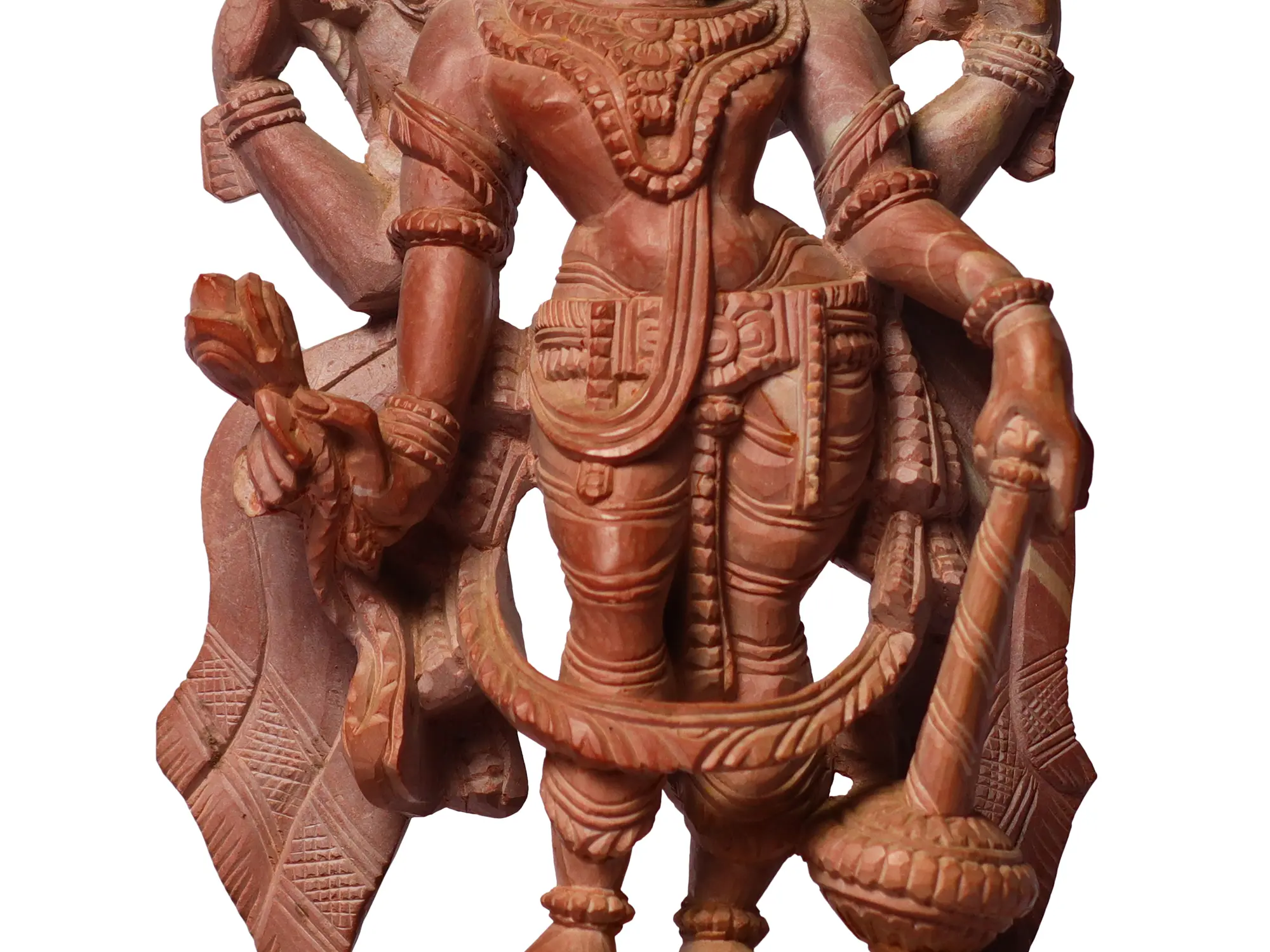 Narayan, also known as “Purushottam”, is the sustainer and preserver of the universe. Depicted as serene figure with four arms, Narayan holds a lotus (Padma), Mace (Kaumodaki), Conch (Panchajanya Shankha) and the discus (Sudarshan Chakra), symbolising the eternal preservation of the universe, maintaining cosmic balance and order. Devotees seek his blessings for guidance, protection, and spiritual enlightenment. The soft, rosy hues of the pink stone imbue the statue with an aura of serenity and grace, enhancing its aesthetic appeal. Invite the benevolent presence of Narayan into your life with this mesmerising artwork, connecting you to the eternal force that sustains the universe.