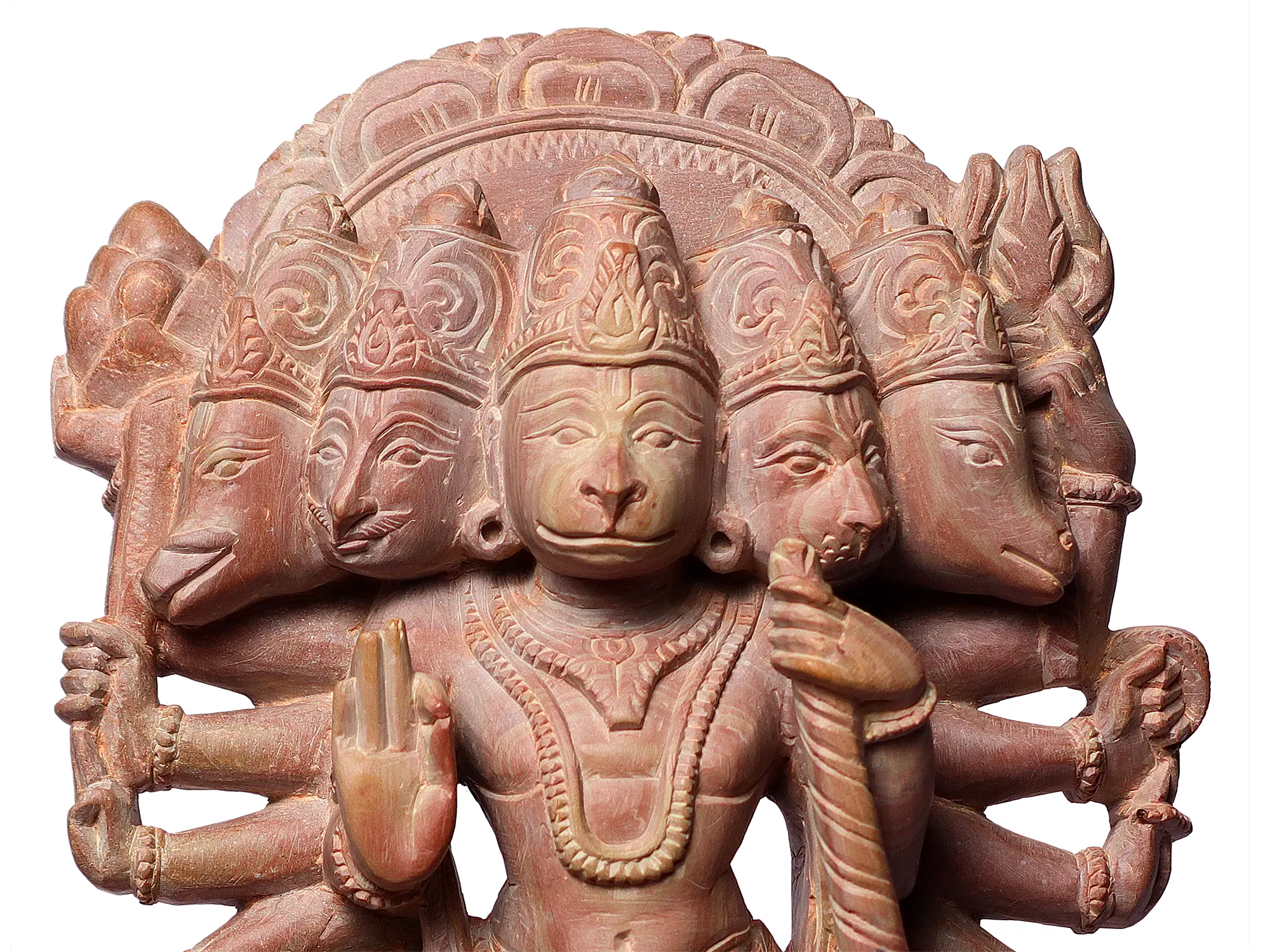 This exquisite sculpture captures the formidable and benevolent form of Panchamukhi Hanuman, a manifestation of the beloved deity revered for his immense strength, unwavering devotion, and boundless courage. Carved from fine pink stone, this piece emanates an aura of spiritual potency and artistic mastery. The intricate details showcase the artist's dedication, bringing to life the many facets of Hanuman's divine power.