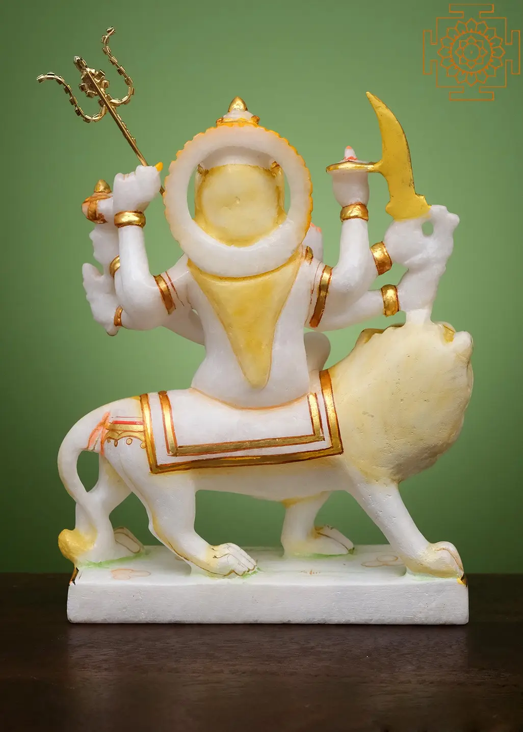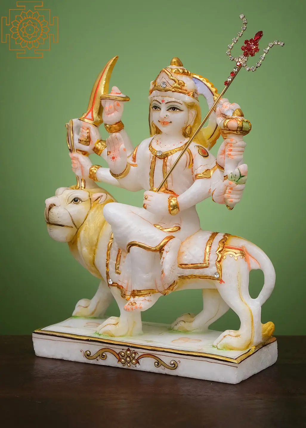 This exquisite statue captures the awe-inspiring presence of Goddess Durga, the divine mother and vanquisher of evil, as she is depicted in her most powerful form. Seated majestically upon her vahana, the mighty lion, this handmade masterpiece is crafted from pure white marble, radiating an aura of purity and spiritual grace. The intricate detailing and lustrous gold accents bring to life the divine form of the goddess, making it a captivating centerpiece for any sacred space or home altar.