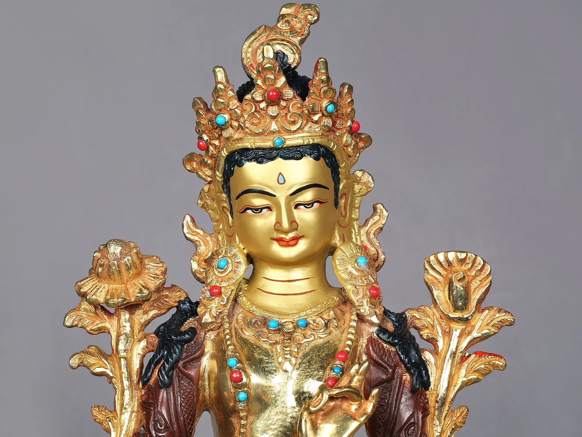 Green Tara's compassionate gaze is unwaveringly directed toward alleviating the suffering of beings. As practitioners chant her sacred mantra, "Om Tare Tuttare Ture Soha," they seek her guidance and blessings. As a Bodhisattva, Green Tara stands as an accessible and compassionate ally, offering solace and unwavering support on the intricate journey toward enlightenment.