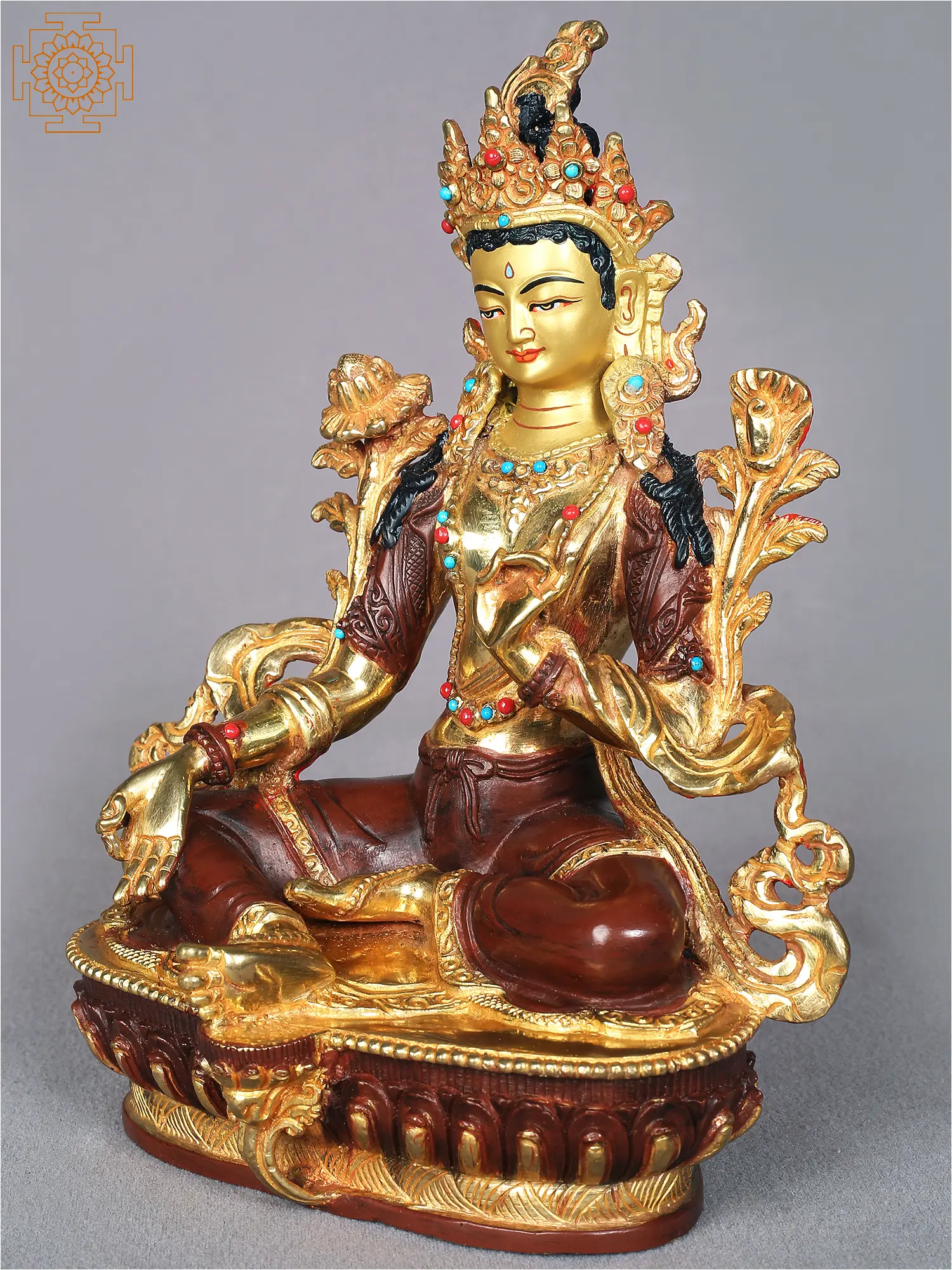 Enter the realm of Green Tara, a revered feminine figure in Tibetan Buddhism who exudes kindness, defence, and promptness. Imagine Green Tara with her alluring emerald-green aura, sitting elegantly in a position that radiates comfort and a willingness to serve all living things. Her left hand holds the protective gesture (abhaya mudra) with grace, representing bravery, while her right hand is extended in the gesture of ultimate generosity (varada mudra), signifying a readiness to provide blessings and support. Maybe she has a calm blue lotus in her left palm, which stands for purity.