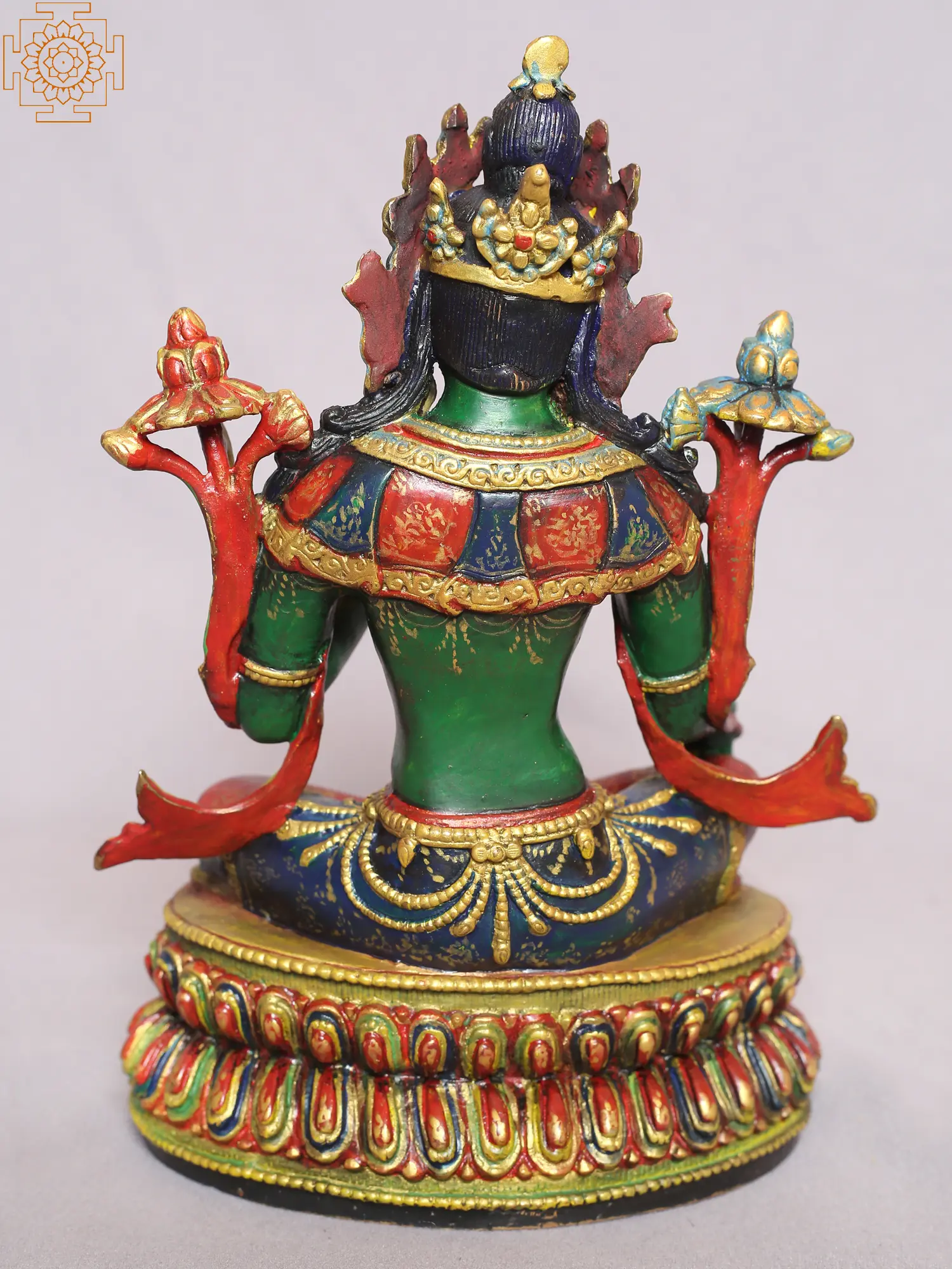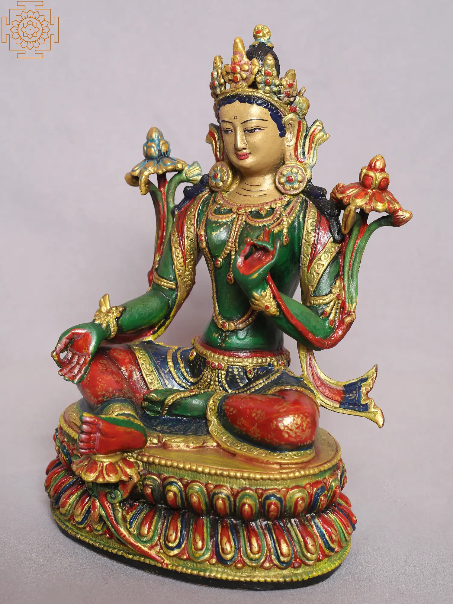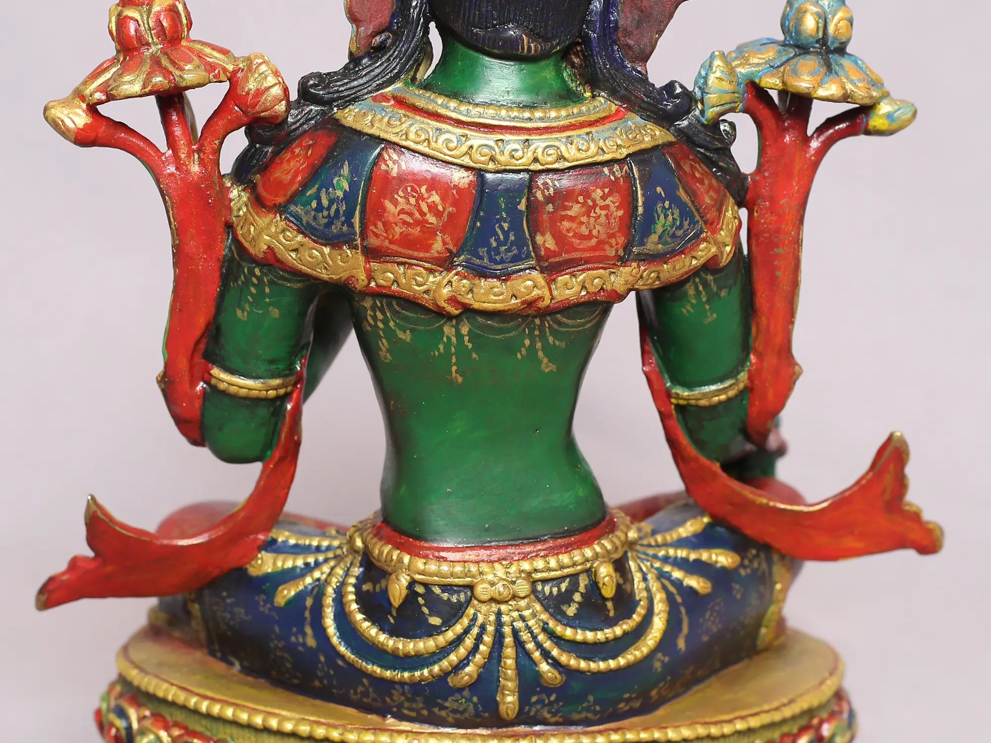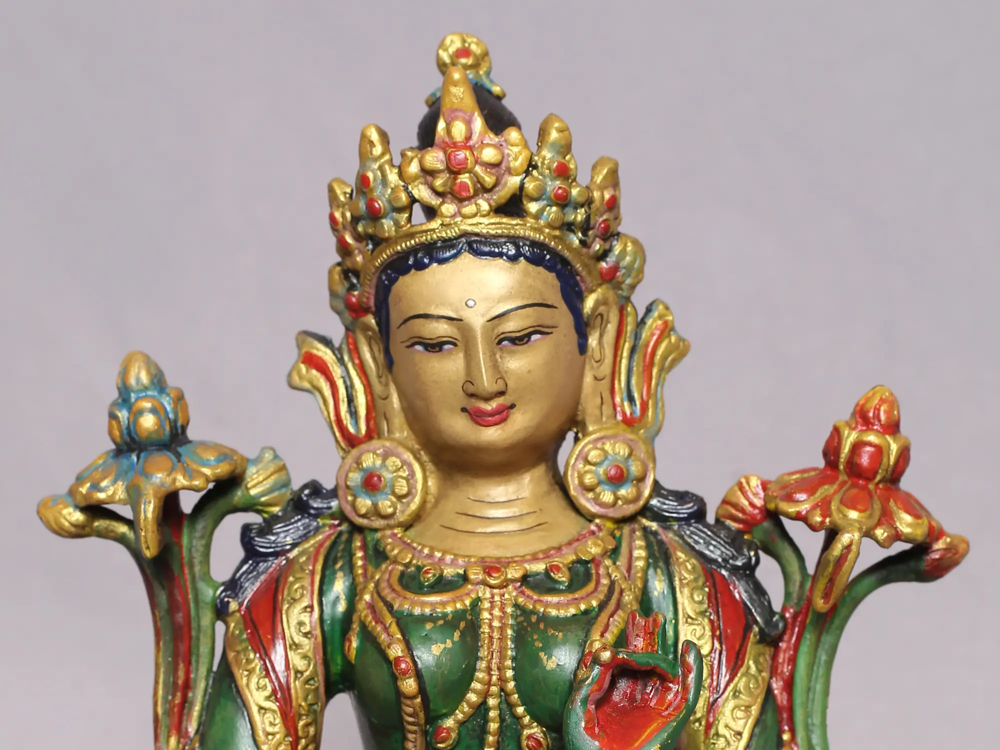 Green Tara, also known as Arya Tara, is a highly revered bodhisattva in Mahayana Buddhism, especially in Tibetan Buddhism. She embodies the traits of wise action, safety, and prompt aid, and is seen as a sympathetic person. Green Tara is often seen sitting with one leg extended, ready to stand and help those in need. Her right hand is making the wish-granting gesture (varada mudra), and her left hand is gripping the stem of a lotus flower, which supports an open blossom. The lotus bloom contains a little image of Amitabha, connecting Green Tara and the Buddha of Infinite Light.