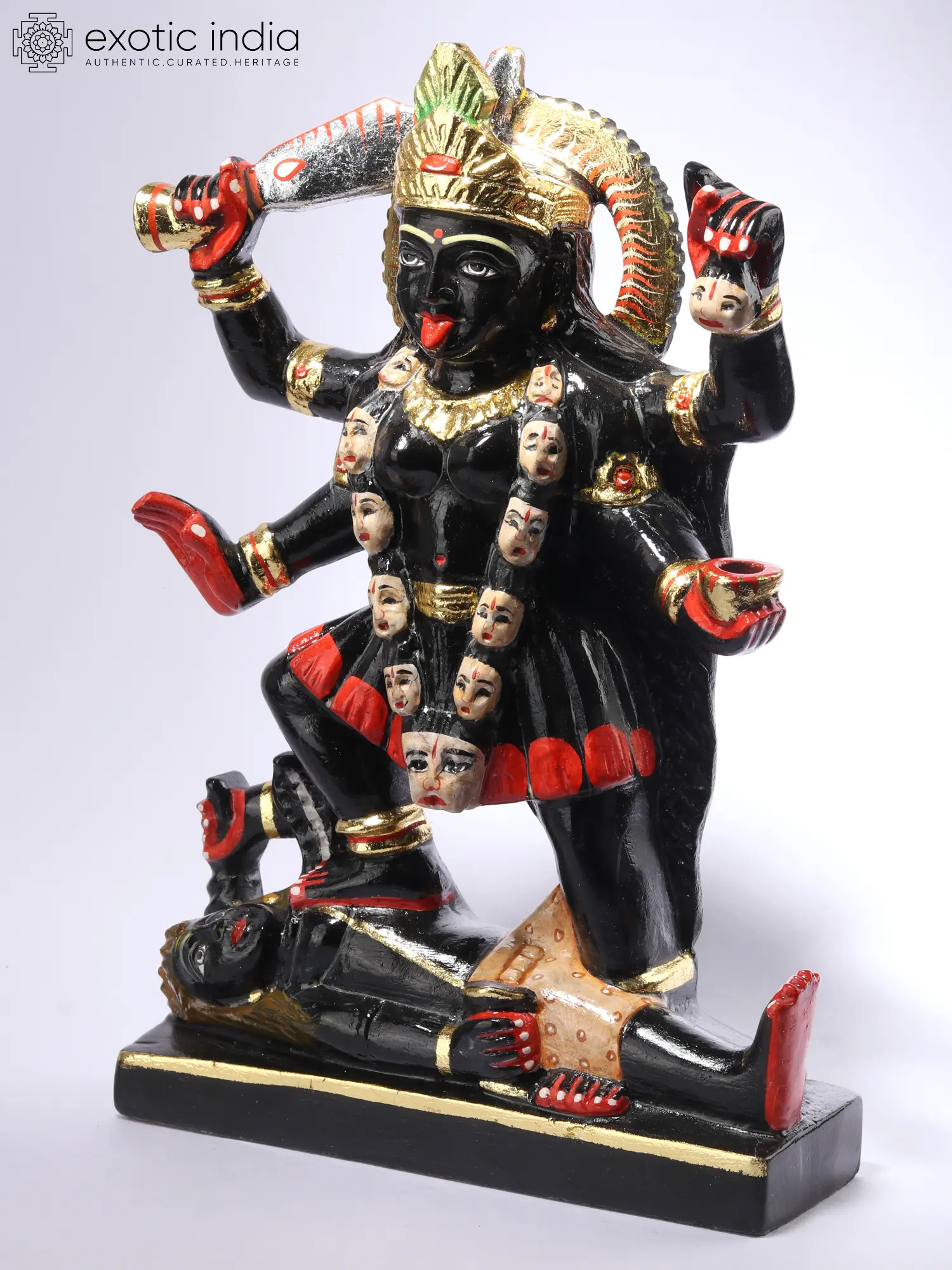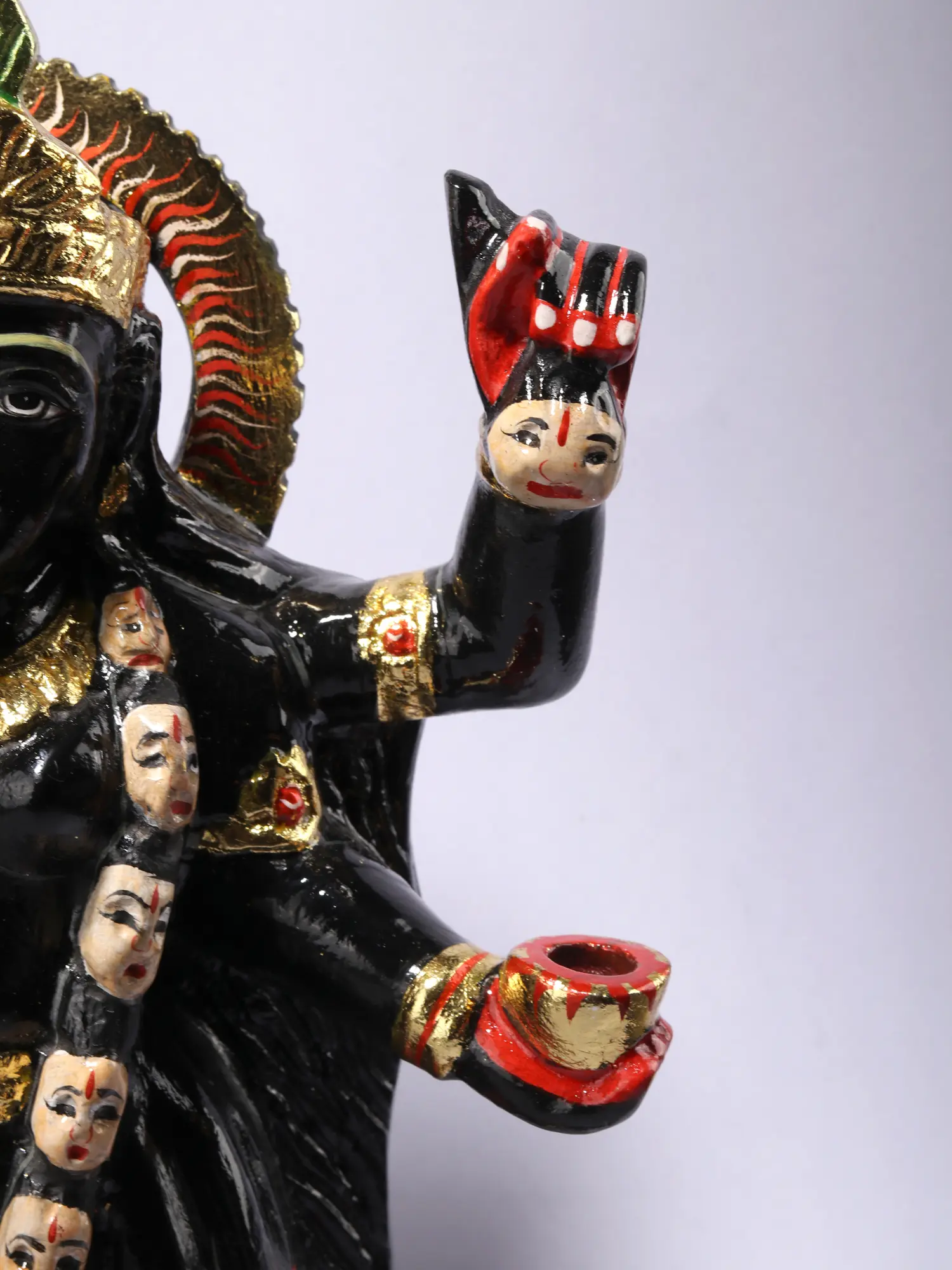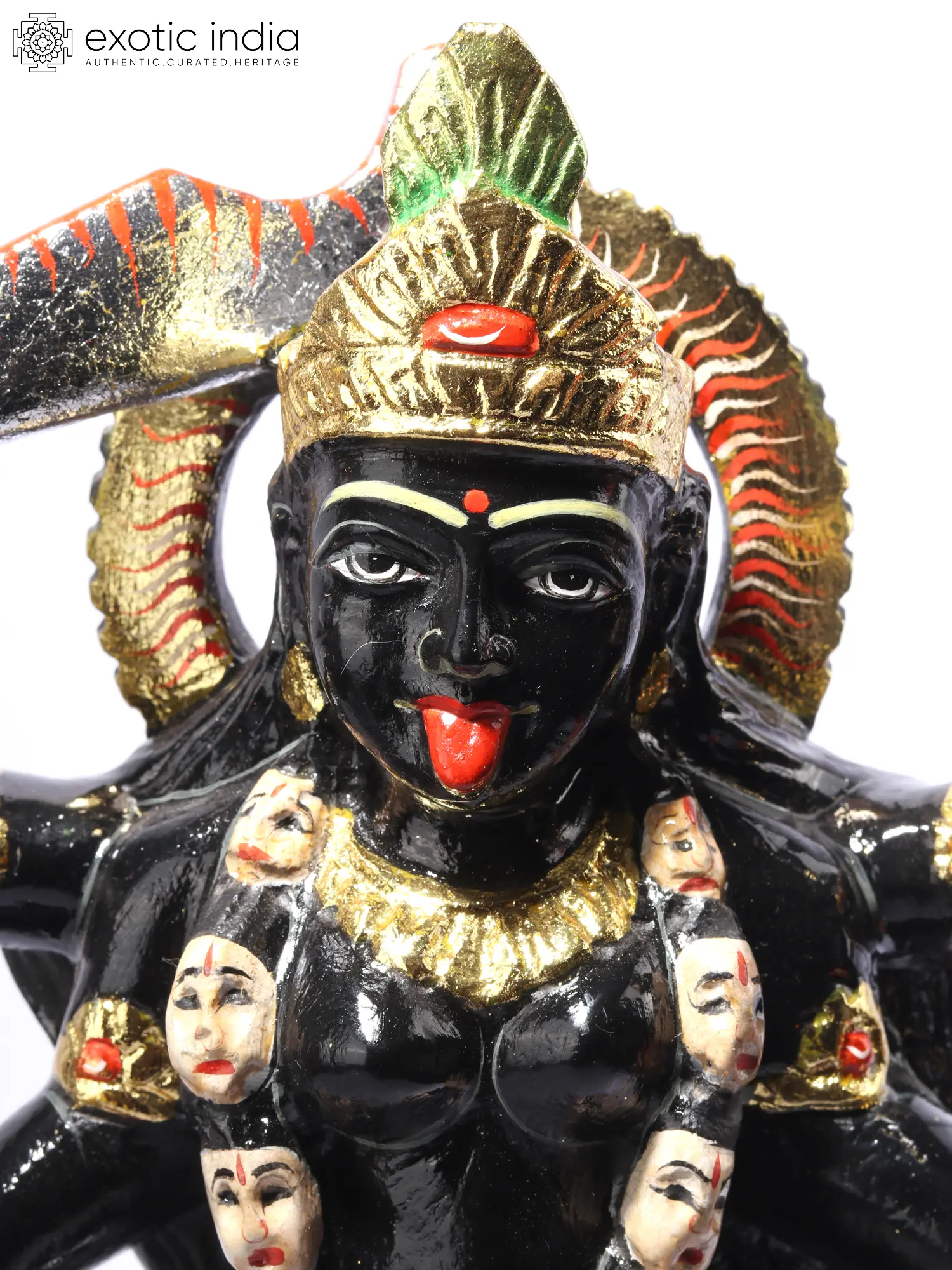 This handmade statue is a testament to the skill and devotion of the artisans who have brought this divine form to life. The detailed carving and meticulous finishing highlight the multifaceted nature of Goddess Kali. The dynamic posture, the fierce yet compassionate expression, and the rich ornamentation, including the gold accents and painted details, all contribute to the palpable energy emanating from the piece. The black marble itself lends a unique gravitas and a cool, polished texture, inviting contemplation and reverence. This murti is not merely a decorative object but a powerful conduit for invoking the blessings and protective energies of the Divine Mother, a focal point for meditation, and a reminder of the ultimate victory of good over evil and of spiritual awakening over worldly attachments. It serves as a powerful symbol of transformation, courage, and the relentless pursuit of truth.
