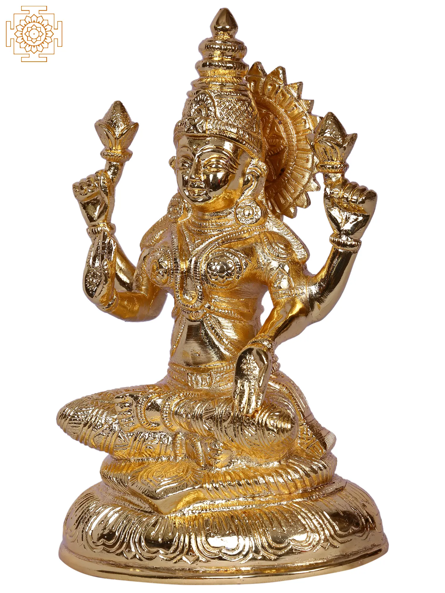 Goddess Lakshmi is one of the most widely worshipped deities in Hinduism, her presence invoked during festivals like Diwali, the festival of lights, where her blessings are sought for a prosperous year ahead. She is often depicted with lotus flowers, symbols of purity and spiritual awakening, and coins flowing from her hand, representing material wealth. In this particular portrayal, the Goddess is shown with four arms, each holding a lotus bud, and her posture is one of calm composure, bestowing blessings with her raised hand. The radiant halo behind her head signifies her divine brilliance and luminous nature, illuminating the path to success and fulfillment.