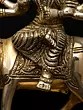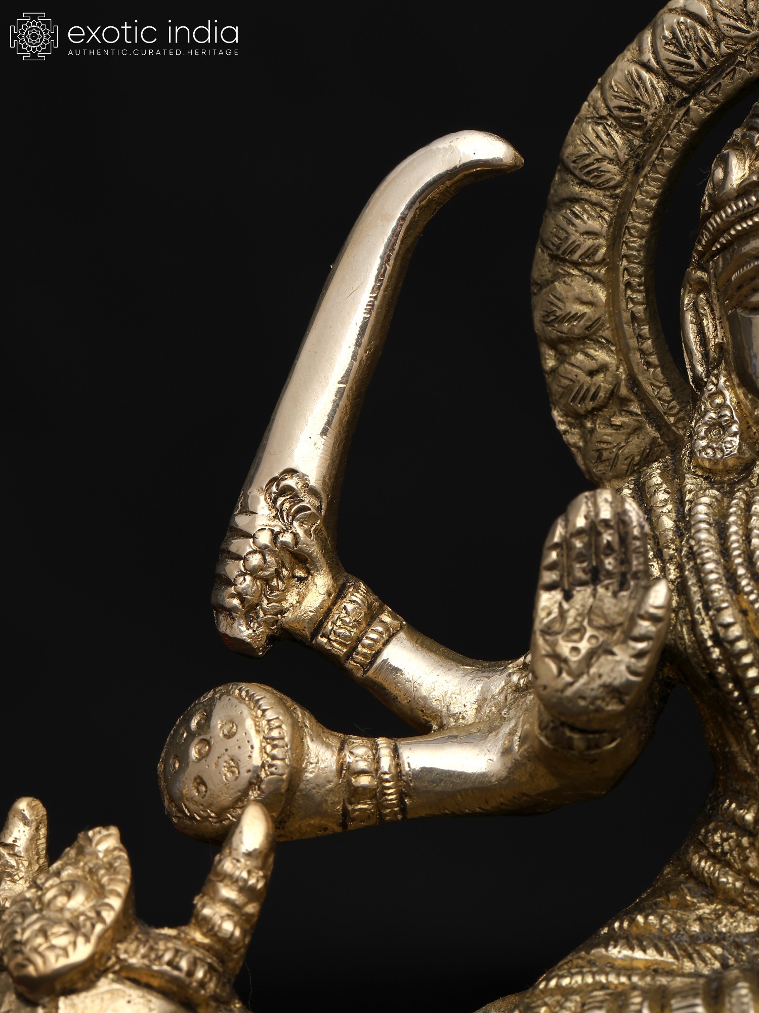 This exquisite brass statue captures the divine presence of Goddess Umiya, a revered deity in Hinduism, seated majestically upon her vahana, the sacred cow. Crafted with meticulous detail and imbued with spiritual significance, this eight-inch masterpiece is a testament to the enduring artistry of Indian metalwork. The warm, lustrous glow of the brass enhances the divine aura of the sculpture, making it a captivating centerpiece for any sacred space or collection. The Goddess herself is depicted with multiple arms, each holding symbolic objects that signify her power and benevolent nature. Her serene facial expression, adorned with intricate jewelry and a majestic crown, radiates tranquility and divine grace. The flowing garments and divine ornaments are rendered with remarkable precision, showcasing the skill of the artisans. The cow, often referred to as Kamadhenu, the wish-fulfilling divine bovine, is depicted with quiet dignity and strength, its form conveying a sense of peace and abundance. The elaborate saddle and trappings suggest the divine status and reverence afforded to this sacred creature. The worship of Goddess Umiya is particularly prevalent in the Gujarat region of India, where she is considered a form of the supreme Goddess Shakti. Her association with the cow highlights her nurturing aspect, as the cow is revered as a symbol of life, sustenance, and motherhood. In Hindu mythology, the cow is a giver of milk, which is considered sacred and used in numerous rituals and offerings. By being depicted seated upon the cow, Goddess Umiya embodies the interconnectedness of divine power and earthly nourishment. Her form also calls to mind other powerful female deities who ride formidable mounts, such as Durga on her lion or Lakshmi on her owl, emphasizing the strength and authority associated with the feminine divine. The choice of brass as the medium for this statue is significant. Brass, an alloy of copper and zinc, has been used for centuries in India to create religious idols and decorative items. It is believed to possess auspicious qualities and is known for its durability and ability to hold intricate details. The natural patina that develops over time with brass adds to its character and perceived sacredness, making each piece unique. This statue serves not only as a beautiful decorative object but also as a profound symbol of devotion, strength, and the auspicious blessings of the divine mother.
