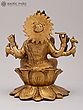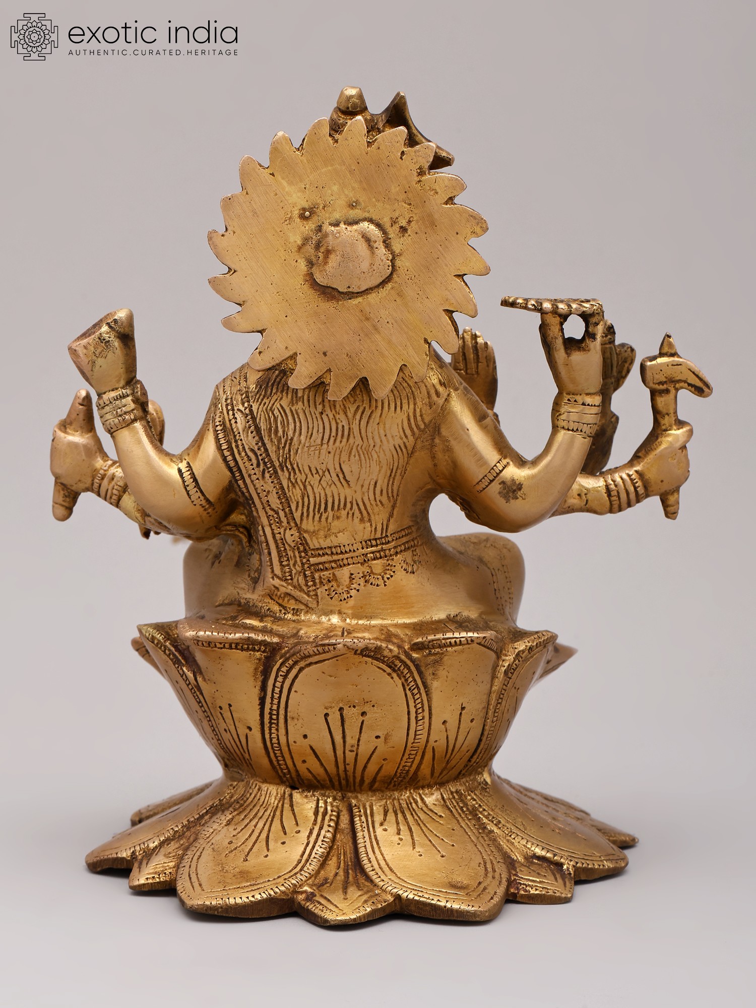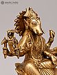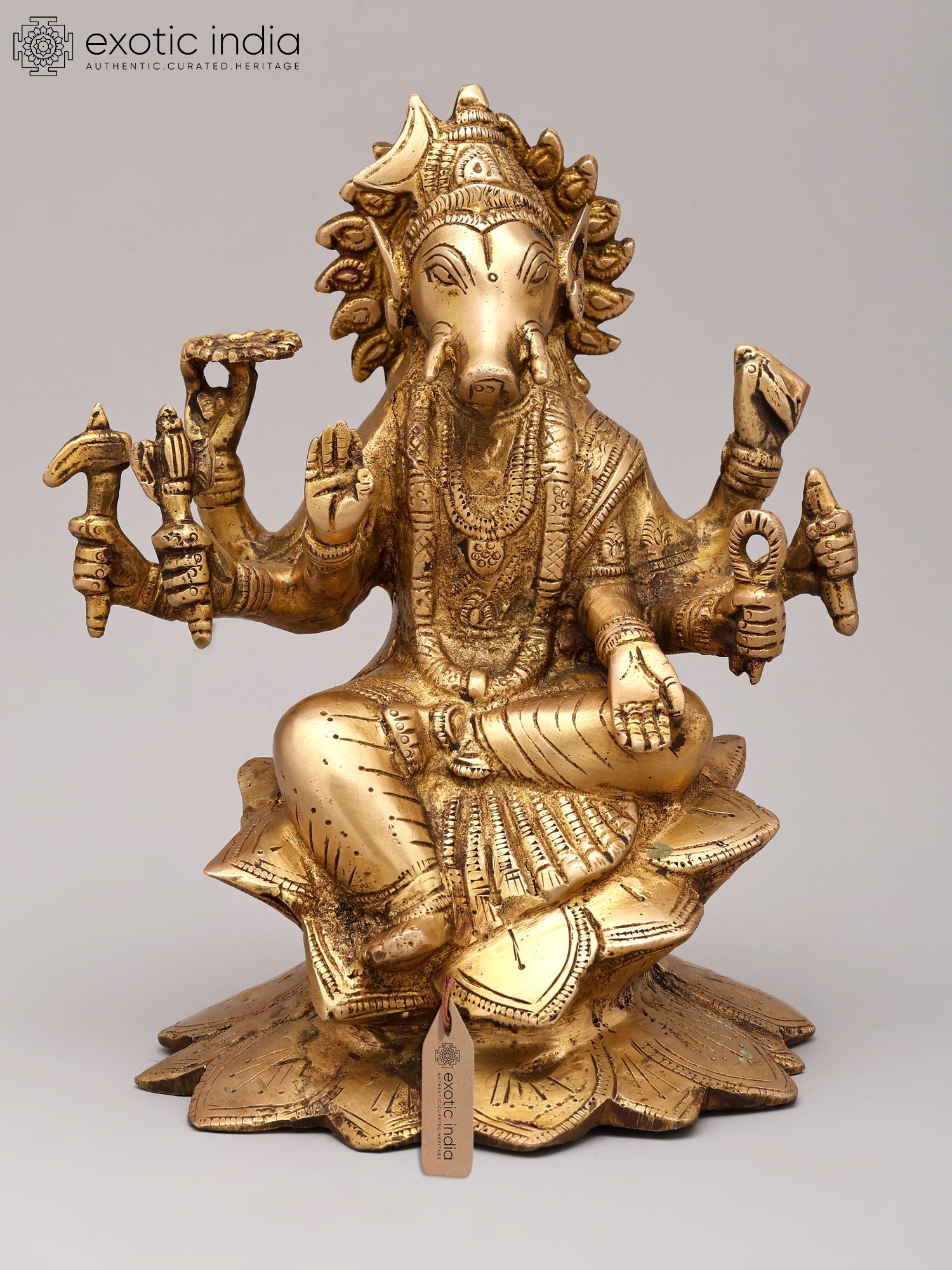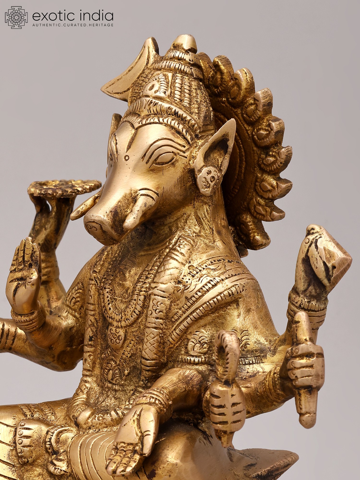 Explore the divine energy of Varahi, the powerful shakti of Varaha, through this remarkable depiction in brass. With the head of a sow and adorned in a majestic karaṇḍa mukua, Varahi radiates strength and grace. Her four arms carry symbolic attributes reminiscent of Vishnu, such as the discus, mace, and noose. Varahi's sacred presence, holding the Earth on her tusks akin to Varaha, symbolizes protection and cosmic balance. This handmade brass sculpture captures the intricacies of Varahi's divine form, inviting you to connect with the profound energy of the feminine and the cosmic. Embrace the spiritual essence embodied in this exquisite Varahi statue.