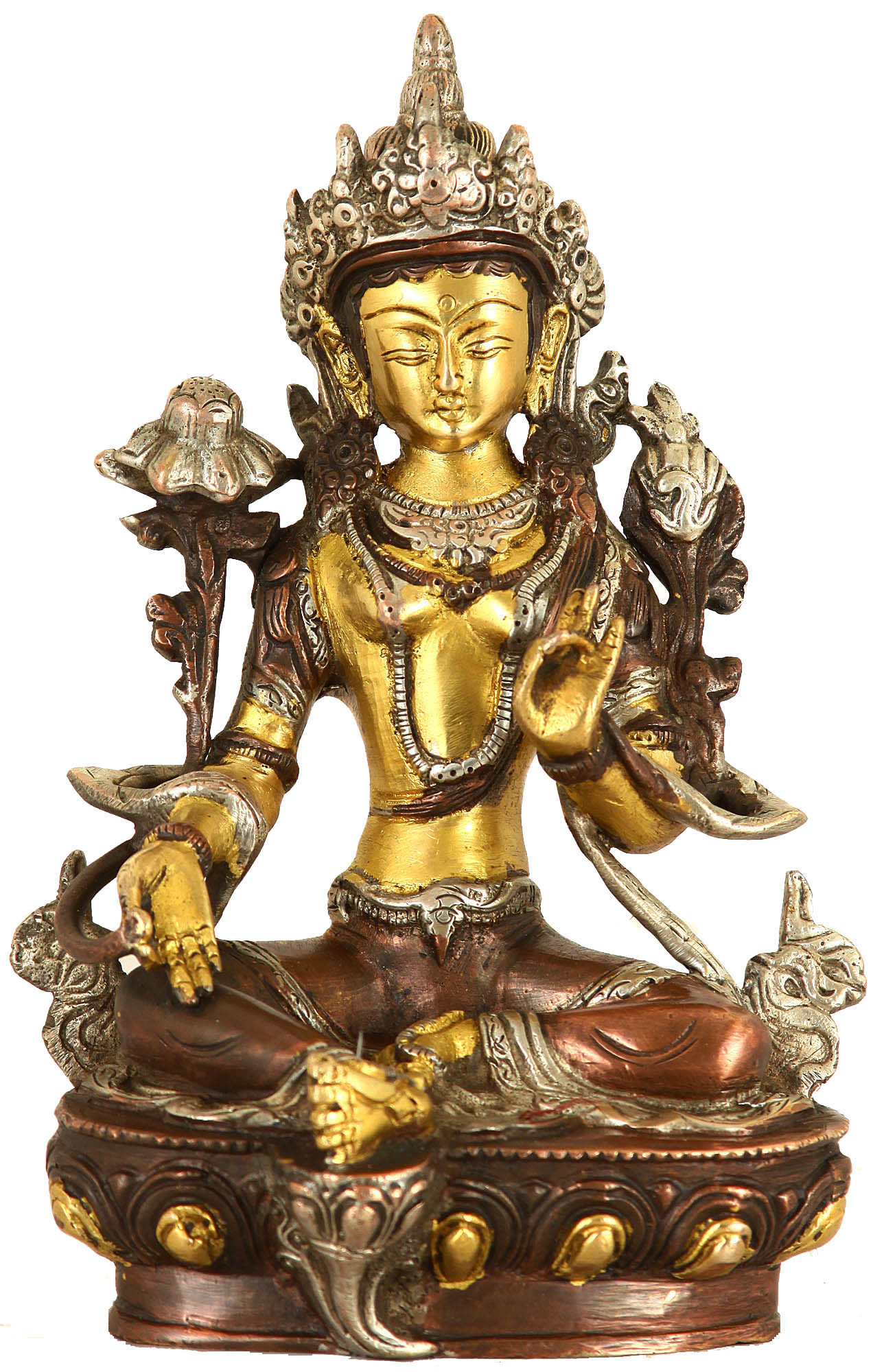 Tara is known to have two primary forms: Green and White. Here she is shown as the former. In this representation, one of her legs (left) is tucked in while the right one is extended and rests on a lotus. The extended right leg is symbolic of the Goddess's ever-readiness to spring to the defence of her devotees. Her left hand is raised in a graceful gesture and holds the stalk of a half-closed lotus bud, in contrast, her right arm holds the stem of a full-blown lotus.