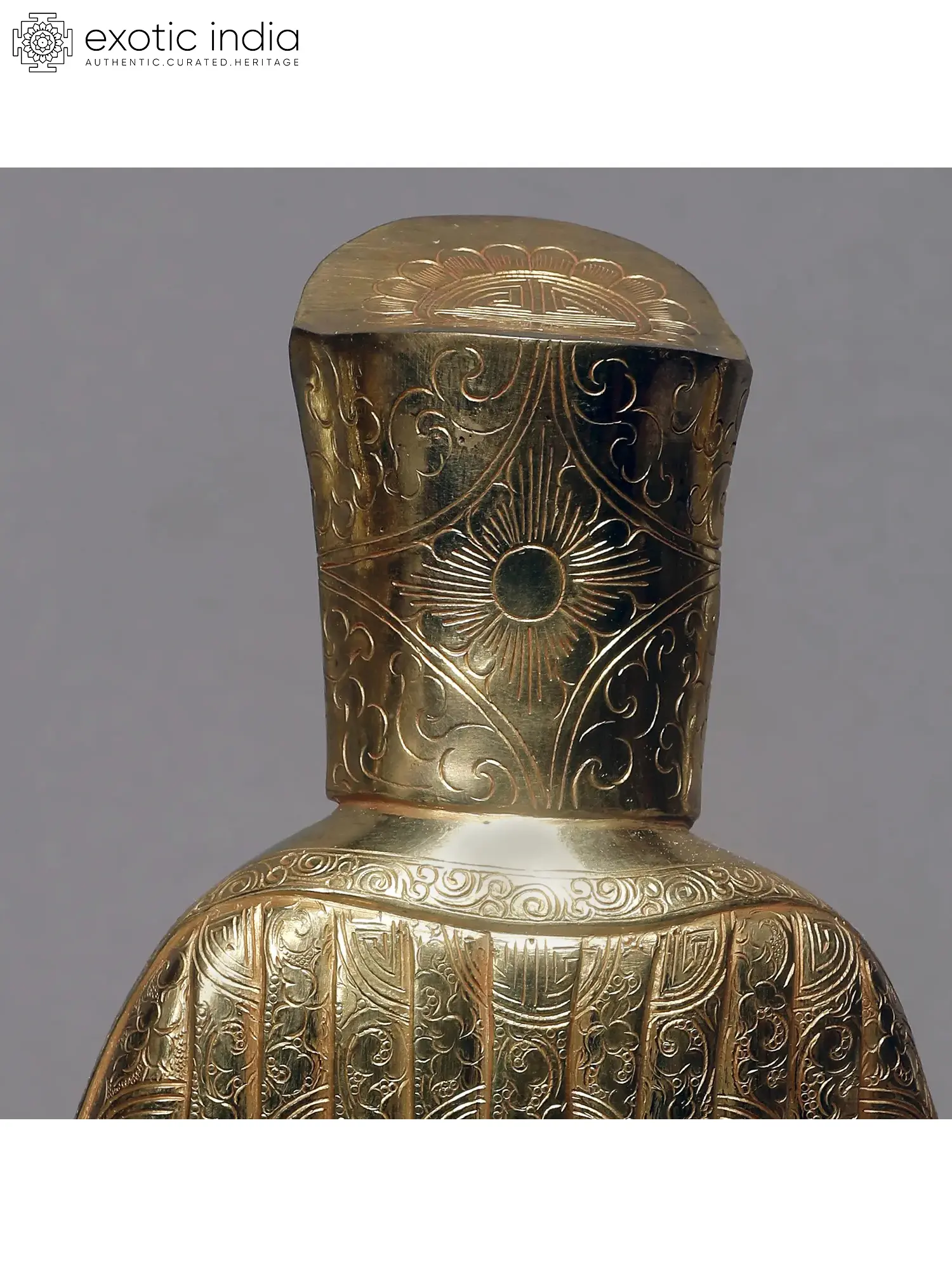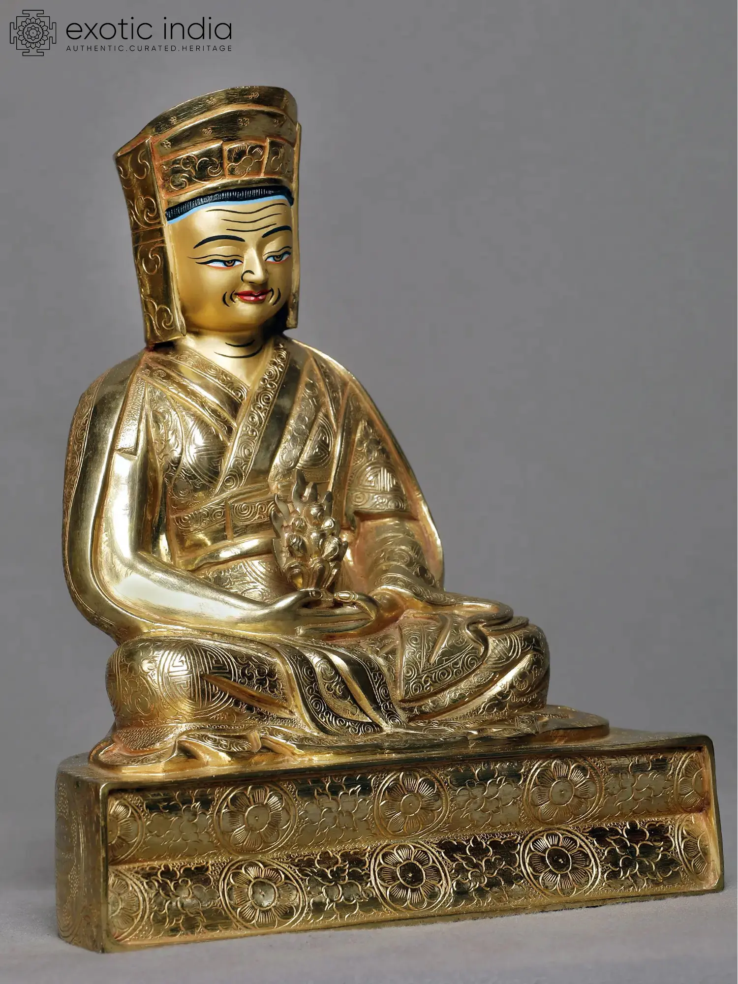 This exquisite statue, meticulously crafted in Nepal, portrays the venerable Guru Gampopa in a state of serene contemplation. Cast in rich copper and adorned with a resplendent layer of gold, this piece embodies the spiritual depth and artistic mastery characteristic of Himalayan Buddhist traditions. The Guru Gampopa, a pivotal figure in the Kagyu lineage of Tibetan Buddhism, is depicted seated in a meditative posture, his gaze serene, and his form radiating an aura of profound wisdom and compassion. Guru Gampopa, born in the 11th century, was a physician and scholar who became a chief disciple of the renowned Tibetan yogi Milarepa. He is credited with systematizing Milarepa's teachings, laying the groundwork for the establishment and flourishing of the Karma Kagyu school. His legacy is preserved through his voluminous writings and the unbroken lineage of masters who followed him. This statue serves as a tangible connection to this rich spiritual heritage, inviting contemplation and reverence. ––––––––––––––––––