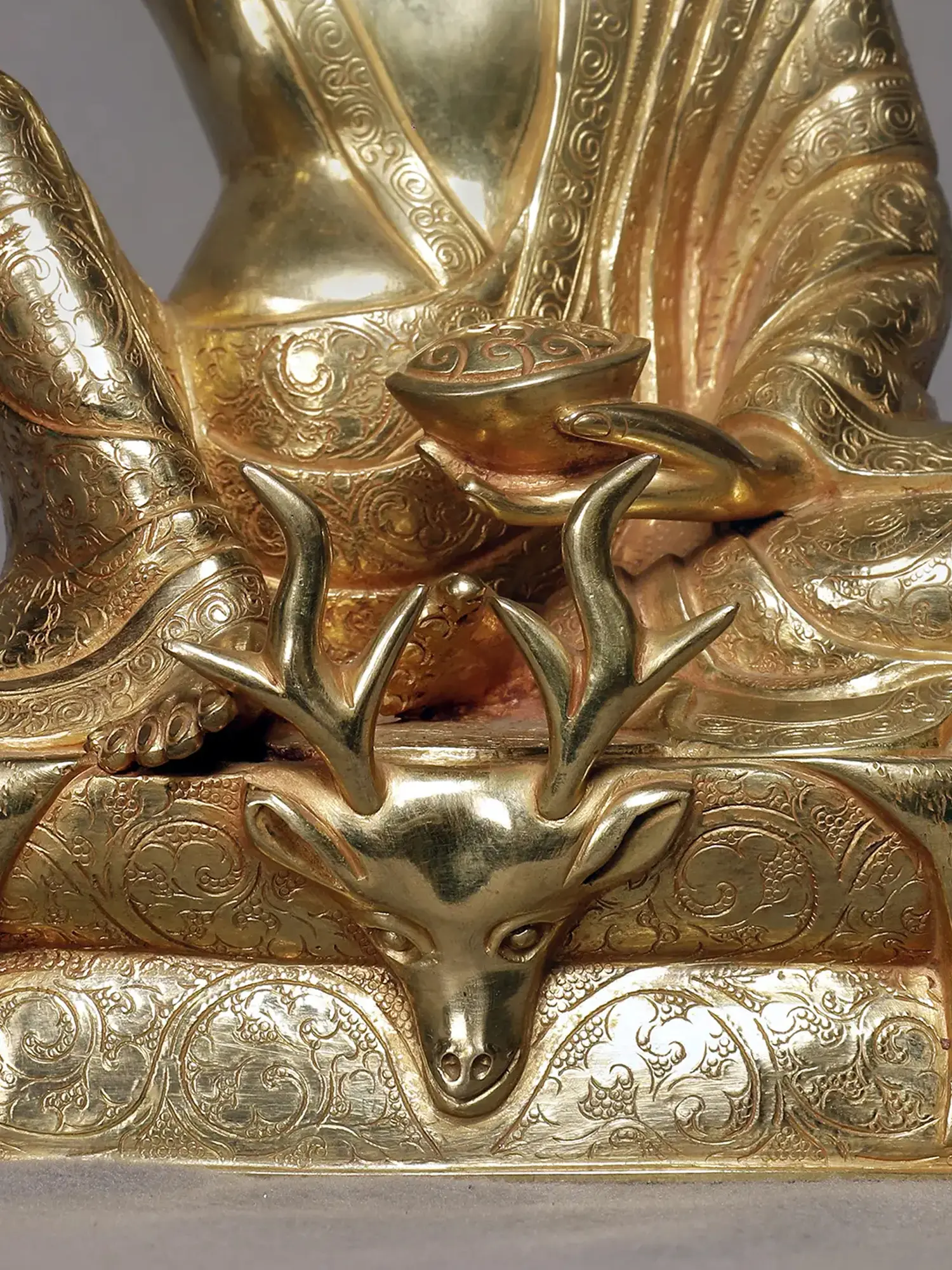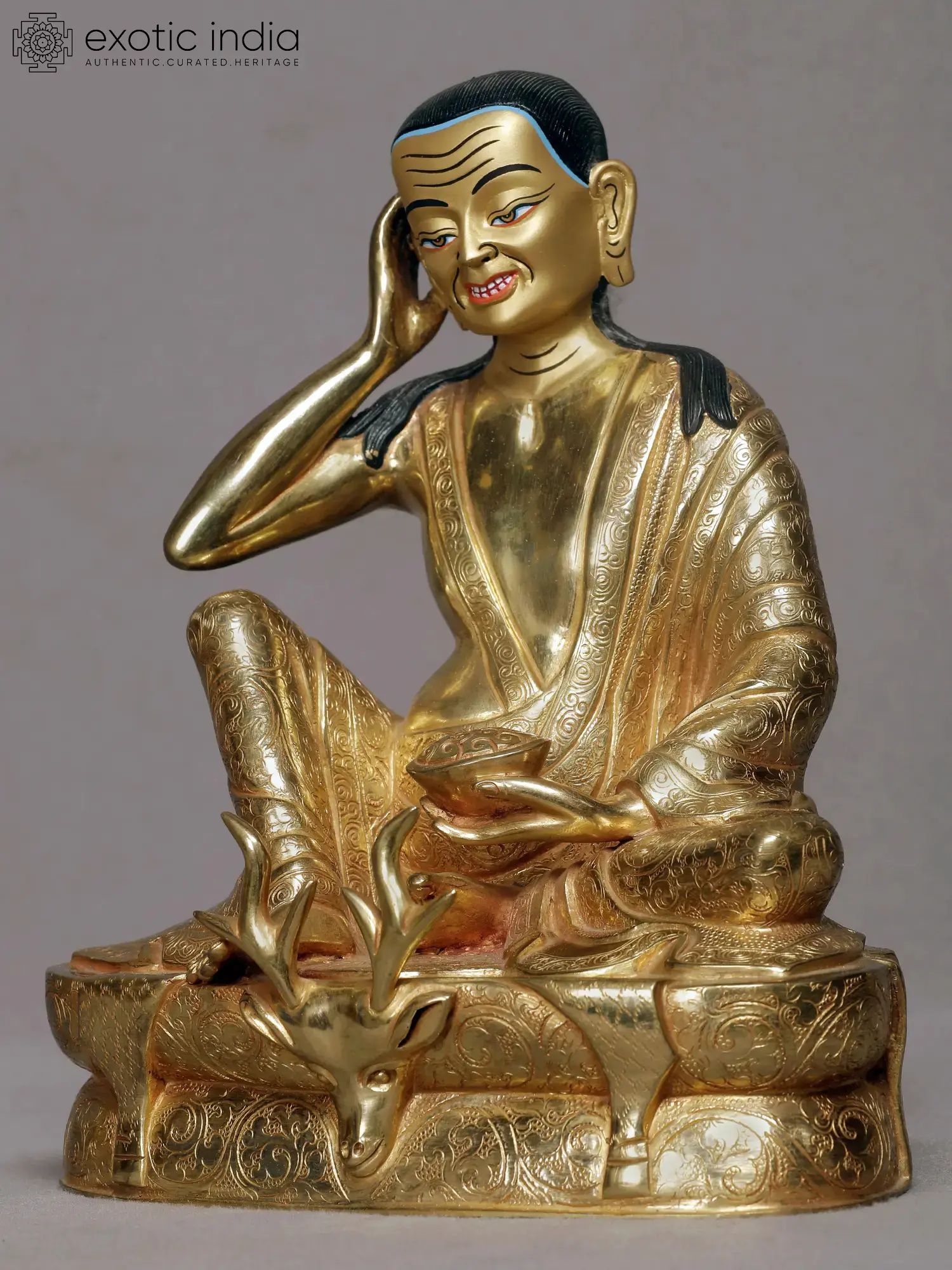 This exquisite statue captures the likeness of Milarepa, one of the most revered yogis and poets in Tibetan Buddhism. Born in the 11th century, Milarepa's life was a testament to transformation, rising from humble origins marked by hardship to become a beacon of spiritual enlightenment. His journey is a powerful narrative of overcoming adversity through intense meditation and unwavering devotion. The statue, crafted from copper with a lustrous gold finish, embodies the radiant spiritual energy that Milarepa is said to have emanated. The posture of the figure is one of profound contemplation and ease, indicative of a soul at peace with the world. Milarepa's characteristic gentle smile and serene expression convey a deep understanding of life's complexities. His right hand is raised to his ear, a gesture often interpreted as listening to the subtle sounds of the universe or to the inner voice of wisdom. The intricate folds of his monastic robe are meticulously rendered, showcasing the artisan's skill and dedication to detail. The rich gold plating further enhances the divine aura surrounding the figure, making it a truly captivating piece.