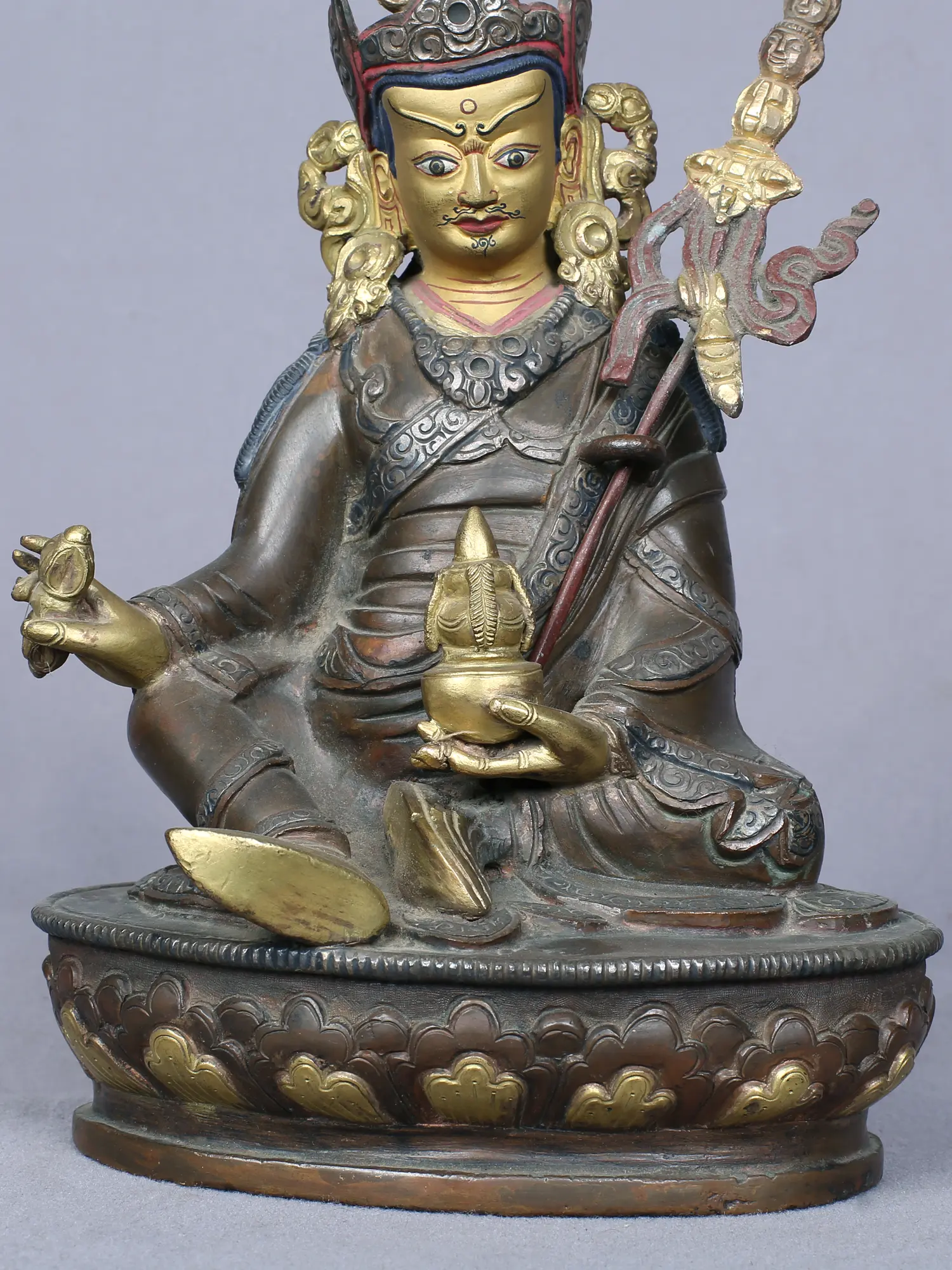 The rich symbolism of this statue offers profound insights into Padmasambhava's spiritual attributes. He is depicted in his regal attire, adorned with a crown and elaborate jewelry, signifying his enlightened status and mastery over the three realms of existence. In his right hand, he grasps the vajra, a ritualistic implement representing indestructible wisdom and the thunderbolt that dispels ignorance. His left hand holds a kapala, a skull cup, symbolizing the transformation of negative emotions and the ultimate emptiness of phenomena. The vajra scepter held upright in his left arm is a powerful symbol, often representing his dominion over the forces that hinder spiritual progress. The serene expression on his face, with eyes that gaze with profound insight, invites contemplation and connection. The intricate detailing of his robes and the lotus throne upon which he sits further enhance the sanctity and artistic merit of this divine representation.