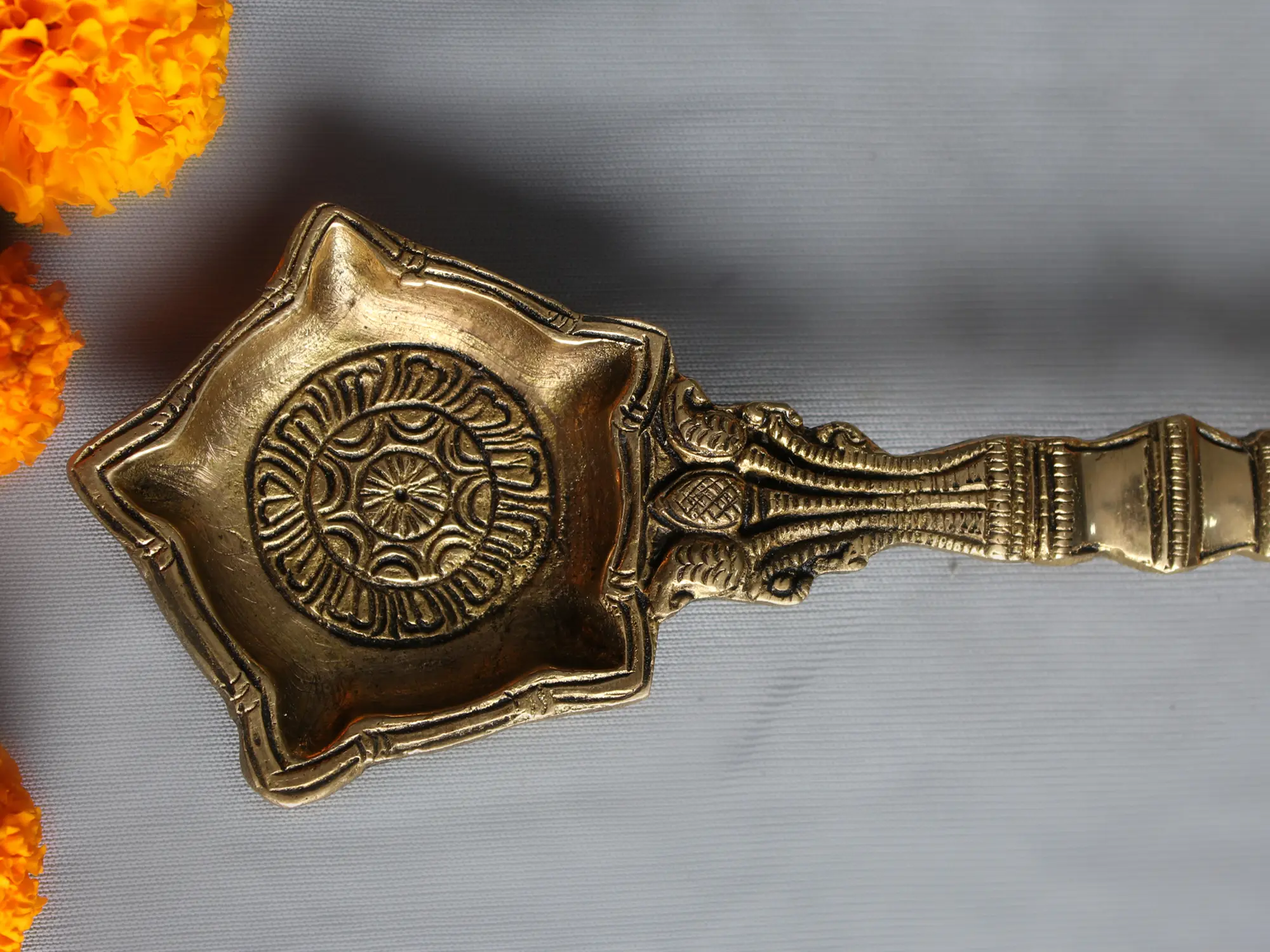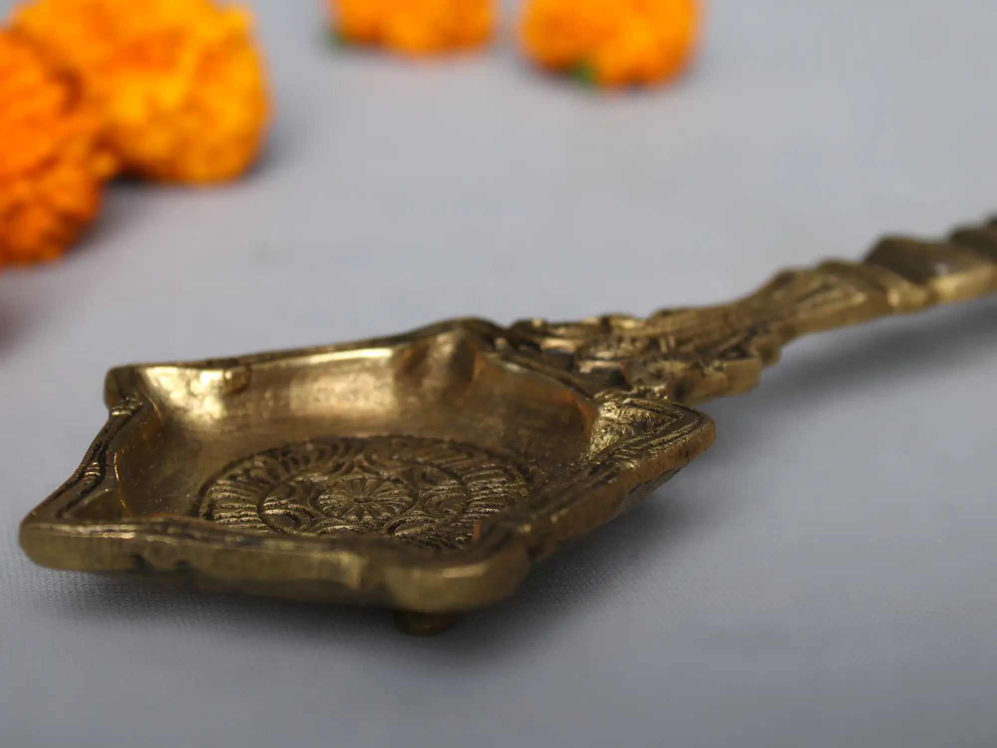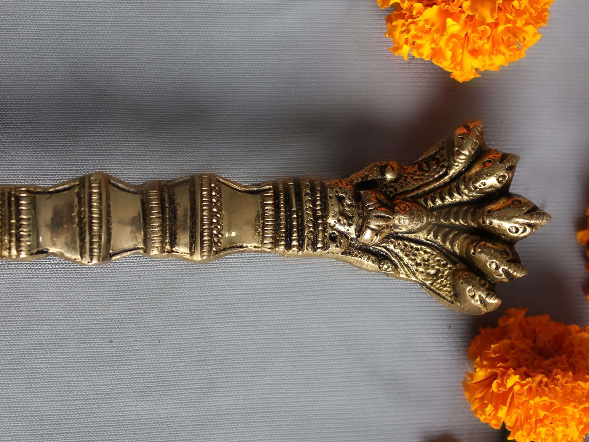 This hand-held Patanjali Aarti lamp is a Panchadeepam and is perfect for presenting almighty observances and performing arti. The main feature of the lamp is a five-headed serpent carved at the end of the lamp's exquisite brass handle. The lamp's picture of Sheshnaag (five-headed snake) increases its auspiciousness. The wicks of the lamp are clean, resulting in a straight but calming glow. The five wicks ensure that light radiates in all five directions, eradicating utter darkness. If you include this light in your regular worship practices, you will be able to make a more joyful donation.