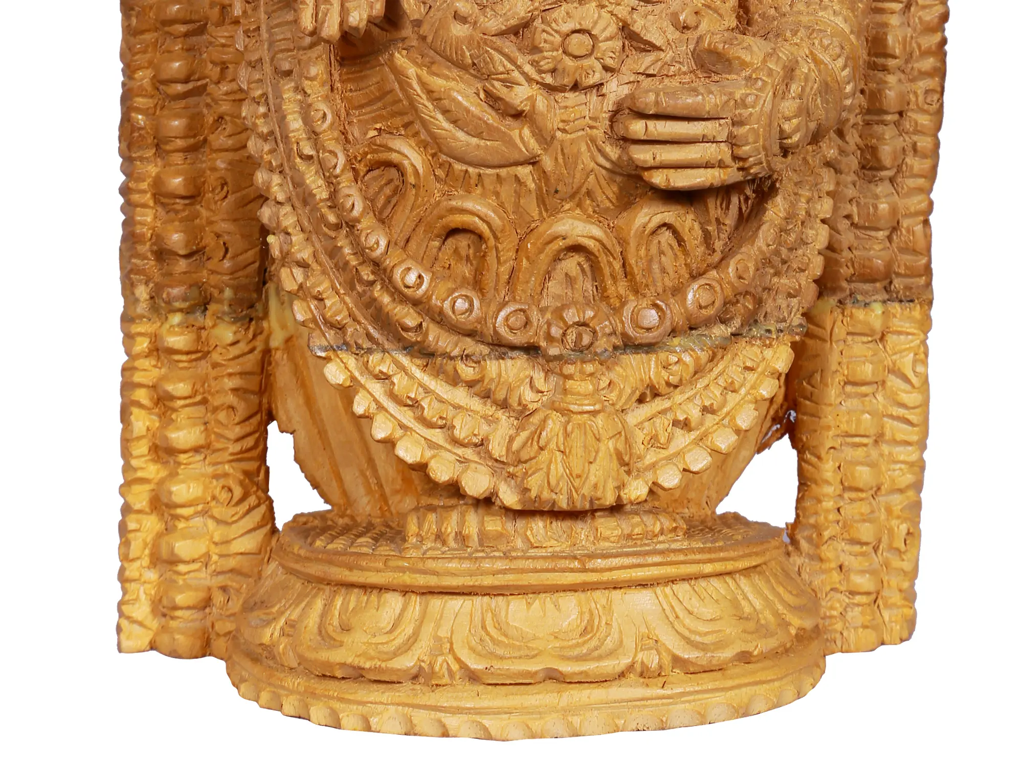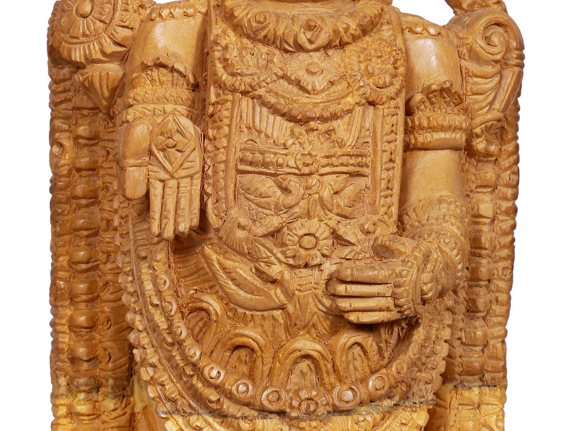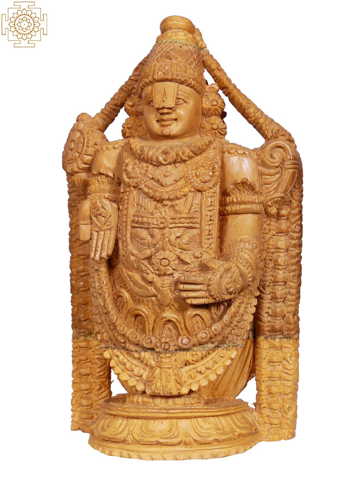 Bring the sacred presence of Lord Venkateshwara, affectionately known as Balaji, into your home with this exquisite wooden representation. Crafted from fine whitewood, this statue captures the divine aura of the deity who is revered as the Lord of the Seven Hills in Tirumala. Lord Venkateshwara is an avatar of Lord Vishnu, the preserver of the universe, and is worshipped as the ultimate bestower of boons and dispeller of troubles. His devotees flock in millions to the Tirumala Venkateswara Temple, seeking his blessings for prosperity, well-being, and liberation. This intricately carved statue portrays Lord Balaji in his iconic standing posture. Notice the serene expression on his face, the tilak adorning his forehead, and the gentle smile that radiates compassion. His hands are adorned with divine ornaments, and one hand is raised in a gesture of *abhaya mudra*, offering protection and reassurance to his devotees. The other hand is placed on his hip, a posture signifying his grace and accessibility. The fine details in the carving, from the ornate crown atop his head to the decorative necklaces and garments, speak of the devotion and skill of the artisan. ––––––––––––––––––