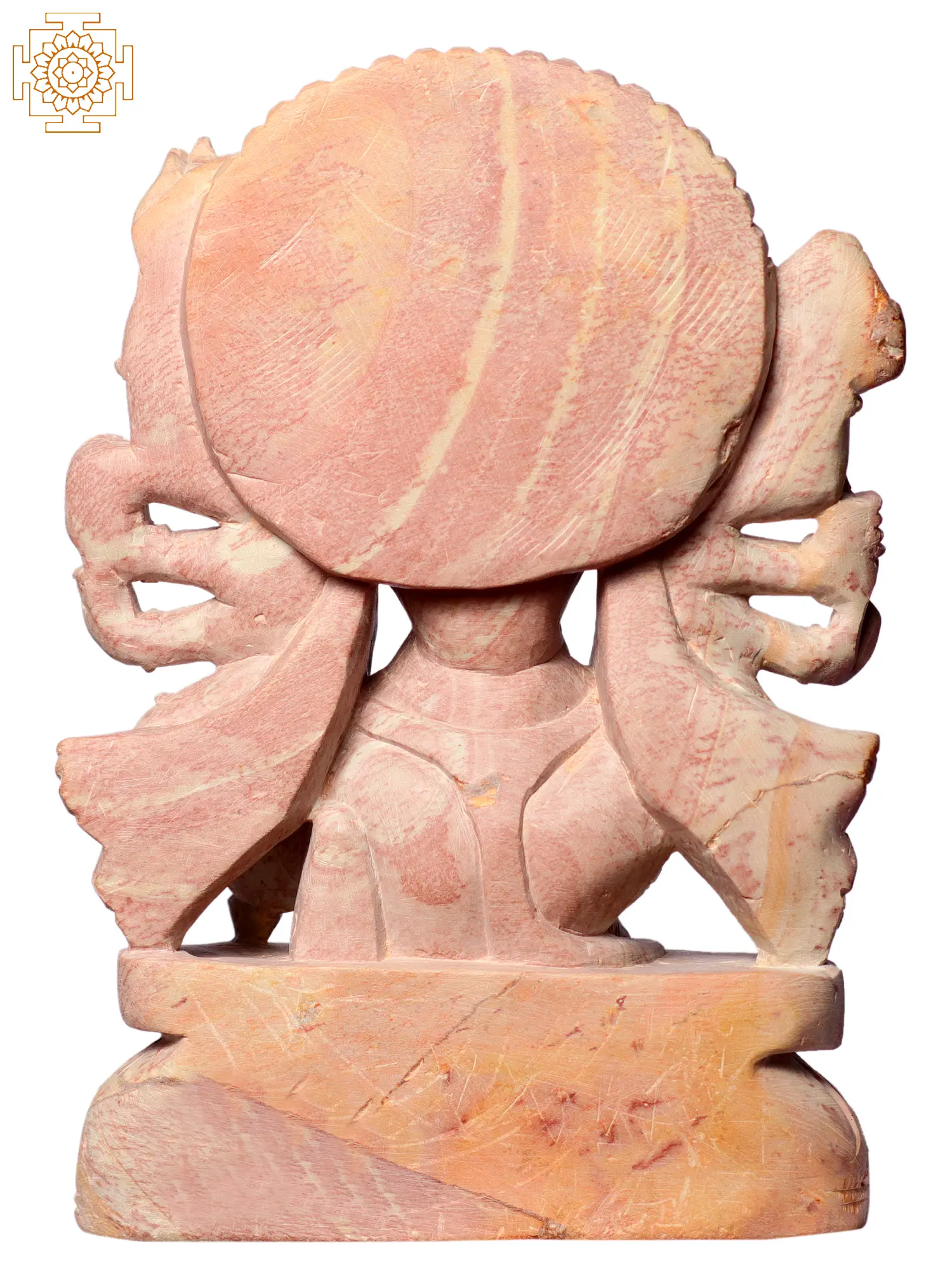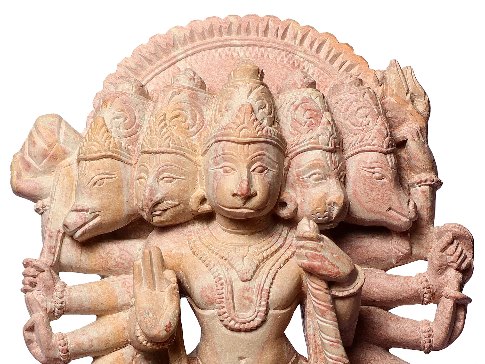 This exquisite sculpture captures the awe-inspiring Panchamukhi Hanuman, the five-faced manifestation of the devoted monkey god. Crafted from a single piece of beautiful pink stone, this statue is a testament to the skilled artistry of Odishan stone carving. Each face of Hanuman is rendered with distinct expressions and adorned with intricate headdresses, showcasing the divine power and versatility of this beloved deity. The multiple arms, each holding symbolic weapons and gestures, further enhance the majestic aura of the sculpture, representing Hanuman's formidable strength and unwavering devotion. ––––––––––––––––––