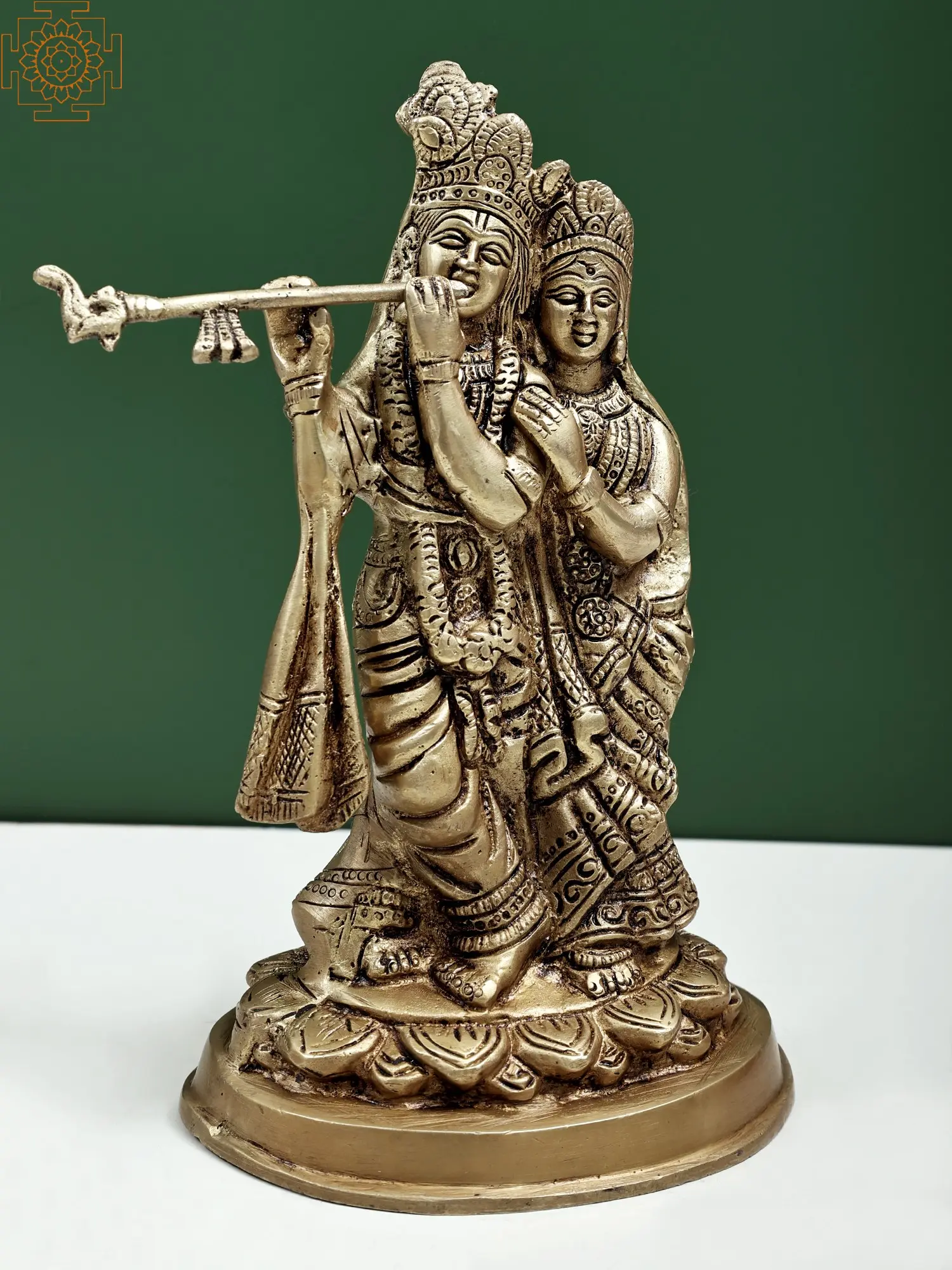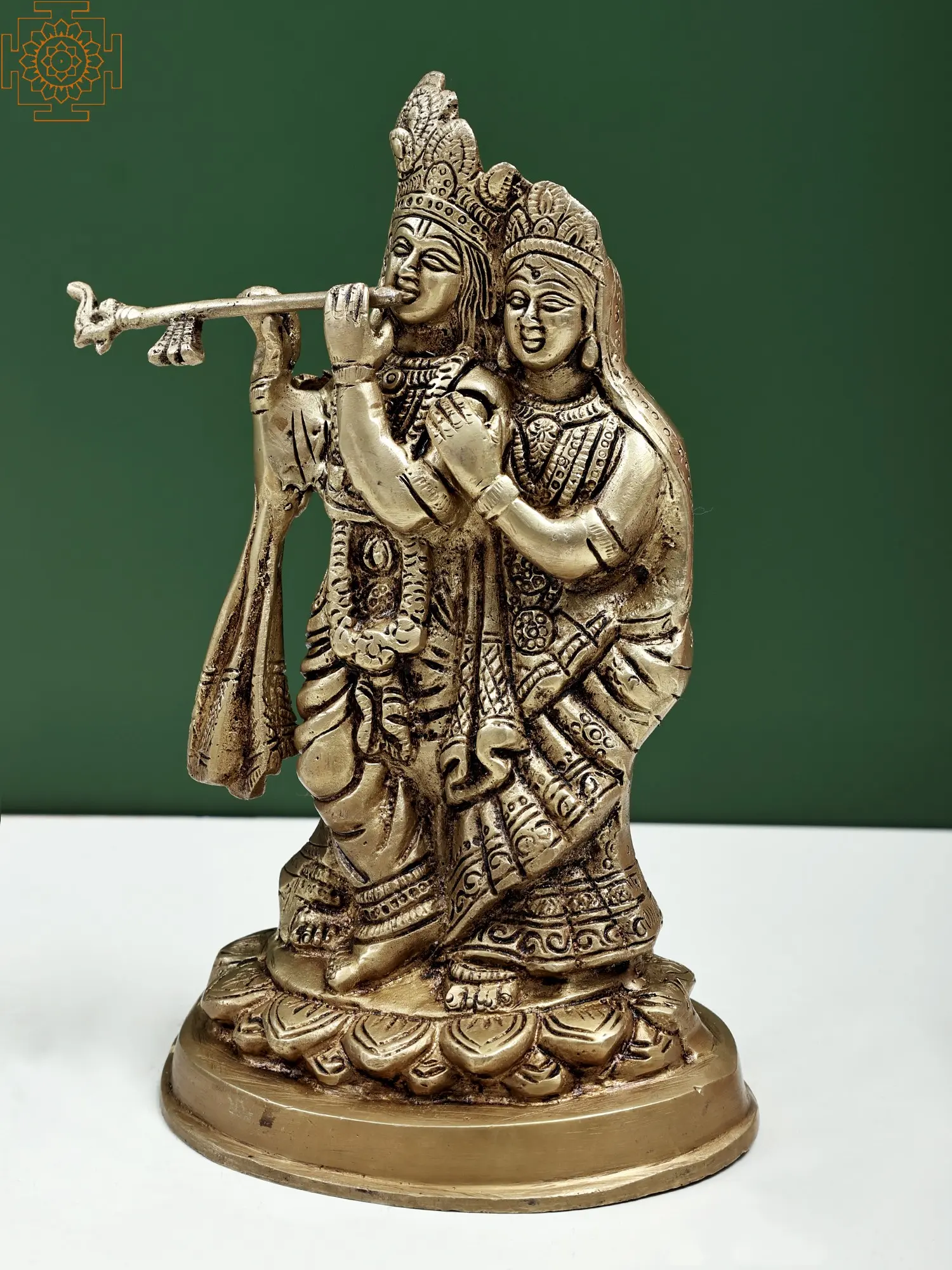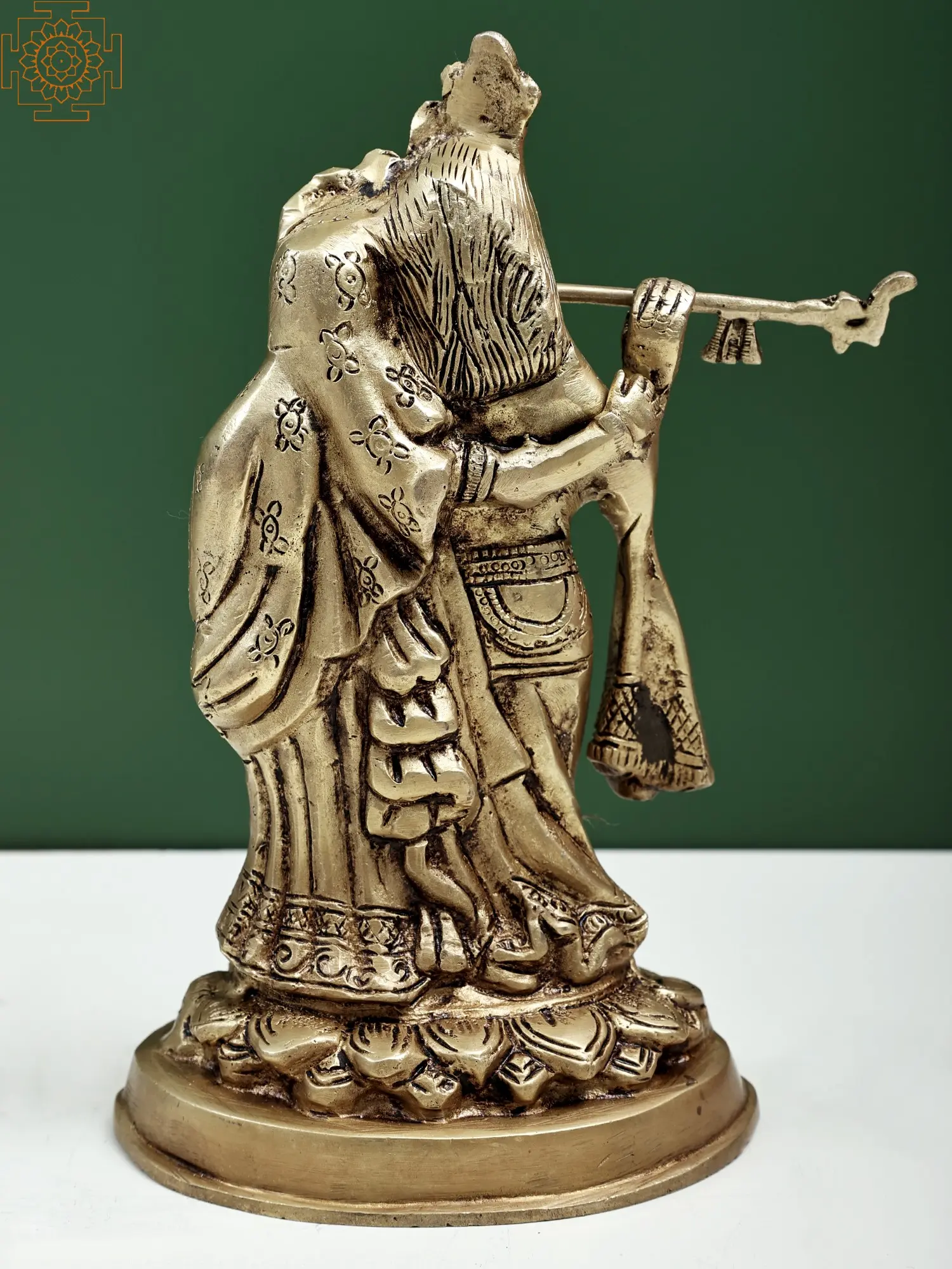 With unparalleled skill, Radha and Krishna stand intertwined in a dance of love and unity. Their forms exude a sense of ethereal grace and timeless affection, symbolising the cosmic connection between the human and the divine. Every detail, from their delicate features to their ornate adornments, speaks of the depth and purity of their divine love. Cast in lustrous brass, this portrayal radiates an aura of boundless devotion. The fusion of Radha and Krishna becomes a visual ode to the inseparable nature of their love, transcending the boundaries of time and form. Their embrace embodies the union of the individual soul with the universal consciousness.