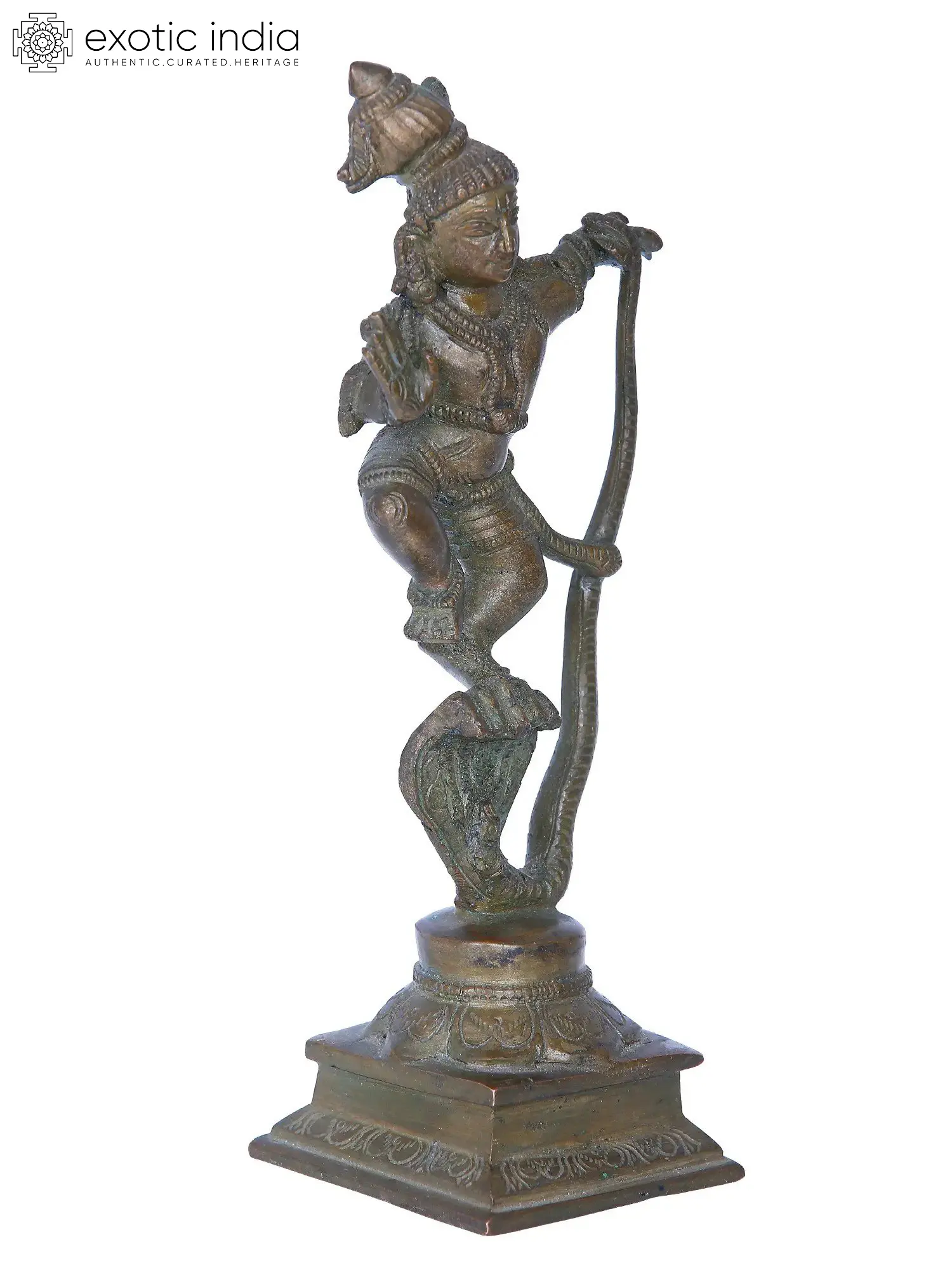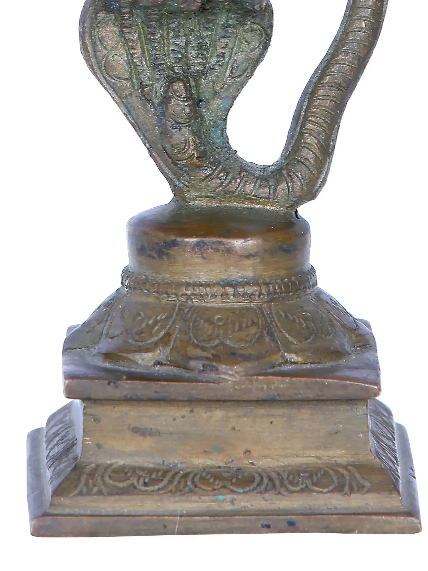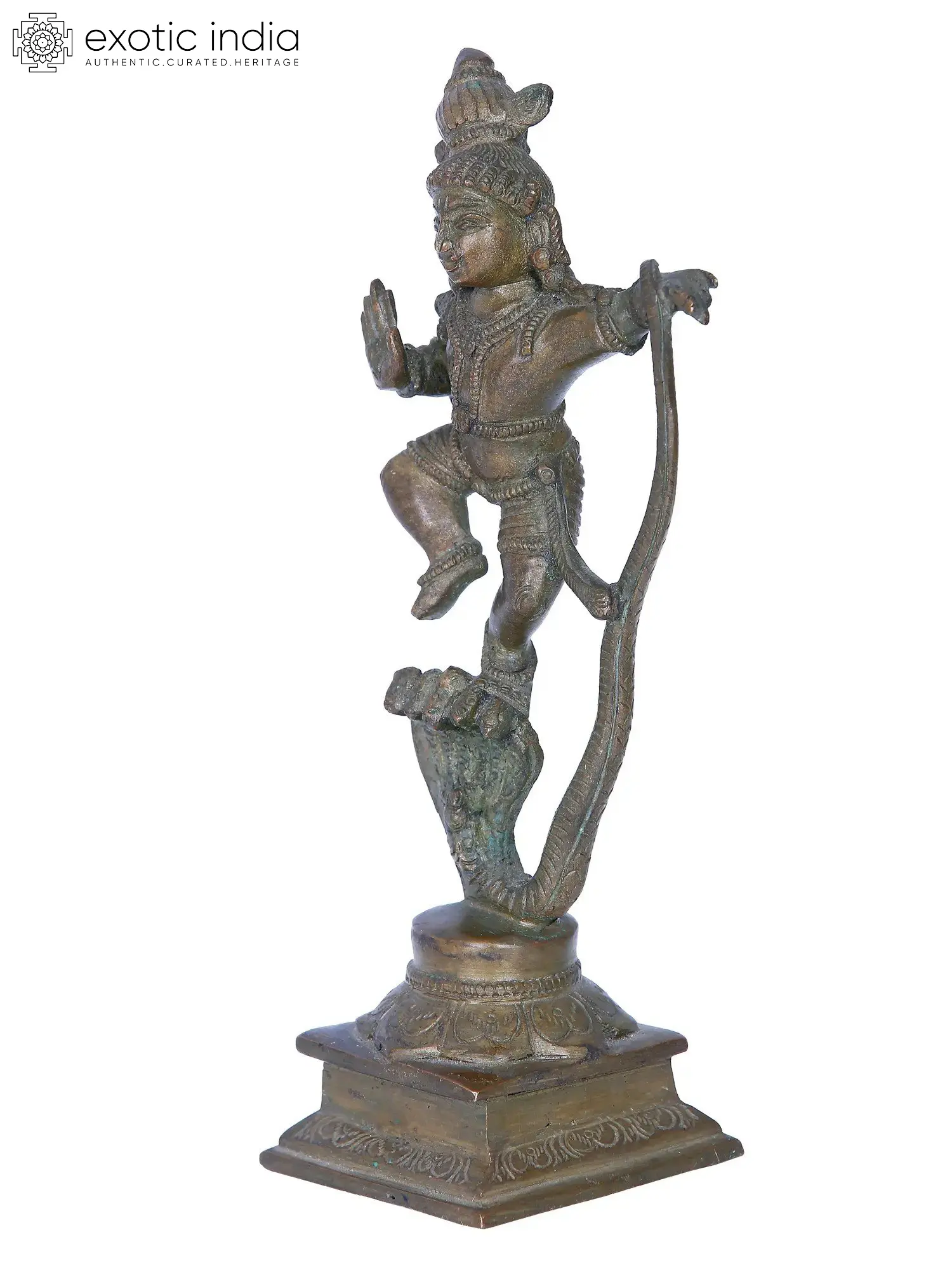 Sculpted from panchaloha bronze, a blend of five (‘pancha’) different iron-based (‘loha’) alloys, this Krishna murti has been infused with a lot of detail. For example, the crown on Gopala’s head is at a dynamic angle in keeping with His body language. Ample adornments grace the divine form. The serrations on Kalinga’s long body and the semblance of namaskaram right beneath its many hoods.