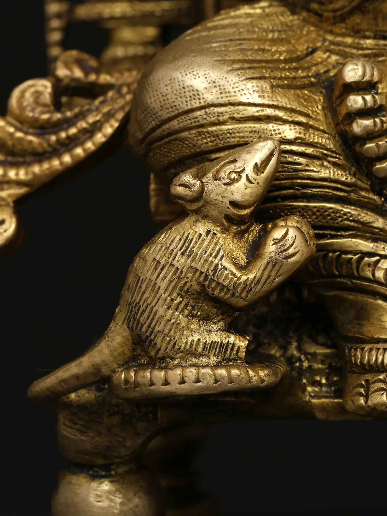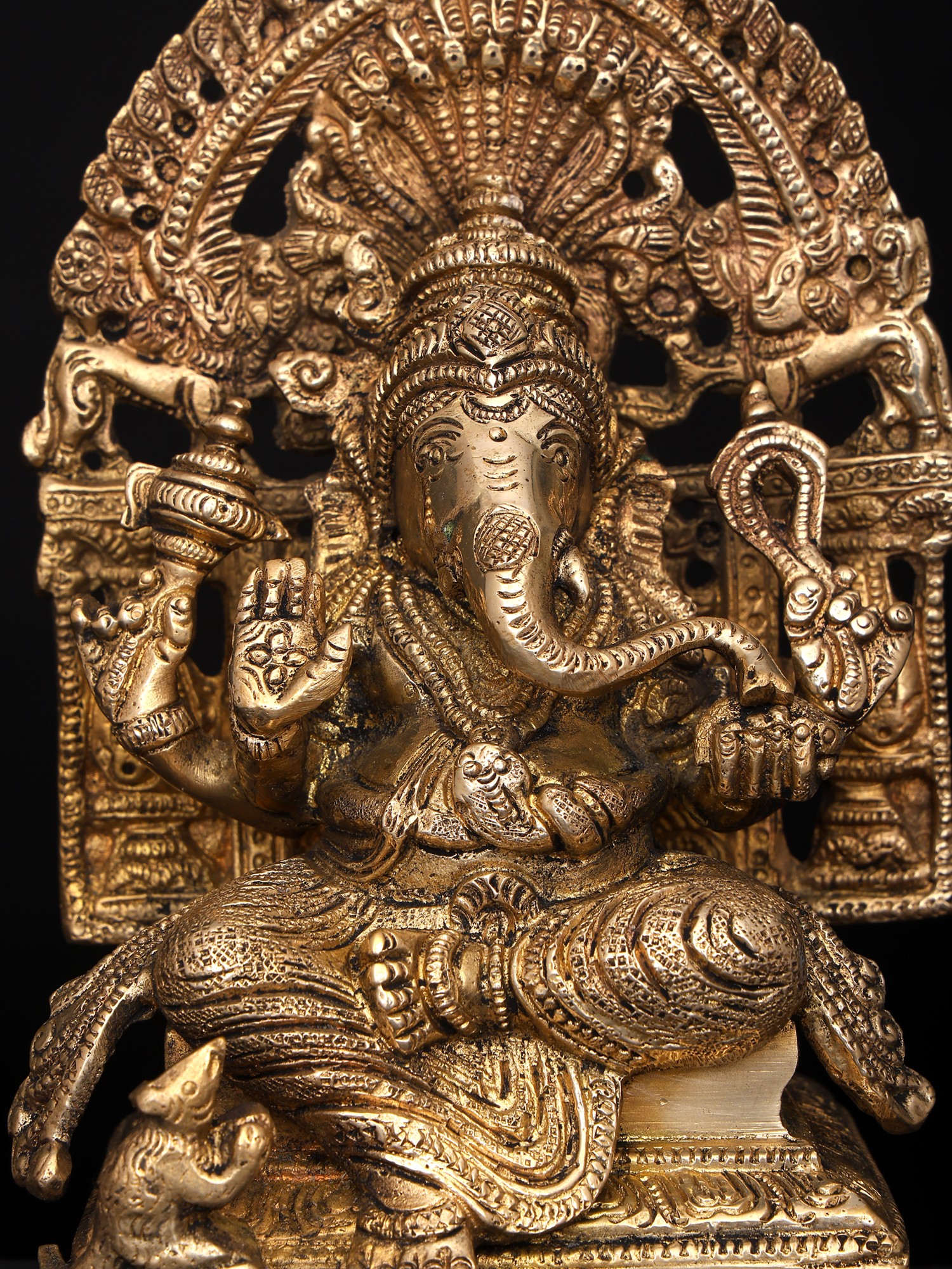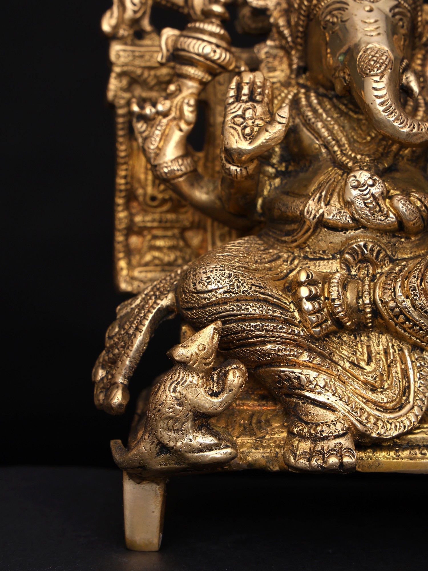 This particular depiction showcases Ganesha in a regal pose, seated upon an elaborately crafted throne. His large belly, symbolic of abundance and the universe itself, is gently draped with flowing garments. His four arms hold significant emblems: One hand offers blessings, *abhaya mudra* granting reassurance and protection from fear. Another holds a *laddu*, a sweet symbolizing the rewards of spiritual seeking and the sweetness of life. His third hand carries a battle axe, the fourth carries a cup of ambrosia. The axe symbolizes the cutting of bonds of worldliness, and the ambrosia is a symbol of immortality. The attention to detail is evident in every aspect of the sculpture, from the intricate carvings on the throne to the delicate features of Ganesha's face. A tiny mouse, Ganesha's vahana (vehicle), is seated at the base, symbolizing humility and the ability to overcome even the smallest obstacles.