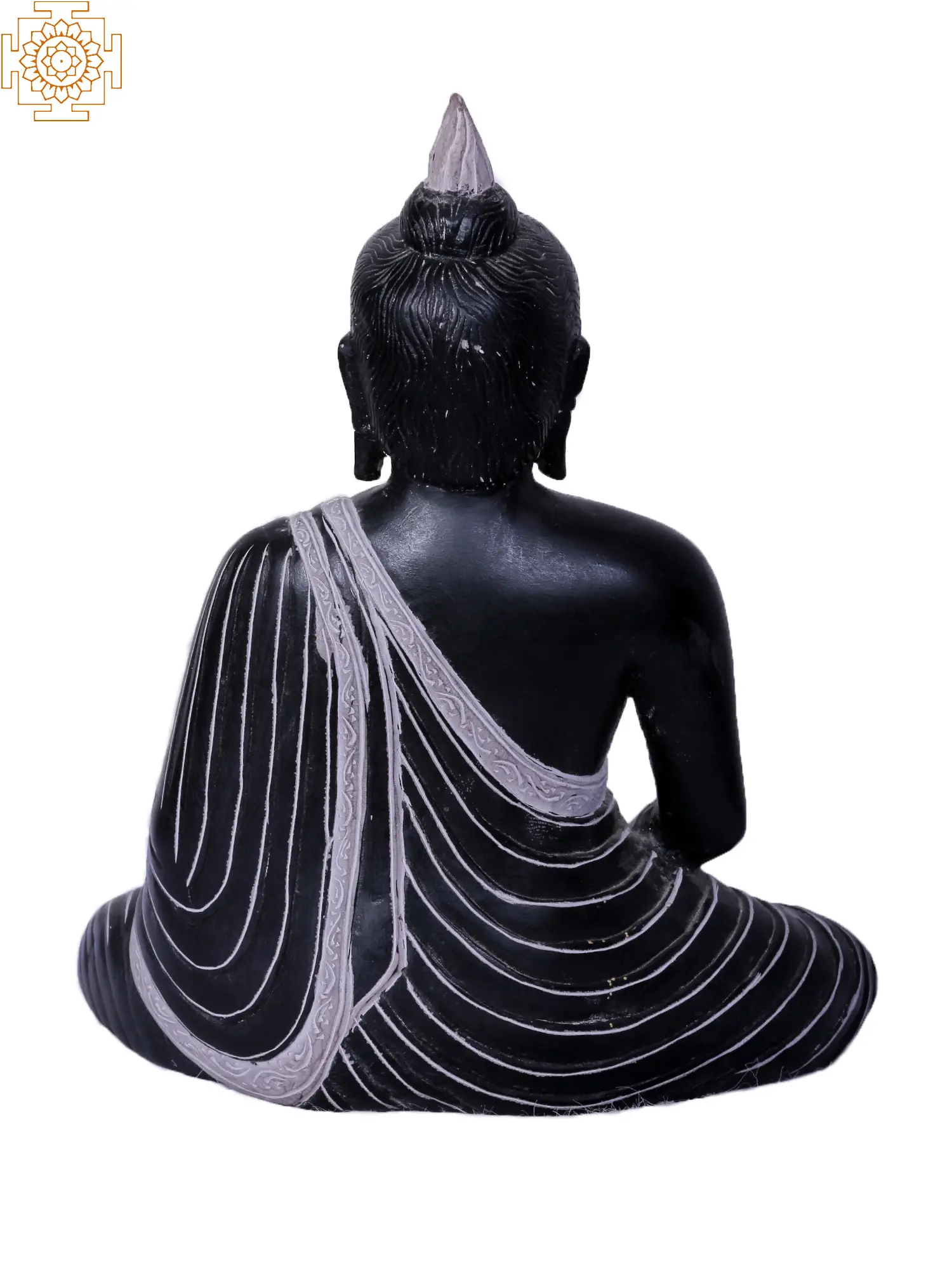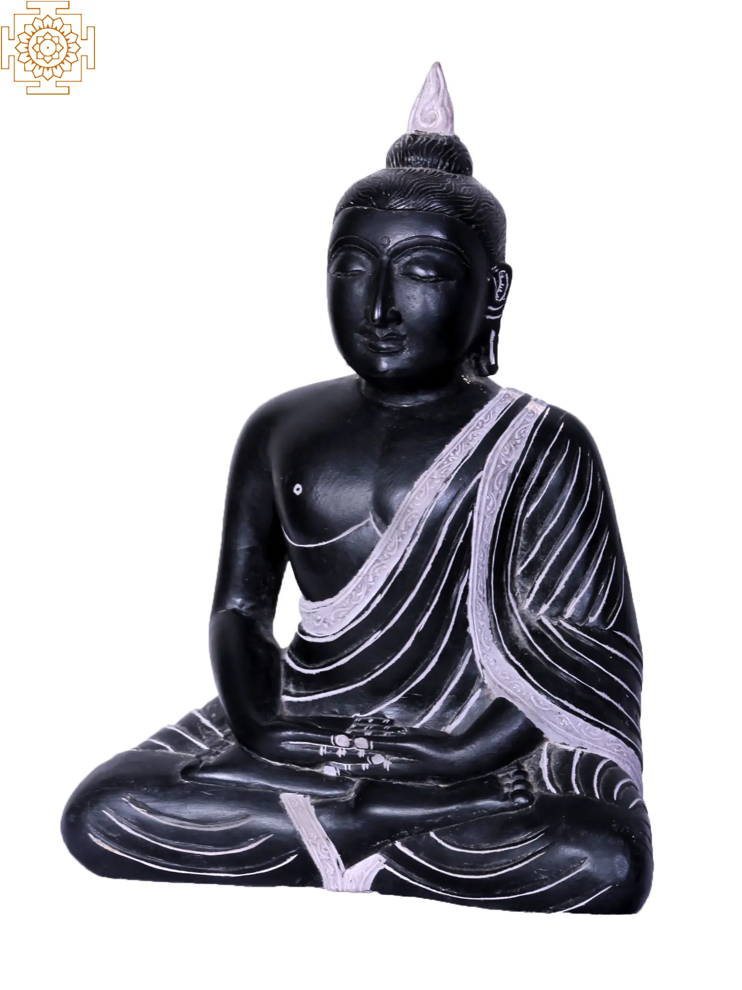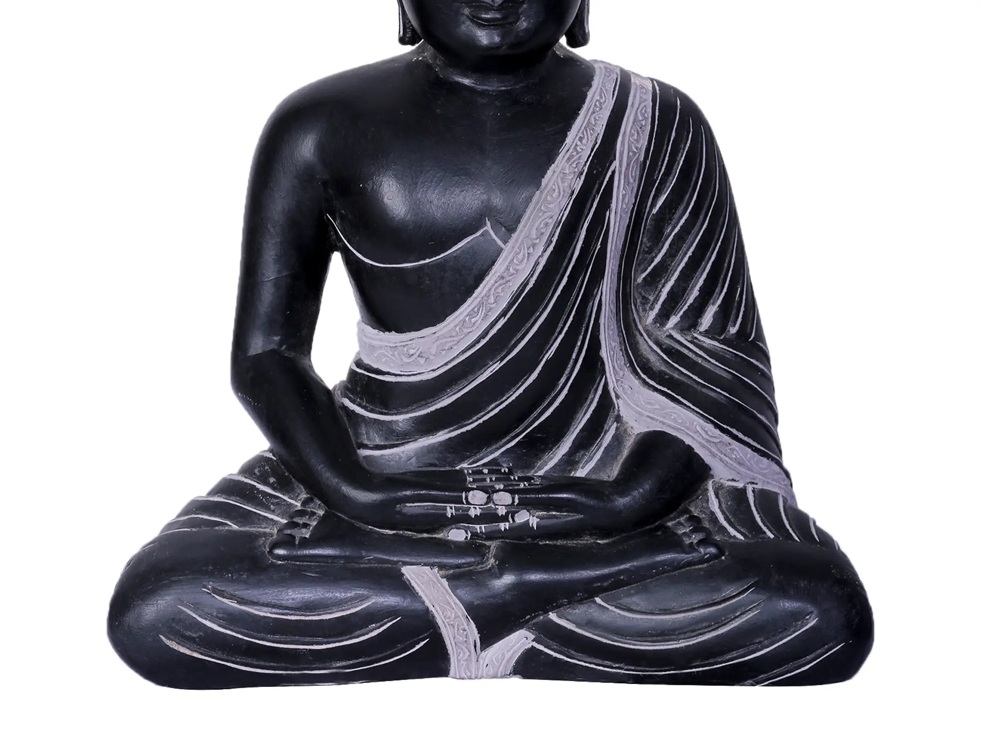 Invite an aura of profound peace and deep contemplation into your home or sacred space with this exquisite stone statue. Crafted with meticulous attention to detail, this depiction of Lord Buddha embodies the essence of meditation and spiritual awakening. The figure is seated in the iconic Dhyana Mudra, a gesture of perfect balance and concentrated wisdom. In this pose, the hands are placed in the lap, the right hand resting on the left, with thumbs touching, symbolizing the unity of opposites and the attainment of enlightenment. The smooth, dark stone has been expertly carved to capture the serene expression of the Buddha, his eyes gently closed, suggesting an inward journey of profound insight. The finely rendered robes drape gracefully, adding to the statue's sense of tranquil composure. This posture is deeply rooted in Buddhist tradition, representing the moment of Buddha's enlightenment under the Bodhi tree, when he achieved ultimate understanding and compassion for all beings.