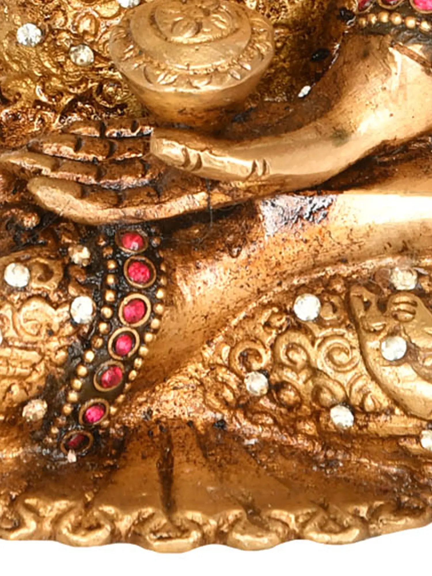 Crafted with meticulous attention to detail, this statue is a testament to the skill of Indian artisans. The lustrous brass, polished to a warm gleam, is adorned with intricate carvings that depict flowing robes and elaborate ornamentation. Small, vibrant gemstones are embedded within the fabric of his attire, catching the light and adding a touch of celestial radiance. The urna, the auspicious mark on his forehead, and the ushnisha, the cranial protuberance signifying his heightened consciousness, are rendered with precision. This piece is not merely an object of art but a sacred representation, designed to inspire contemplation and foster a sense of peace and spiritual awareness in any space it graces. ––––––––––