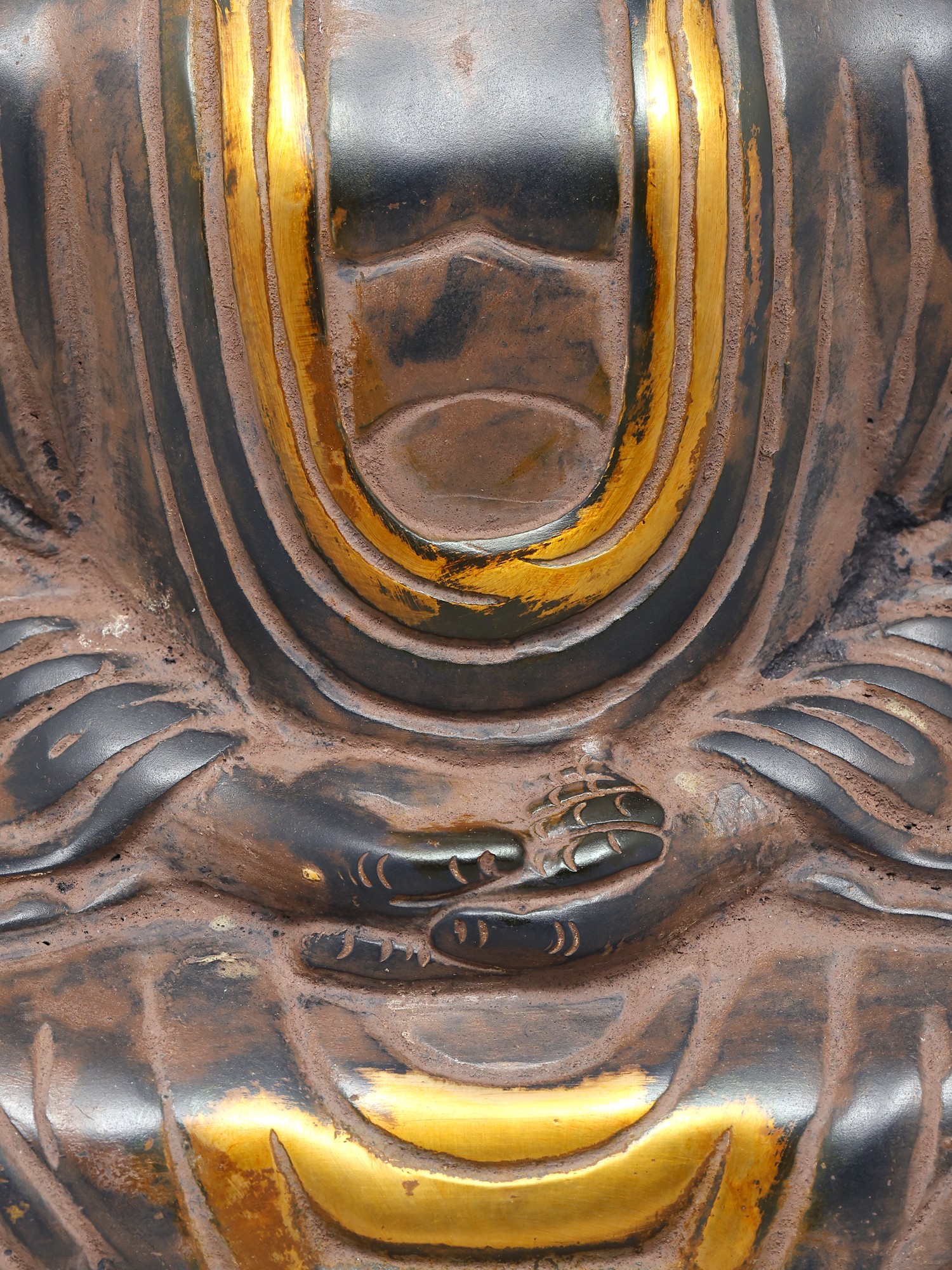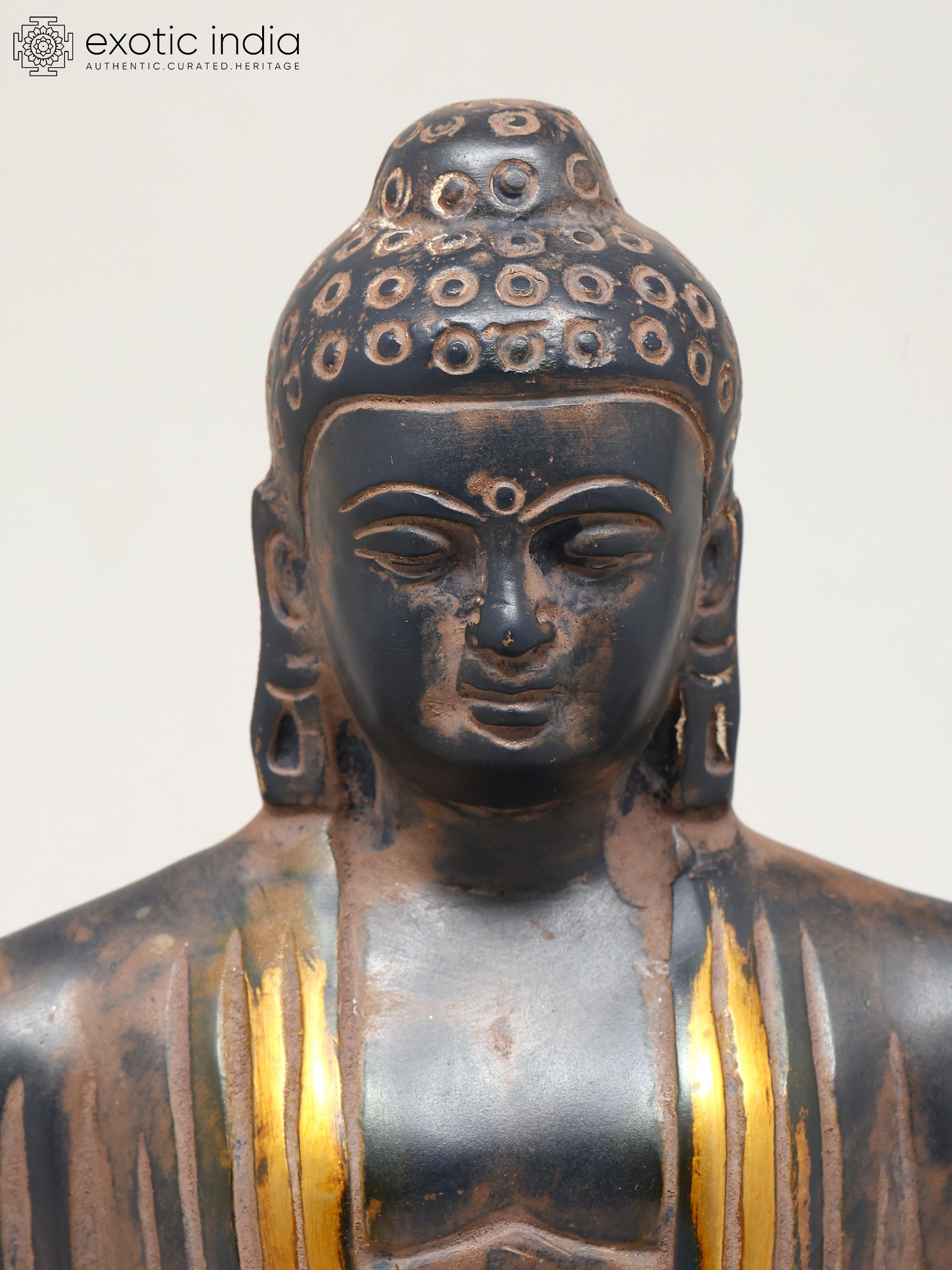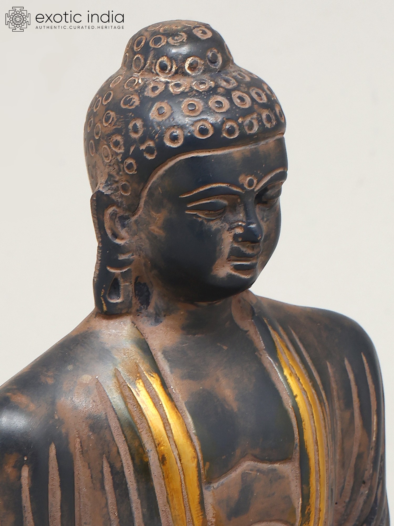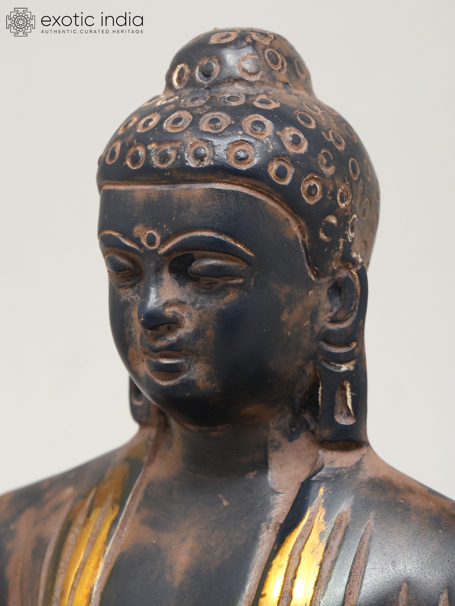 Each curve and contour of this brass statue speaks to the skill and dedication of the artisans who brought it to life. The casting process, likely involving traditional techniques passed down through generations, imbues the metal with a tangible sense of history and cultural significance. The application of the dark patina, combined with the deliberate highlighting of certain features in gold, creates a visually striking contrast that enhances the statue's spiritual aura. This masterful interplay of color and texture transforms a mere object into a work of art, capable of evoking deep emotions and inspiring spiritual reflection. The tactile quality of the brass, cool and smooth to the touch, further connects the viewer to the ancient traditions and the enduring power of Buddhist art. This piece is a beautiful addition to any altar, meditation space, or as a statement of mindful living in a contemporary home.