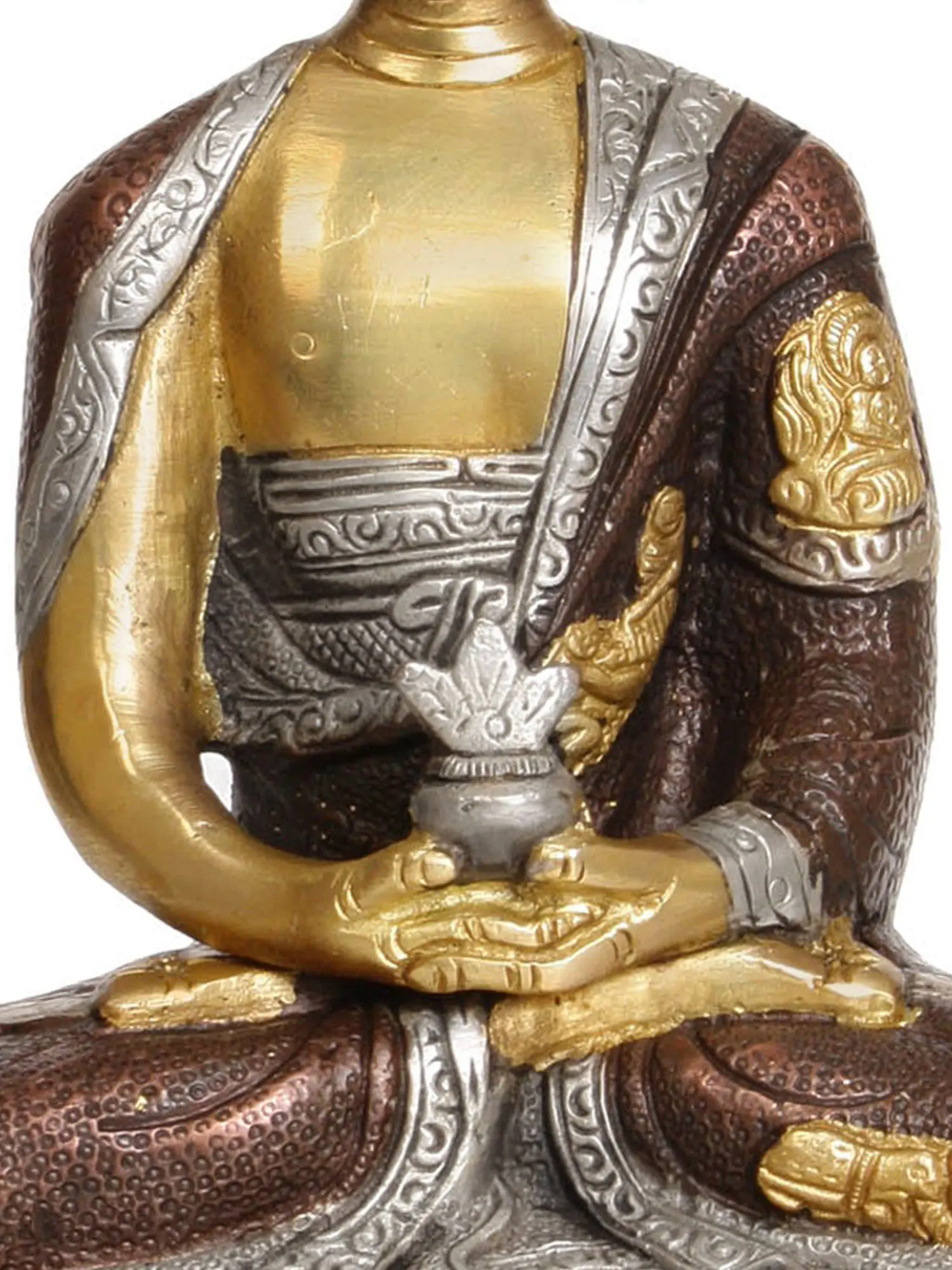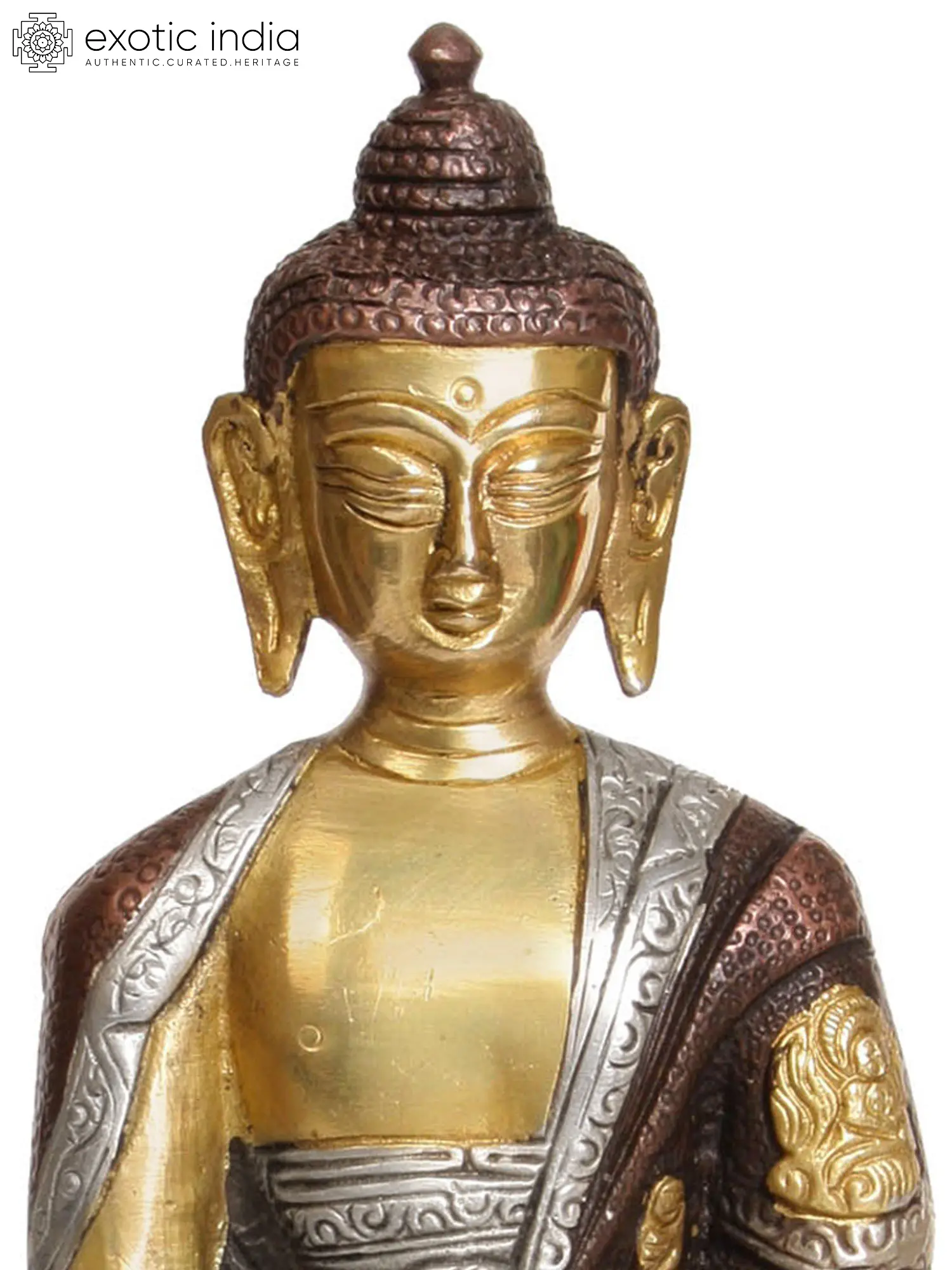 Handmade in India, this statue carries the legacy of generations of skilled artisans. India, the birthplace of Buddhism, holds a deep and enduring connection to the teachings of the Buddha. The creation of sacred objects like this one is often considered a spiritual practice in itself, with artisans imbuing their work with reverence and intention. The statue's brass composition lends it a weight and solidity that reflects the steadfastness of the Buddha's teachings. Each detail, from the serene facial expression to the intricate folds of the robe, is the result of careful handcraftsmanship, ensuring that this piece is not only beautiful but also imbued with a sense of the sacred. The lotus base upon which the Buddha sits is a traditional representation of purity and spiritual awakening. Rising from muddy waters, the lotus blooms untainted, symbolizing the ability to rise above suffering and achieve enlightenment.