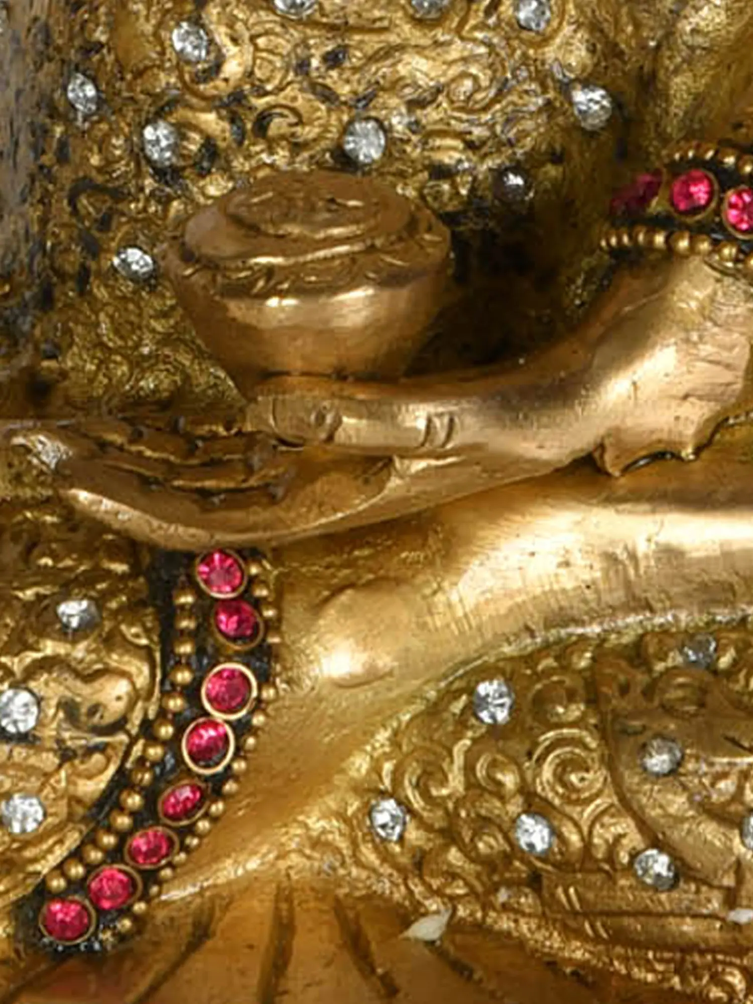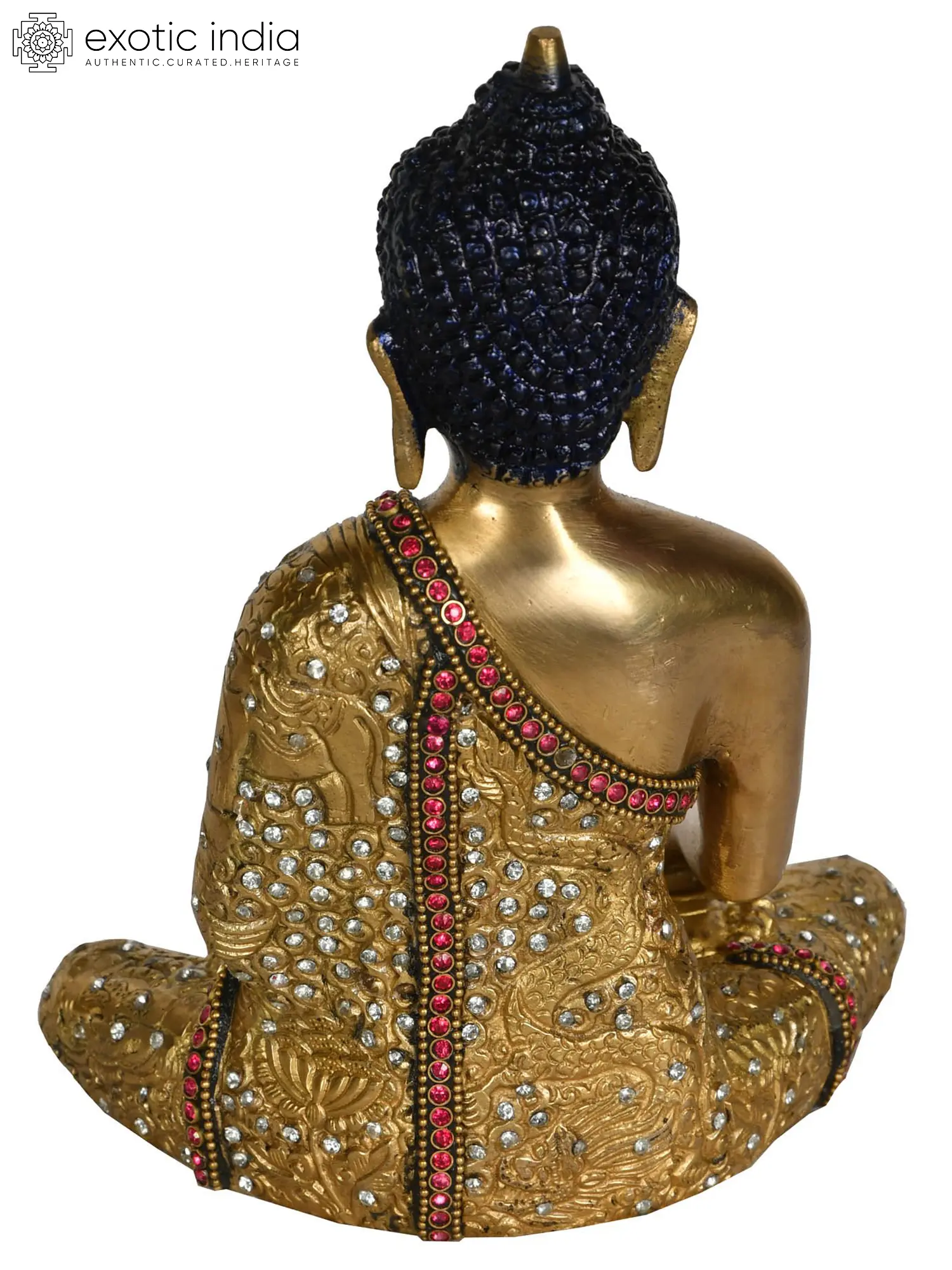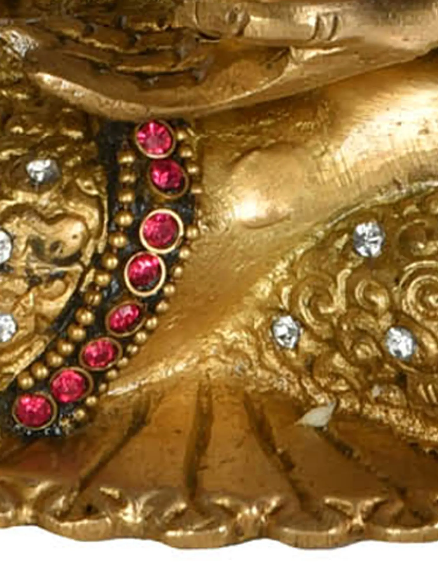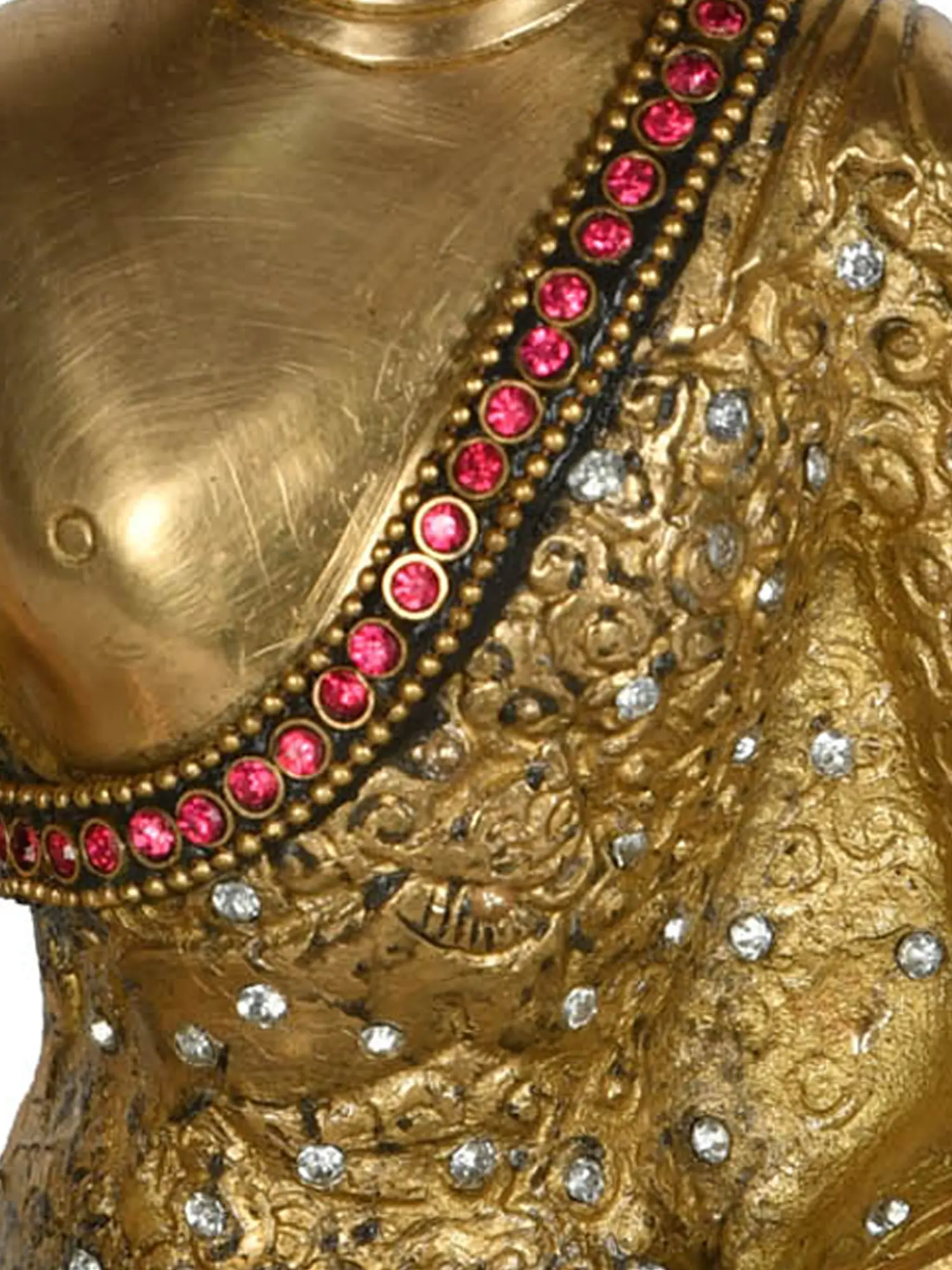 Meticulously handcrafted in India, this statue is cast in high-quality brass, lending it a timeless and majestic aura. The lustrous golden finish of the brass enhances the divine presence of the Buddha, while the intricate detailing on his robes, adorned with vibrant red and sparkling clear stones, adds a touch of opulence and spiritual richness. The dark, textured finish of his cranial protuberance, representing his wisdom and enlightenment, contrasts beautifully with the smooth, golden contours of his face and body. The gentle smile and downcast eyes convey a sense of profound peace and compassion, inviting contemplation and inner reflection.