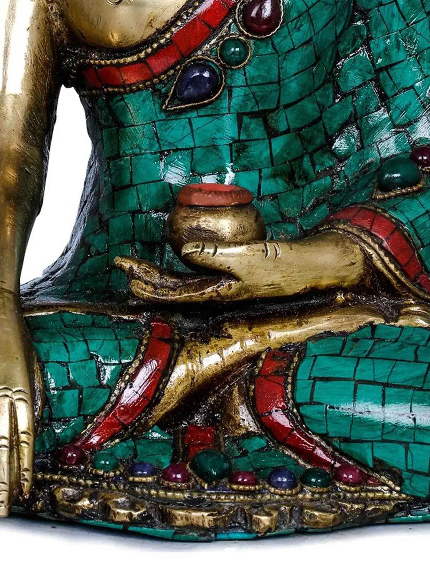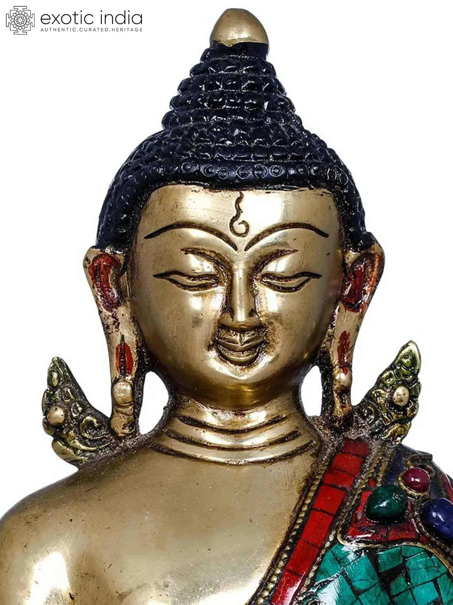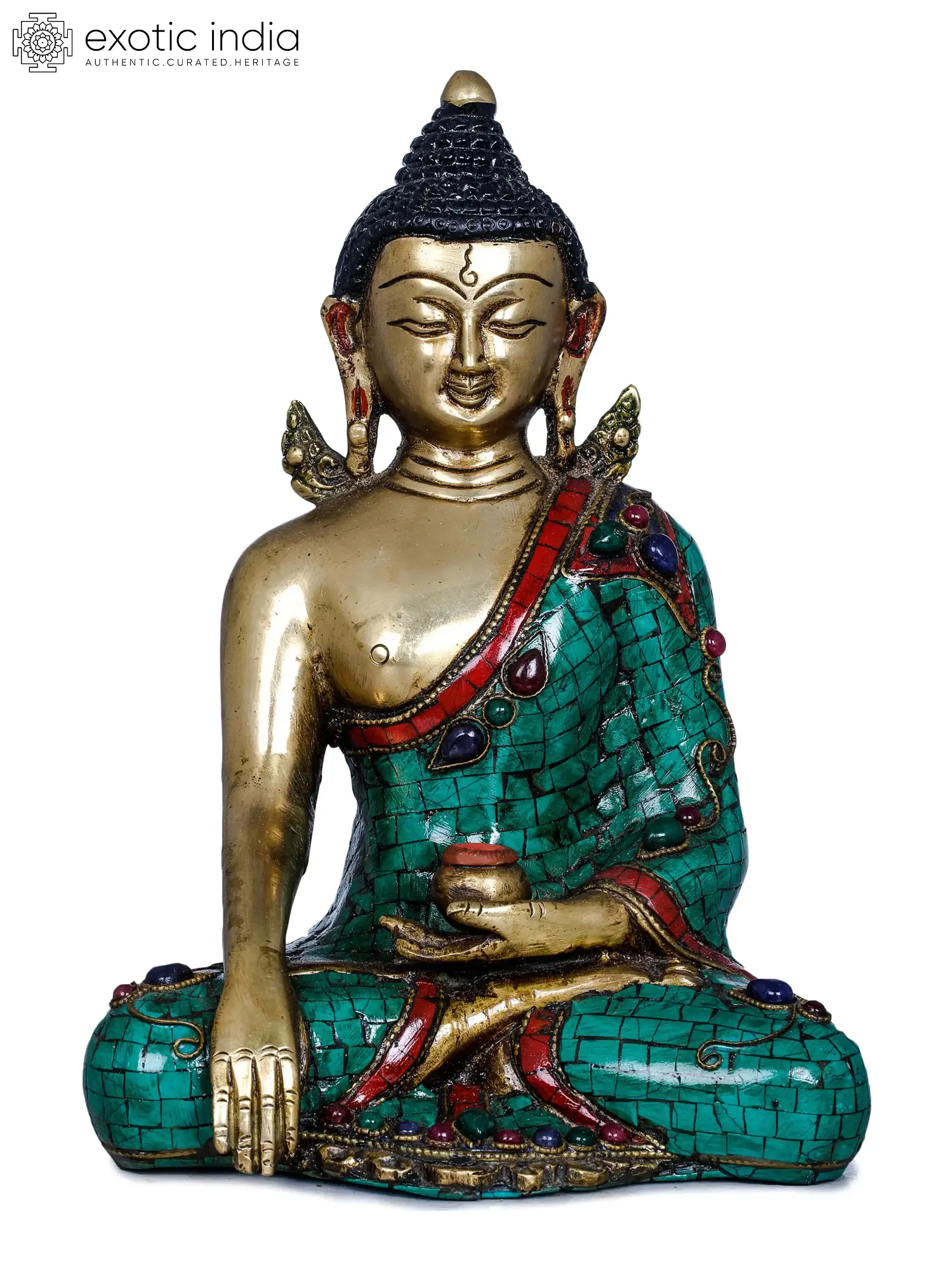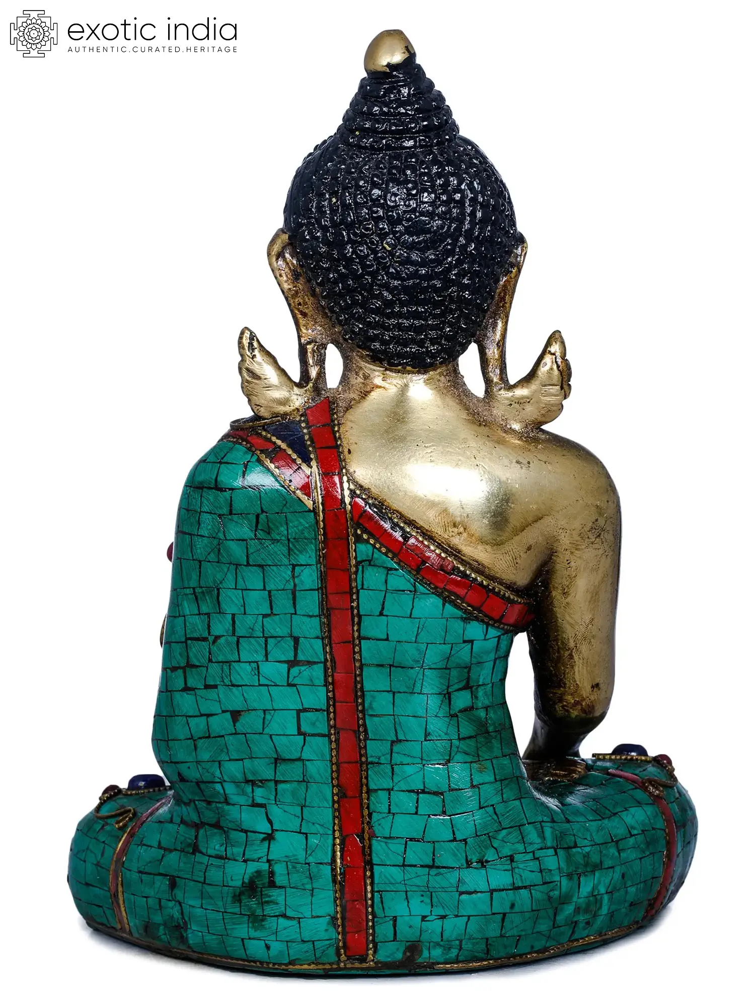 Crafted by skilled artisans in India, this statue is a testament to traditional craftsmanship and artistic excellence. The rich brass body is meticulously detailed, with the serene facial features, the coiled hair, and the urna (a dot between the eyebrows, representing a third eye of spiritual wisdom) all rendered with delicate precision. The Buddha's robes are adorned with vibrant inlay work, featuring meticulously placed turquoise-colored stones and accents of red and blue gemstones. These precious stones not only enhance the visual appeal of the sculpture but also symbolize the auspicious qualities and the boundless compassion of the awakened one. The interplay of the gleaming brass and the colorful inlay creates a truly captivating piece that exudes a sense of sacredness and beauty.