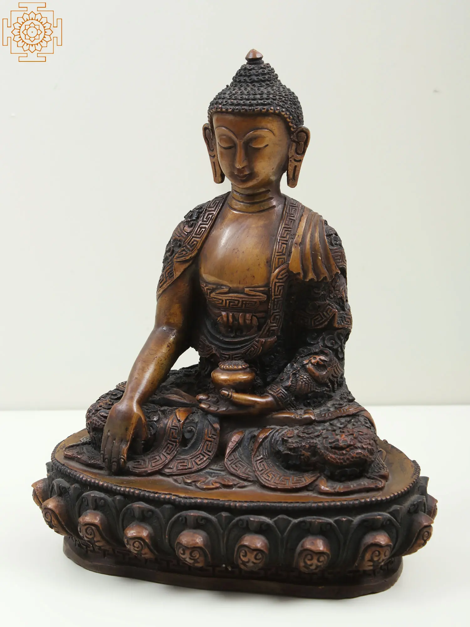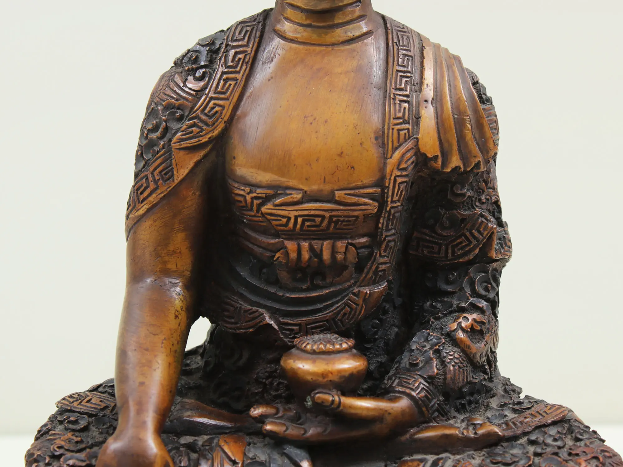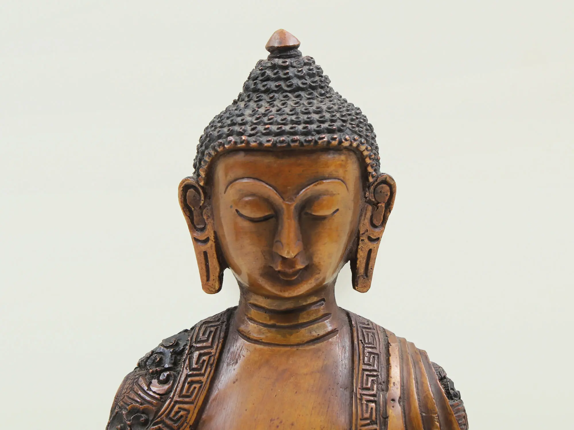 The image of ultimate enlightenment is Buddha Shakyamuni, who is shown in this Nepalese statue made of pure copper. The sculptor has painstakingly and realistically delineated each layer of the Buddha's robe's folds, his fine coils of hair, and the mediating yet animated eyes. In this beautiful handmade statue, Buddha emphasizes abstinence and inner peace as the way to enlightenment while holding the alms' bowl in his hand while seated in meditation.