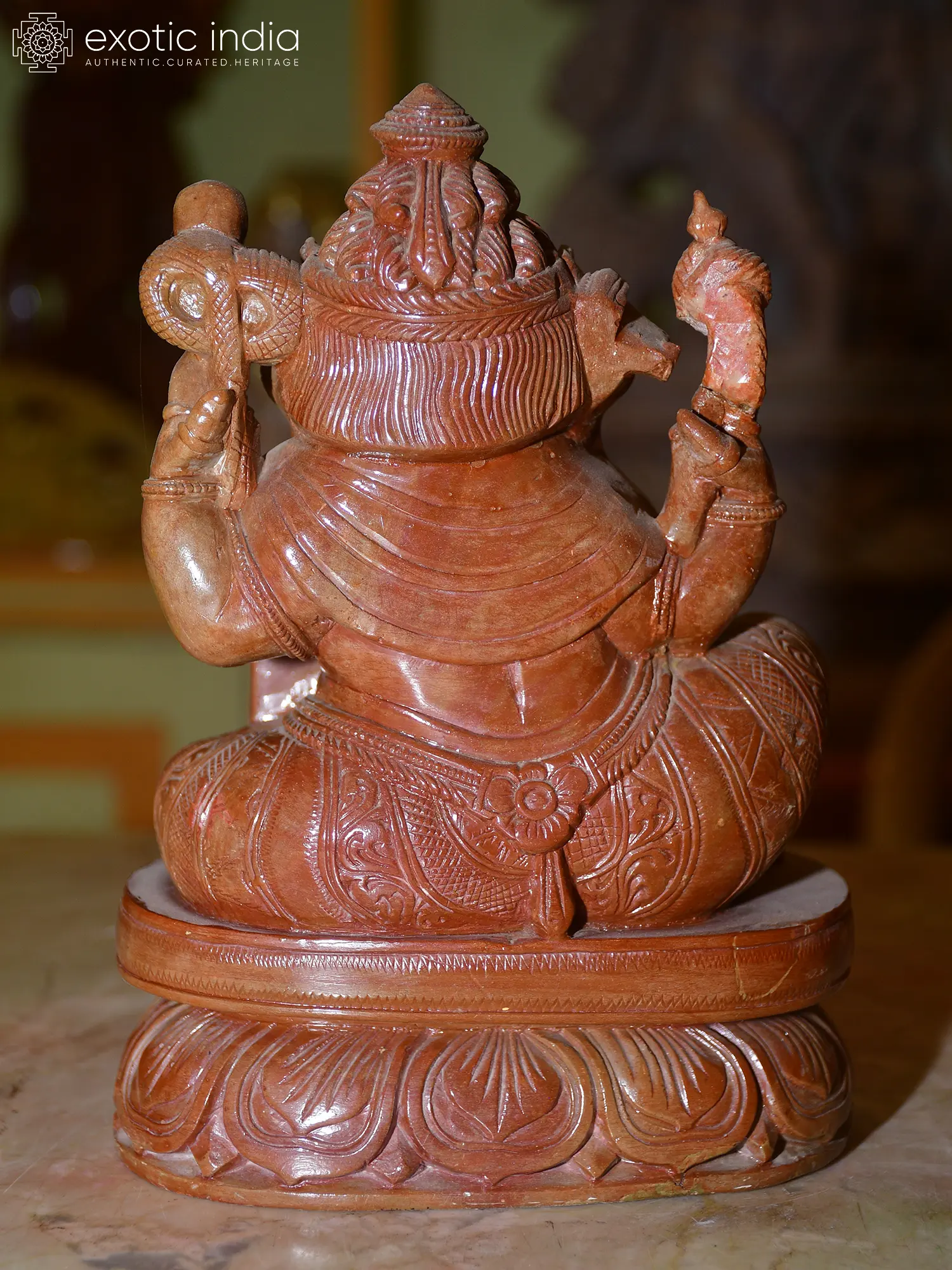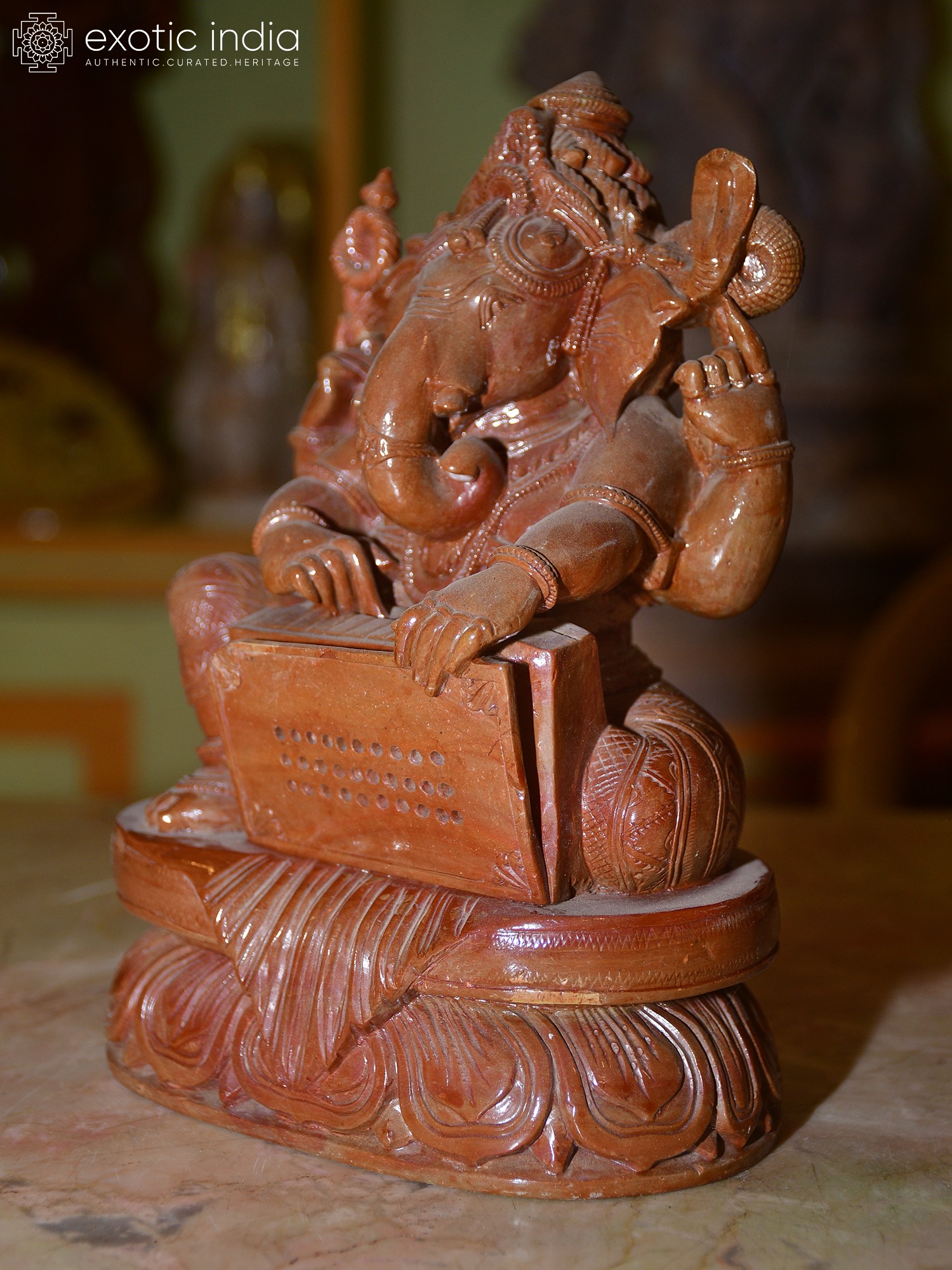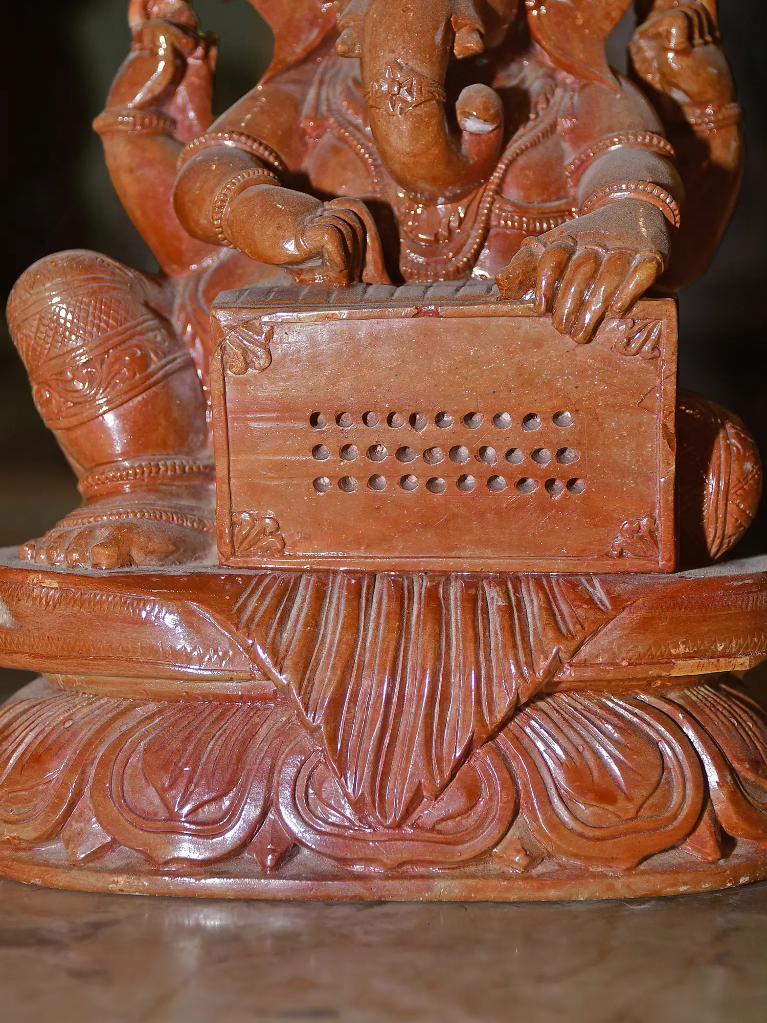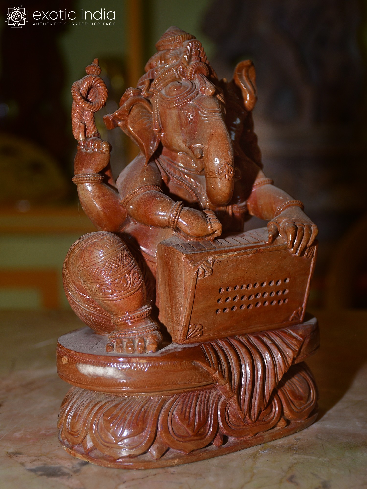 The artistry of this statue lies in the meticulous hand-carving that brings the Orissa red stone to life. The sculptor has rendered Ganesha's form with remarkable detail, from the coiled serpent adorning his headdress, a symbol of cosmic energy, to the intricate patterns etched onto his ornate dhoti. His multiple arms are expertly positioned, one set holding the harmonium, while another appears to be in a gesture of blessing or divine instruction. The very texture of the stone, with its earthy red hue, lends a sense of grounded spirituality and ancient heritage to the piece. The lotus base, a universal symbol of purity and enlightenment, provides a stable and elegant foundation for this divine musician.