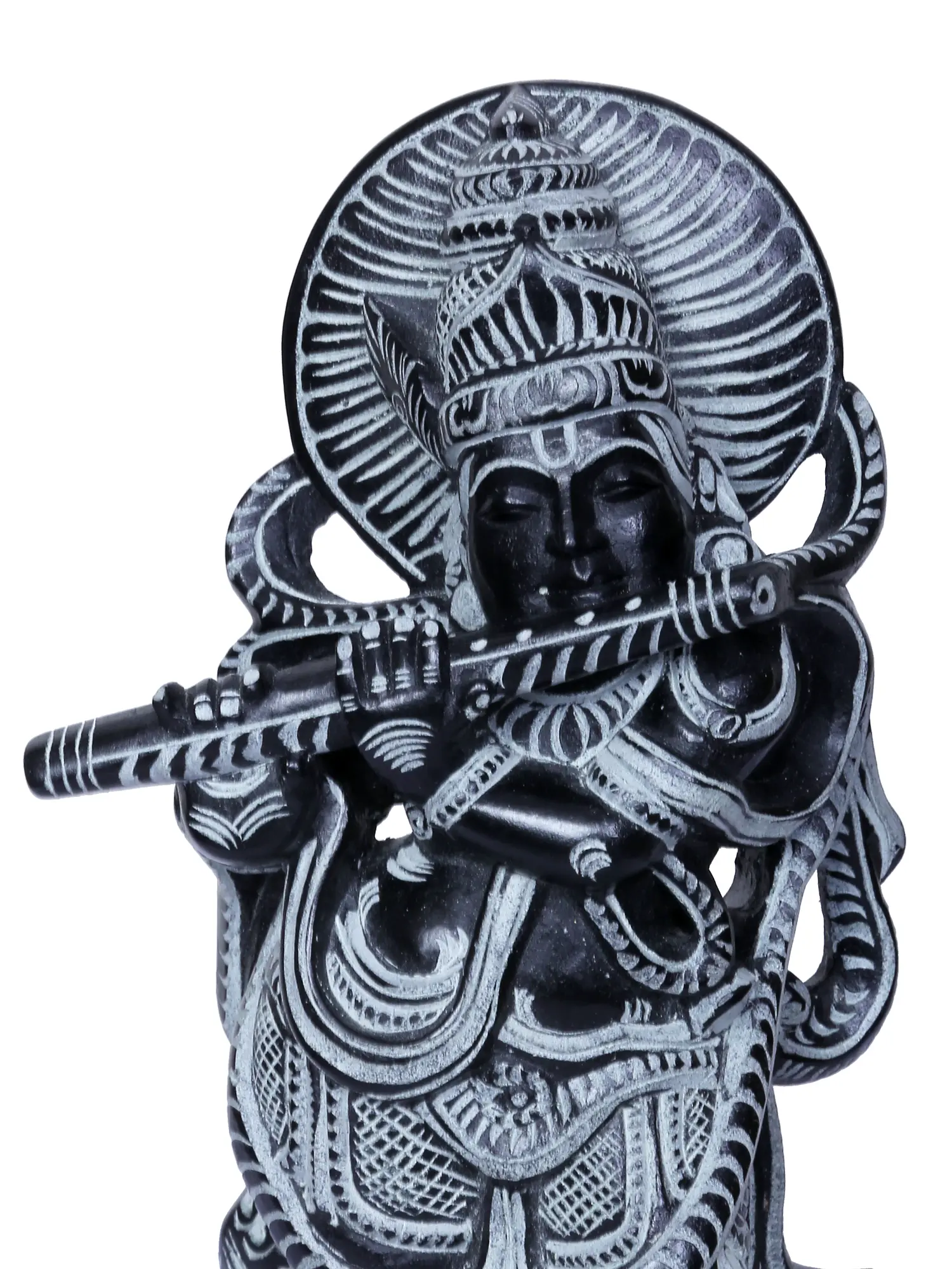 This exquisite stone sculpture captures the divine charm of Lord Krishna in his most beloved form – the celestial flautist. Crafted from the rich, dark stone of South India, specifically from the renowned artisan hub of Mahabalipuram, this piece is a testament to centuries-old sculpting traditions. The intricate carvings and detailed ornamentation showcase the masterful skill of the artisans, transforming a simple block of stone into a vibrant representation of the divine. The smooth, polished finish enhances the depth and texture of the carvings, giving the sculpture a timeless elegance.