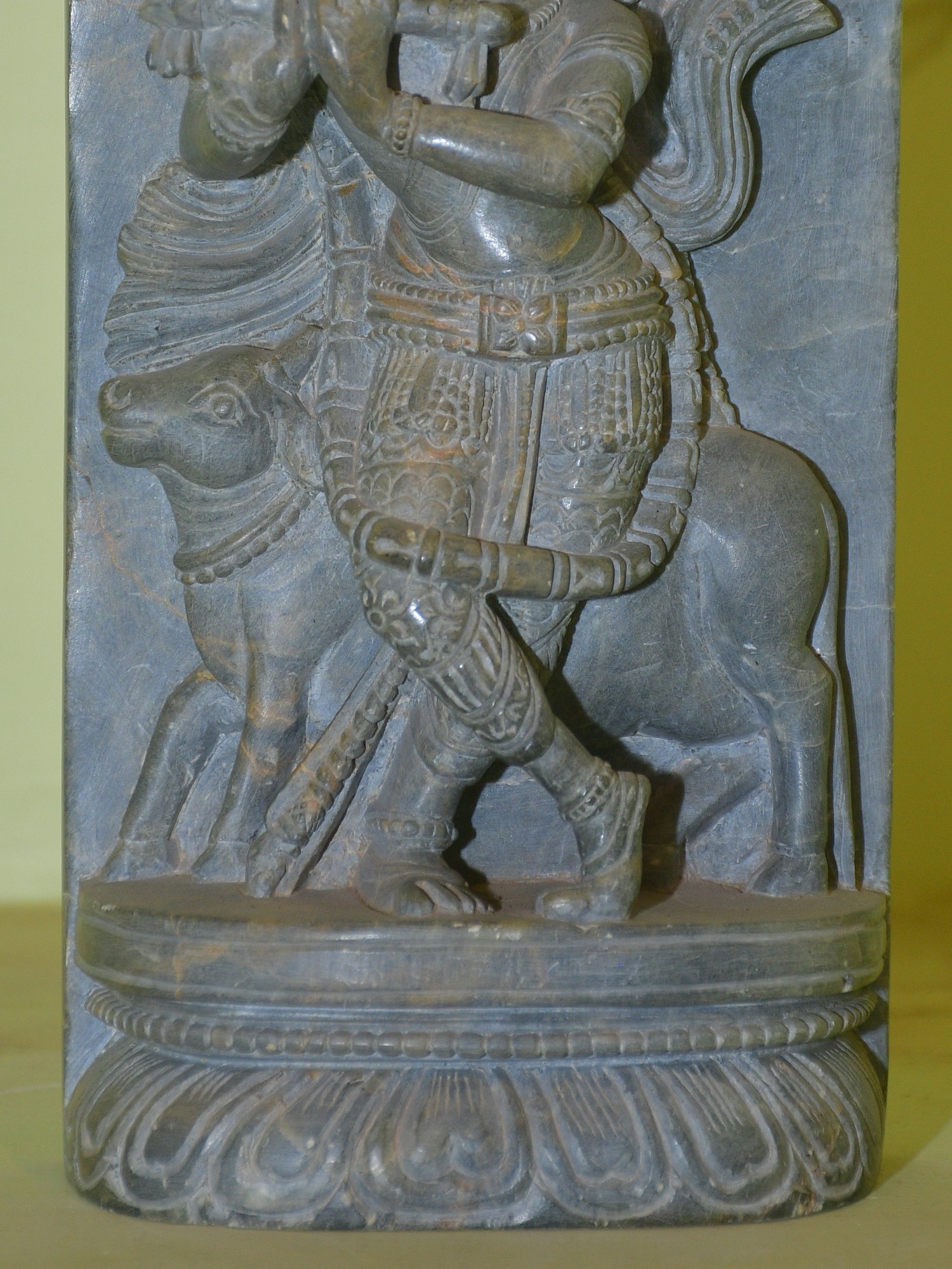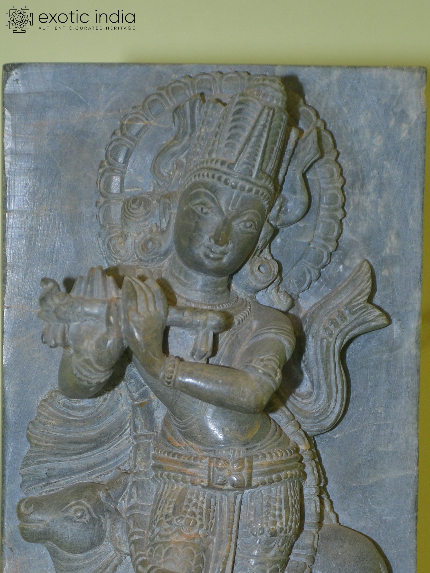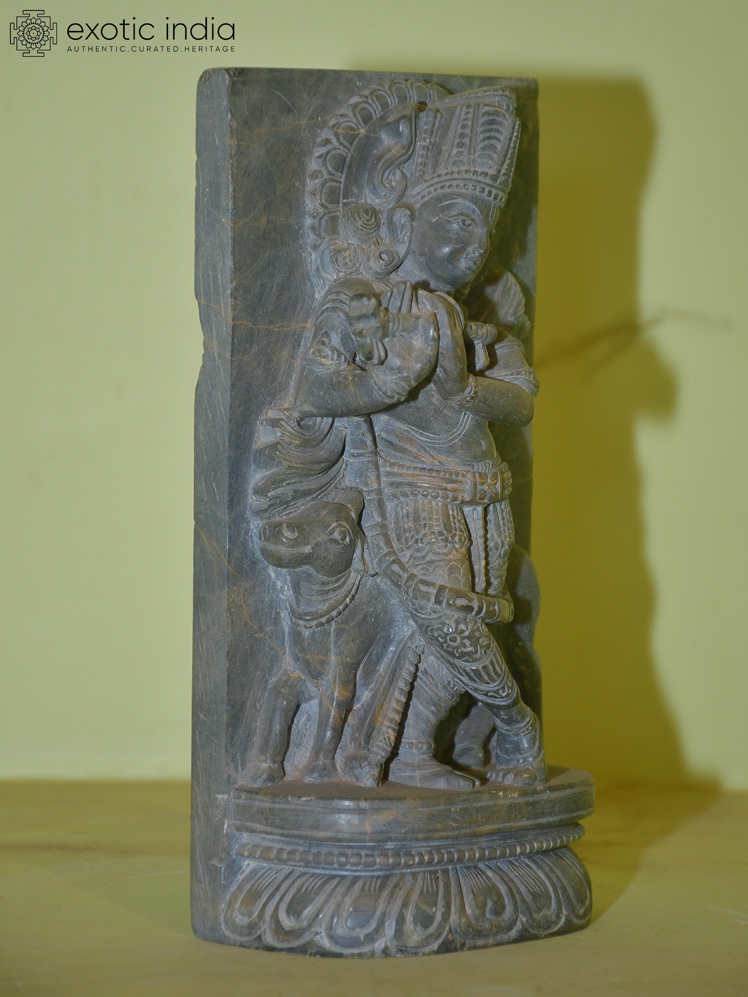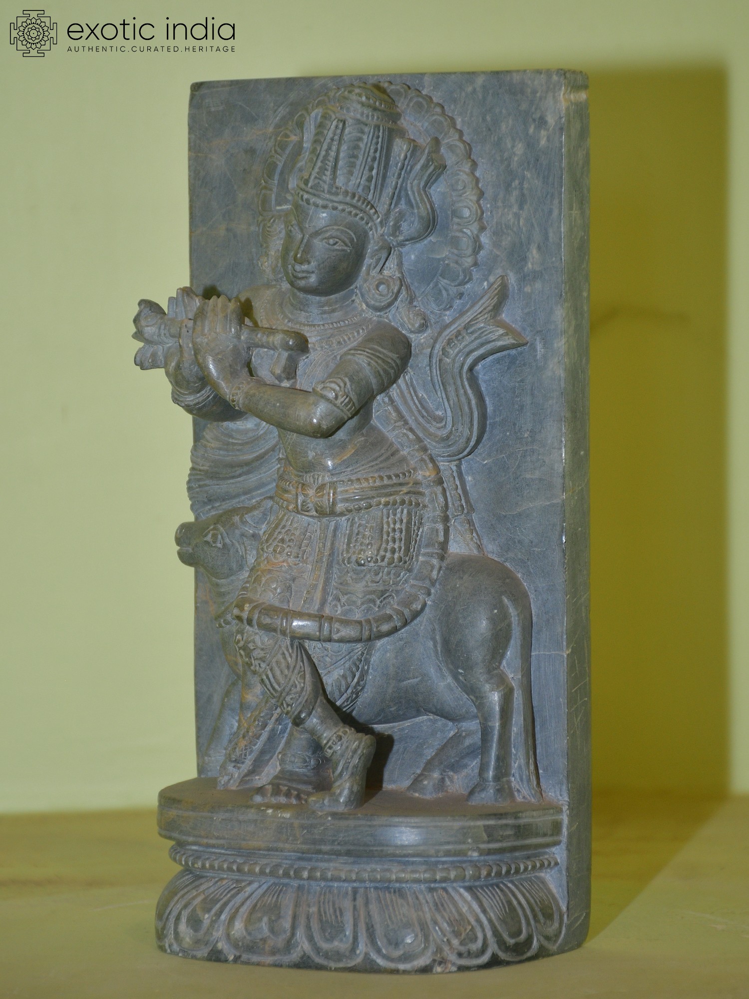 12" Dancing Lord Krishna Statue Playing Flute | Black Mahabalipuram Stone