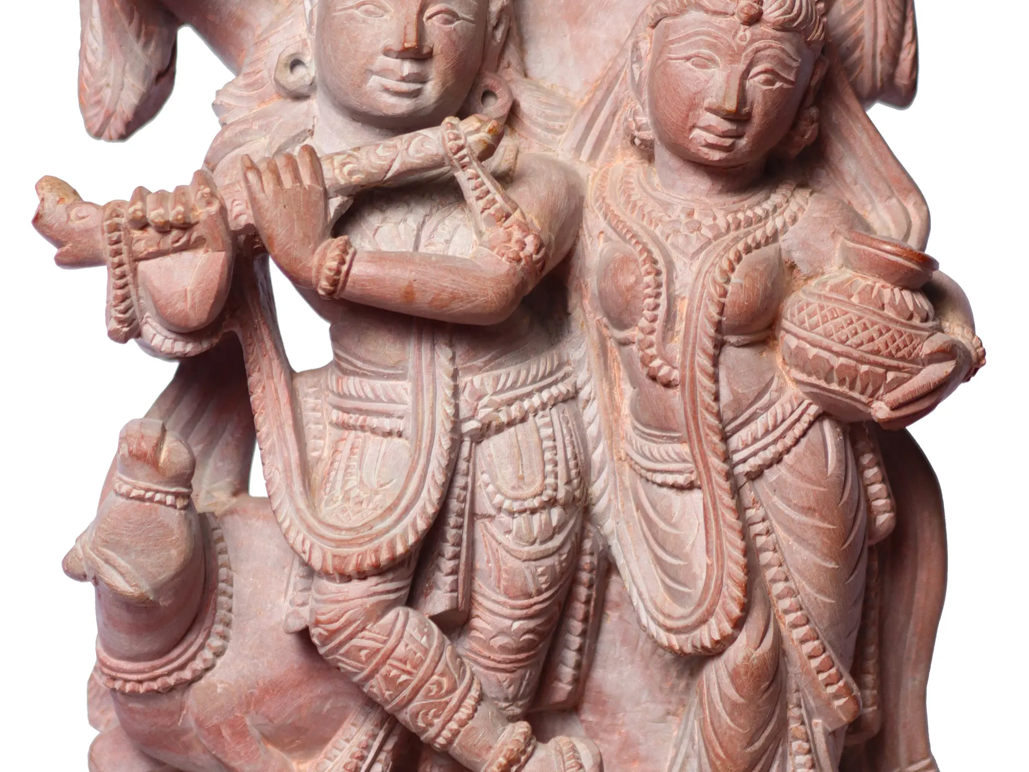 The Lord Radha Krishna is a mesmerizing pink stone statue that captures the divine love between Radha and Krishna. Lord Krishna, the divine flutist, and Radha, the epitome of devotion, stand together in eternal love. Their eyes meet with a deep understanding of their divine connection. This sculpture serves as a reminder of the sacred union of love and spirituality, inspiring us to seek the divine within ourselves and in our relationships. It symbolizes the eternal dance of love that transcends all boundaries and elevates the soul to higher realms of bliss and unity.