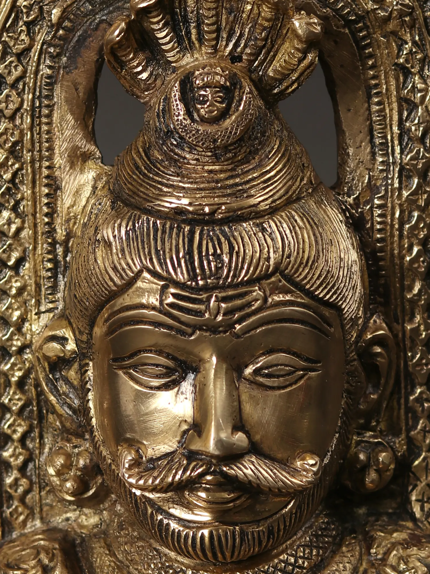 This Lord Shiva Head with Kirtimukha is a Brass statue that helps devotees to offer prayers to Lord Shiva, whose description of his great Tandava dance fills the devotees with a sense of blessedness. Here in this statue Lord Shiva's massive matted hair like a forest, is tied in the form of a hairbun and Goddess Ganga sits comfortably inside the crater of the hairbun. Lofty serpents hang down from supporting his neck, adorning his neck like lofty garlands.