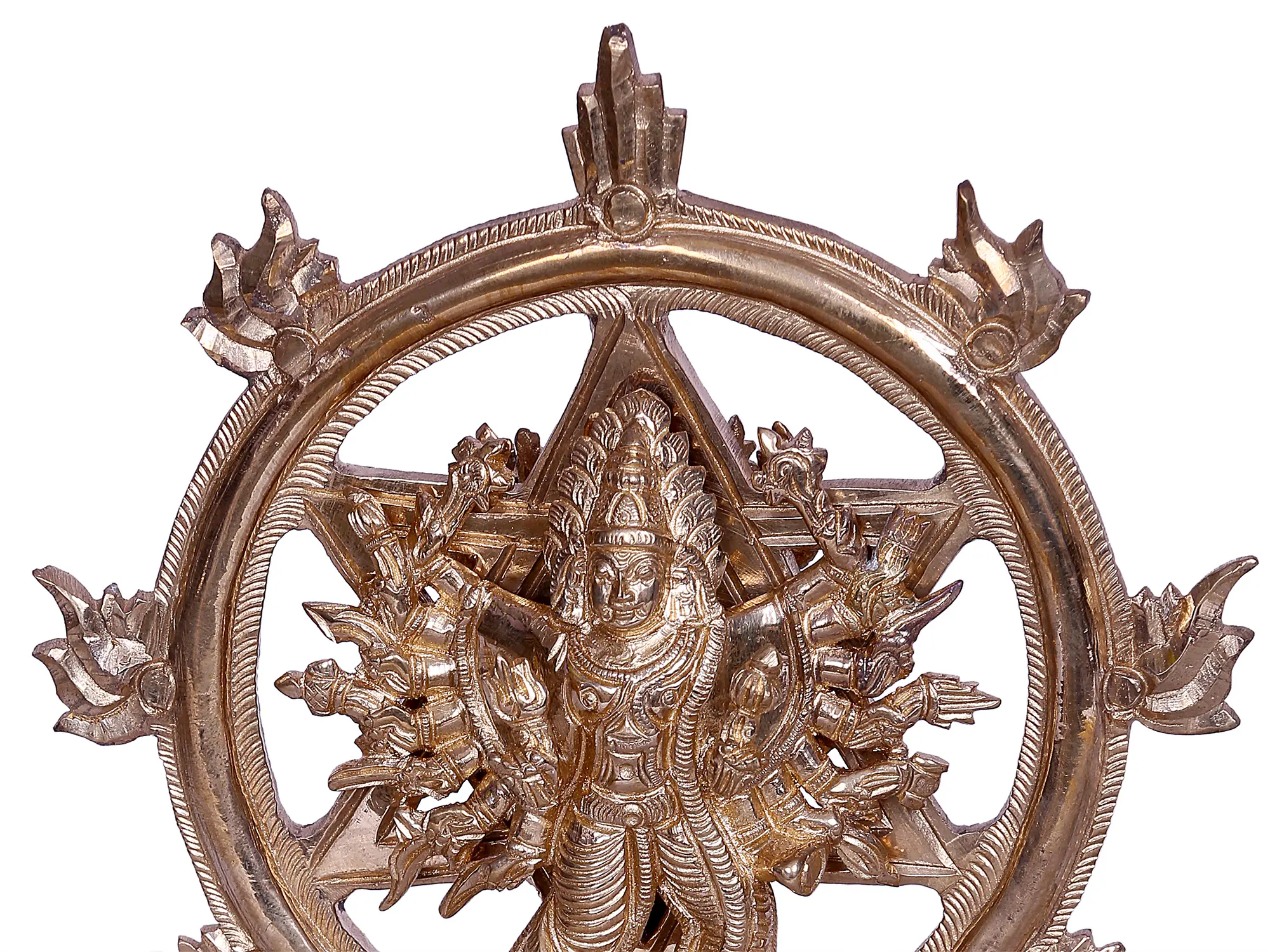 Also known as Sudarshan Perumal, the discus of Sri Vishnu takes a divine aspect in this icon, worshiped alongside the image of Vishnu-Narayana.