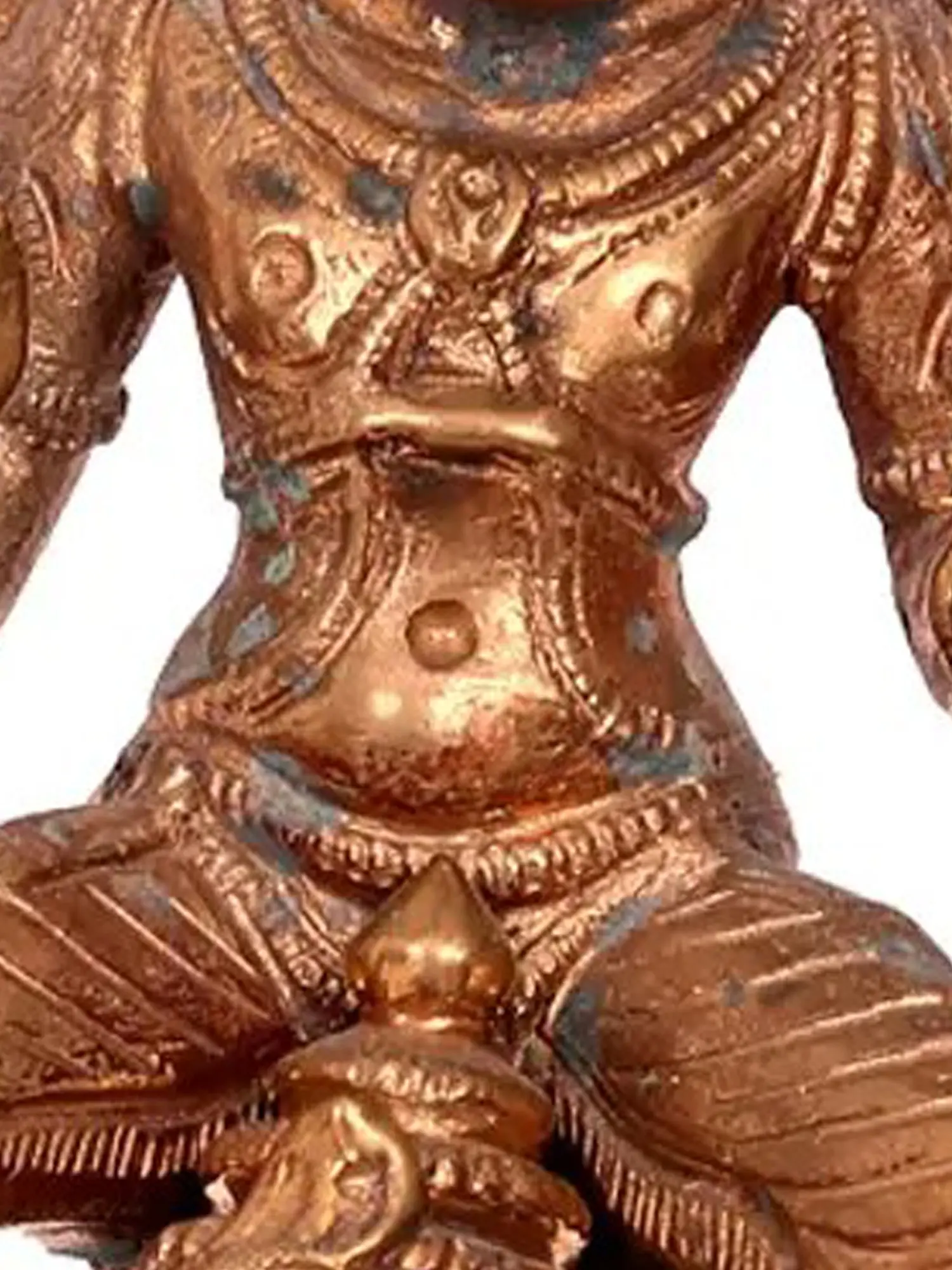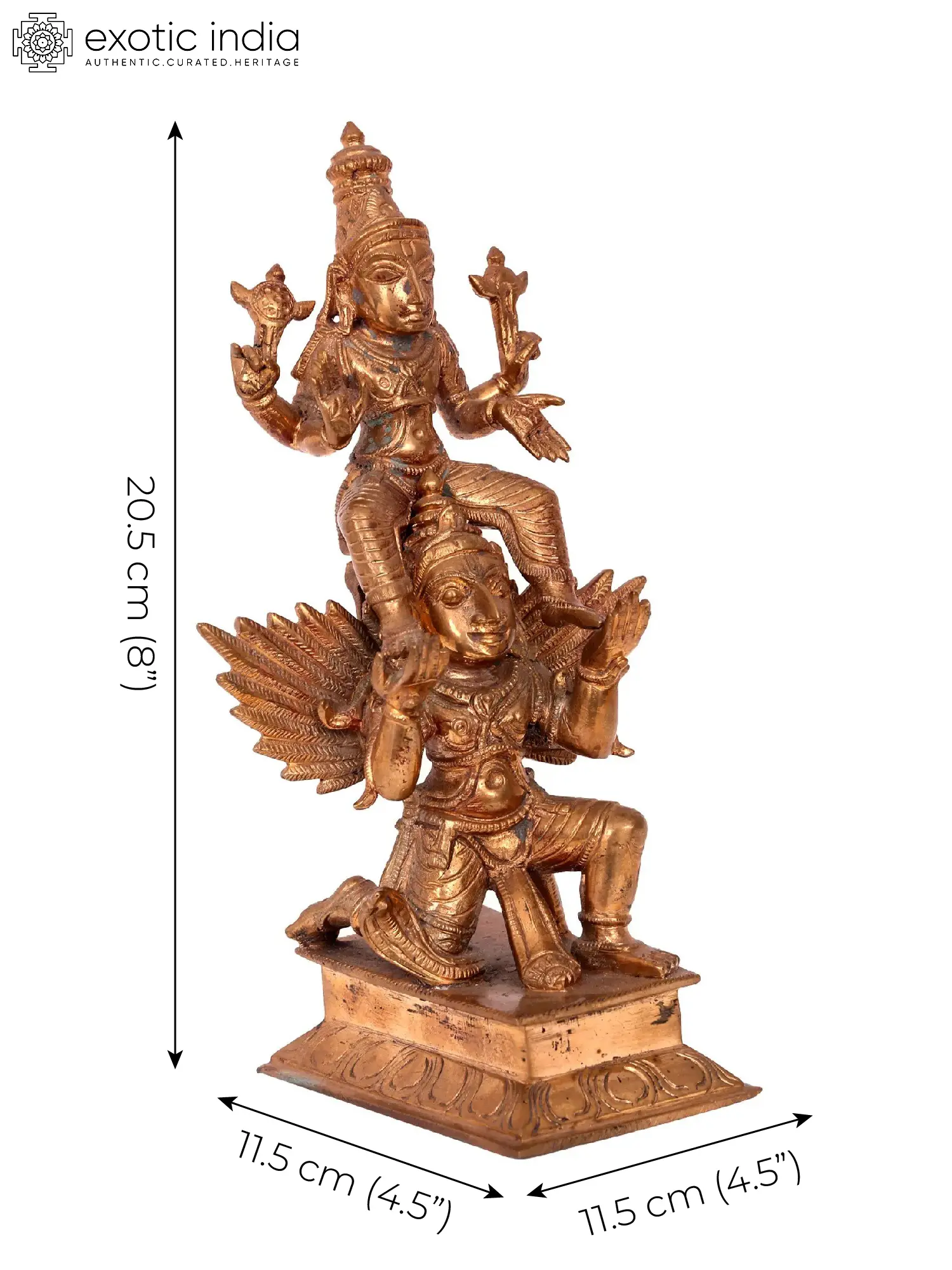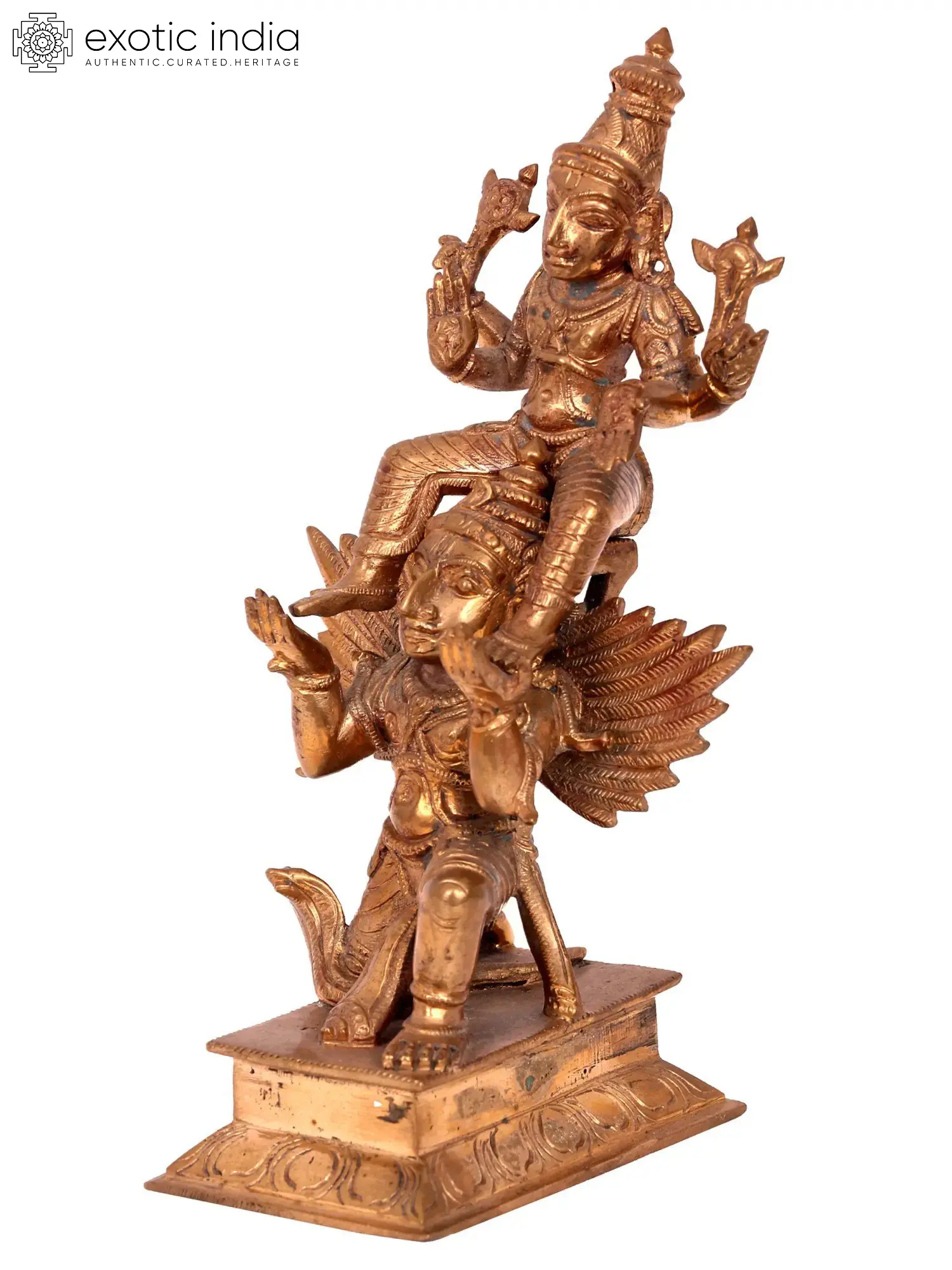 Vishnu mounted on his divine bird mount Garuda is a popular image in Hinduism, a symbol of the active, omnipresent, and ever-ready preserver, who descends from Vaikuntha as soon as his devotee calls out to him. This beautiful bronze statue depicts the classic Garudaaseena Vishnu (Vishnu seen or seated on Garuda). The cosmic bird opens his wings, bringing dynamism to the icon, and holds Vishnu’s lotus feet in his hands. Adorned with a crown and Vaishnava forehead mark or Tilak, Garuda tramples a serpent, his enemy under his knee, hinting at the valor of Vishnu’s vahana. Chaturbhuja or four-armed Vishnu faces the devotee, carrying his potent weapons and poses actively, to suggest a swiftness in answering the prayers of his Bhaktas.