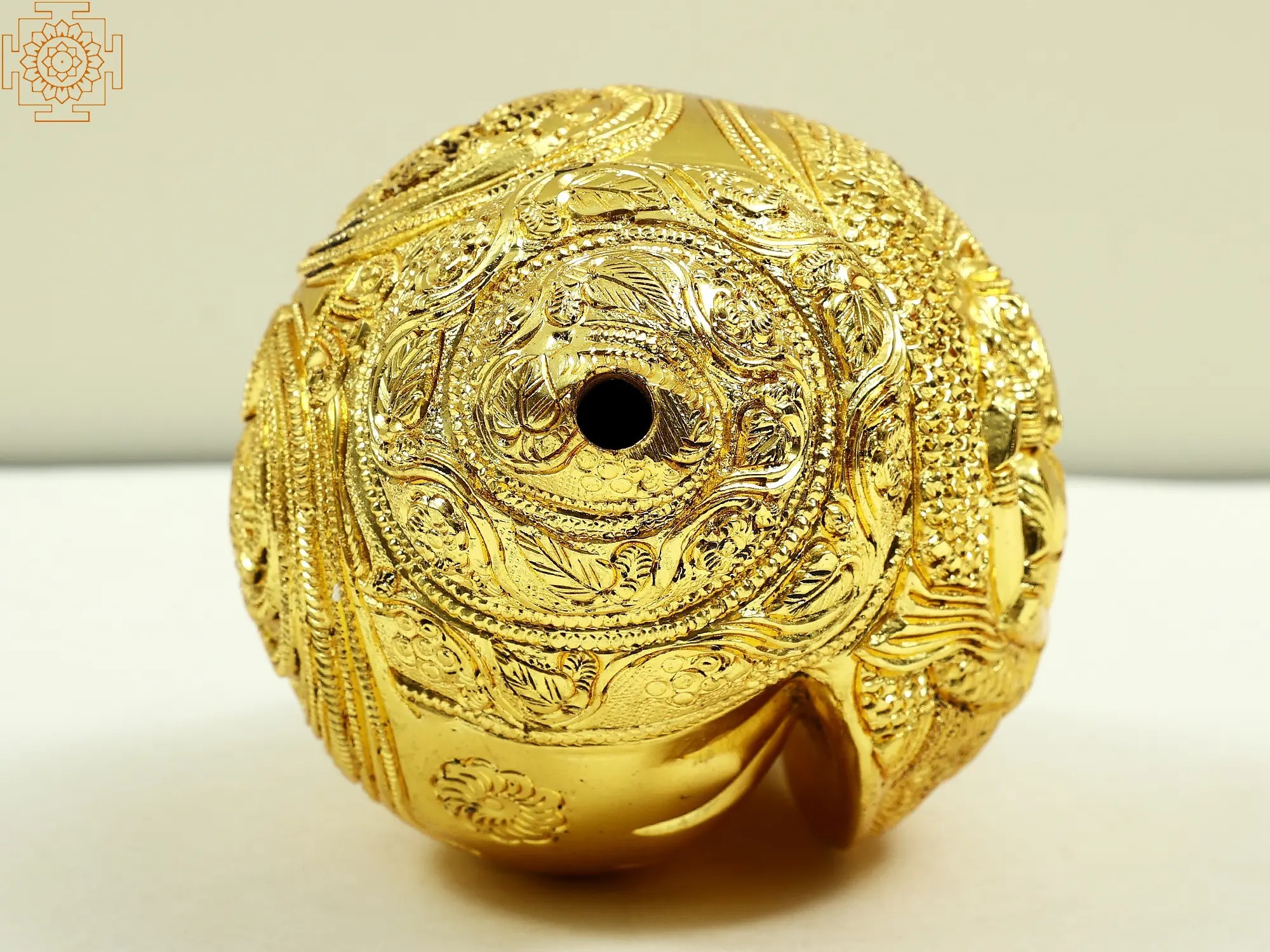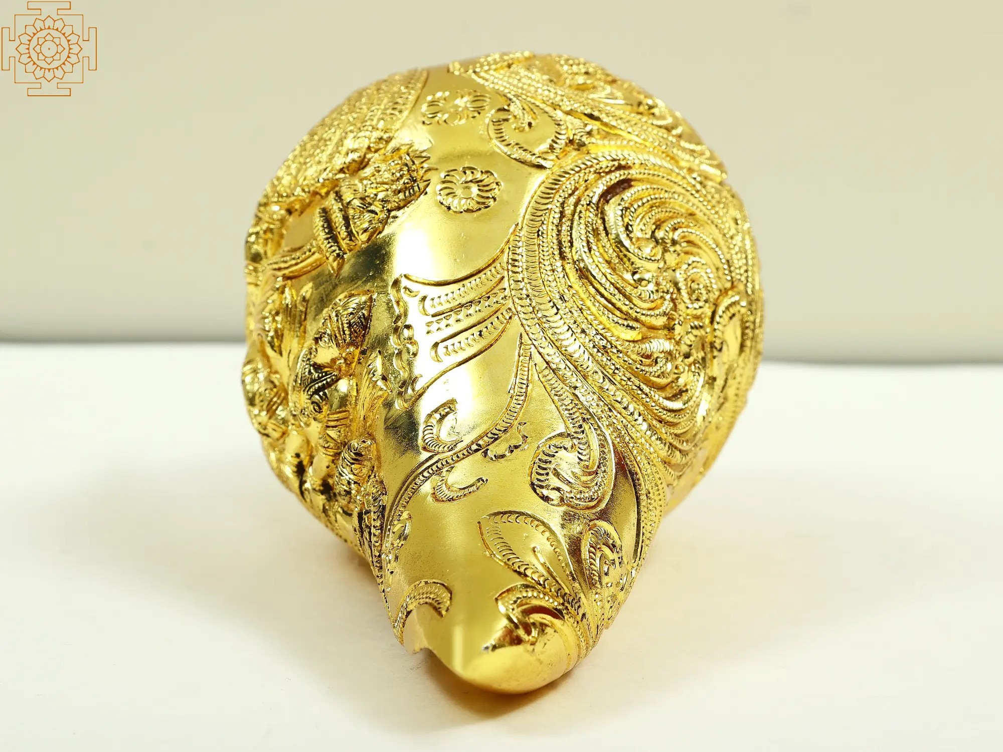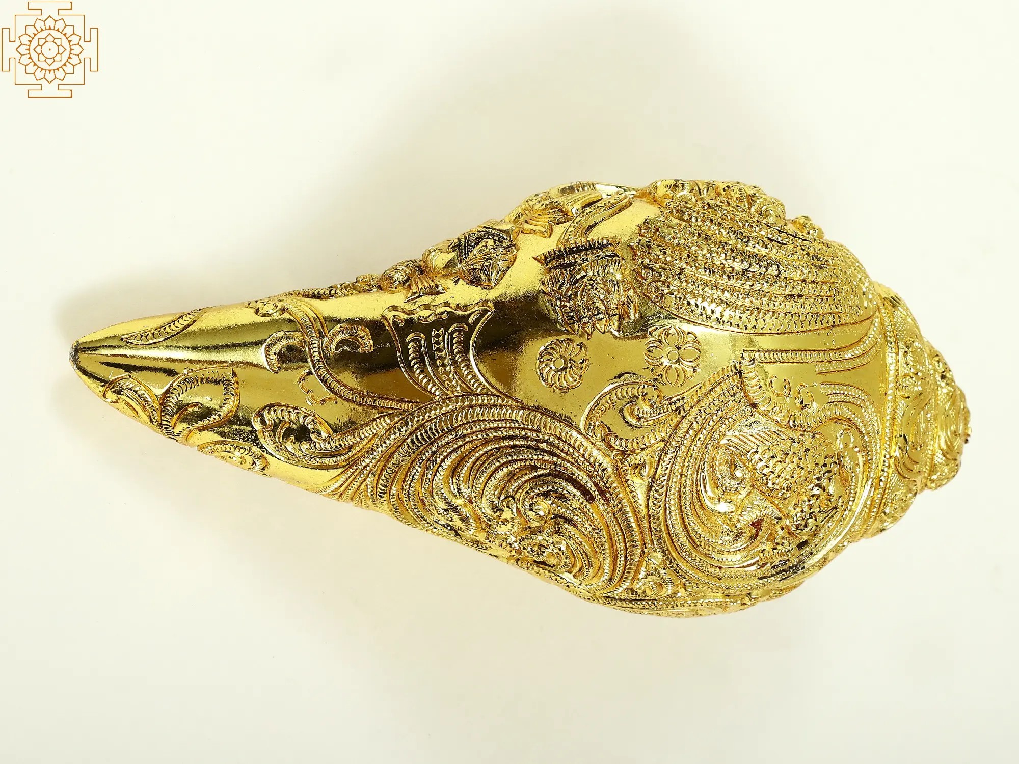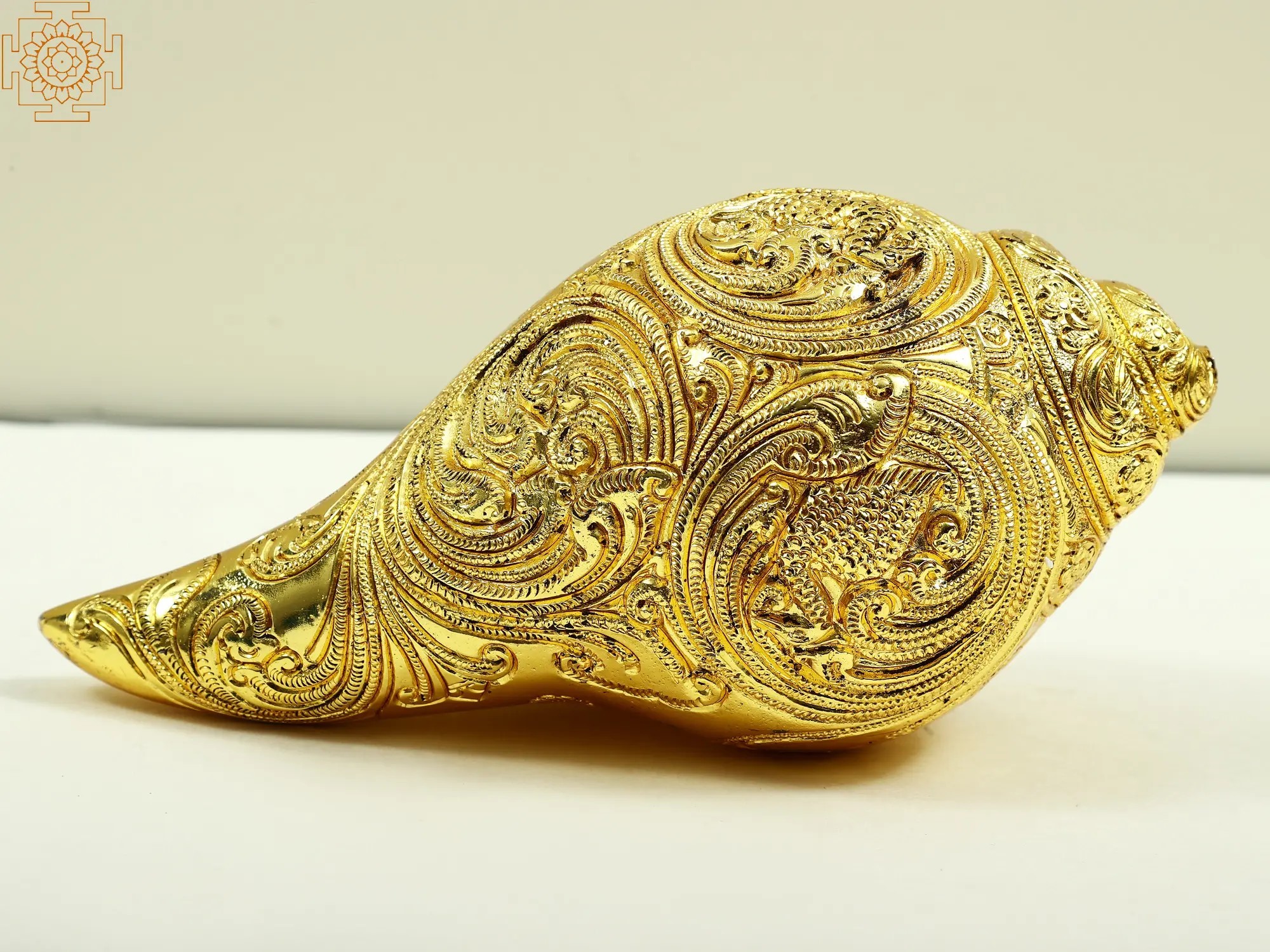 This brass designer conch is made based on the myth which says that Vishnu along with certain other divinities resides in the body of the shankha. Regularly sprinkling Gangajal on this conch will be as rewarding as performing the abhishekam (ritual bathing) on a Vishnu icon.