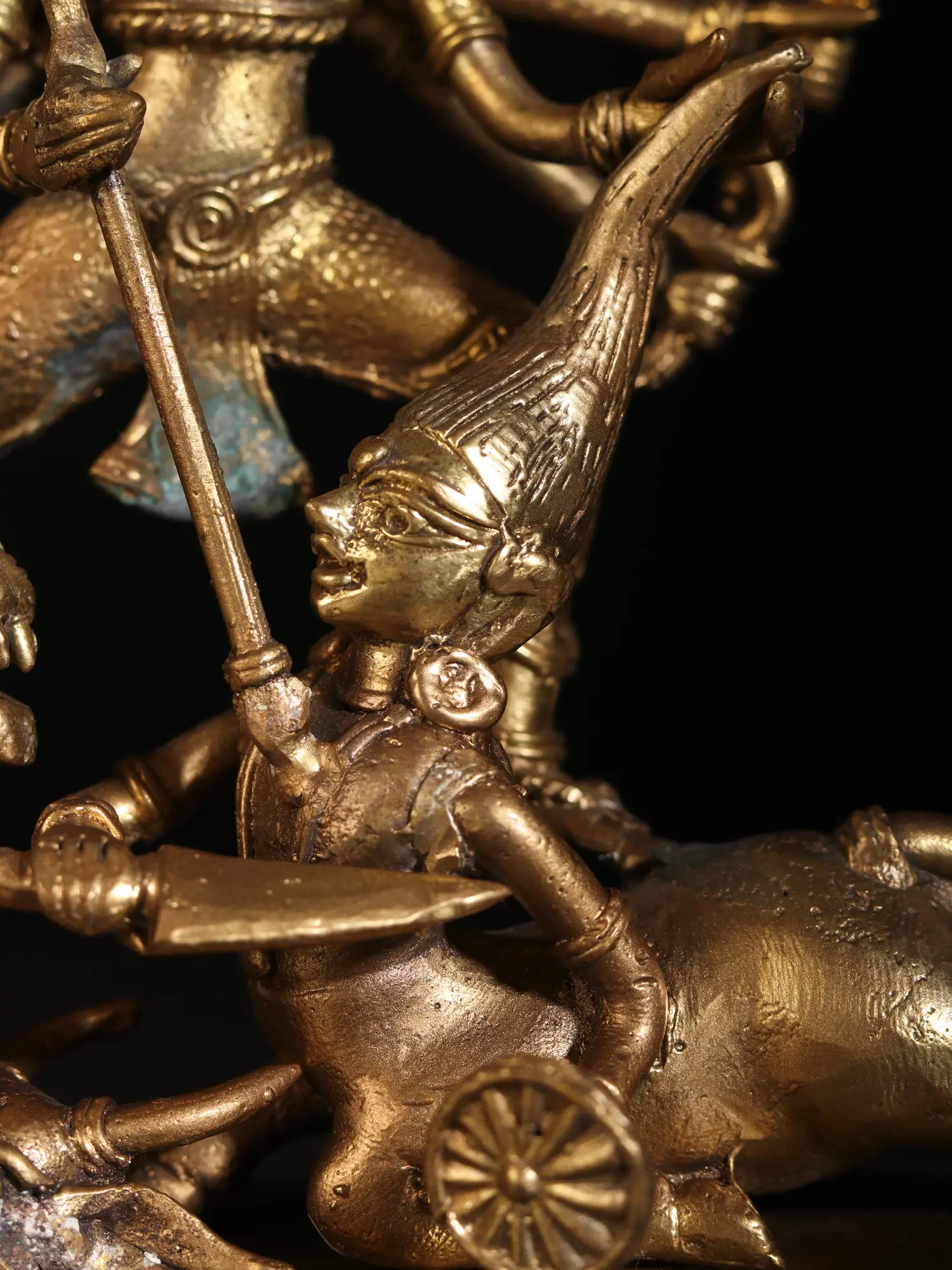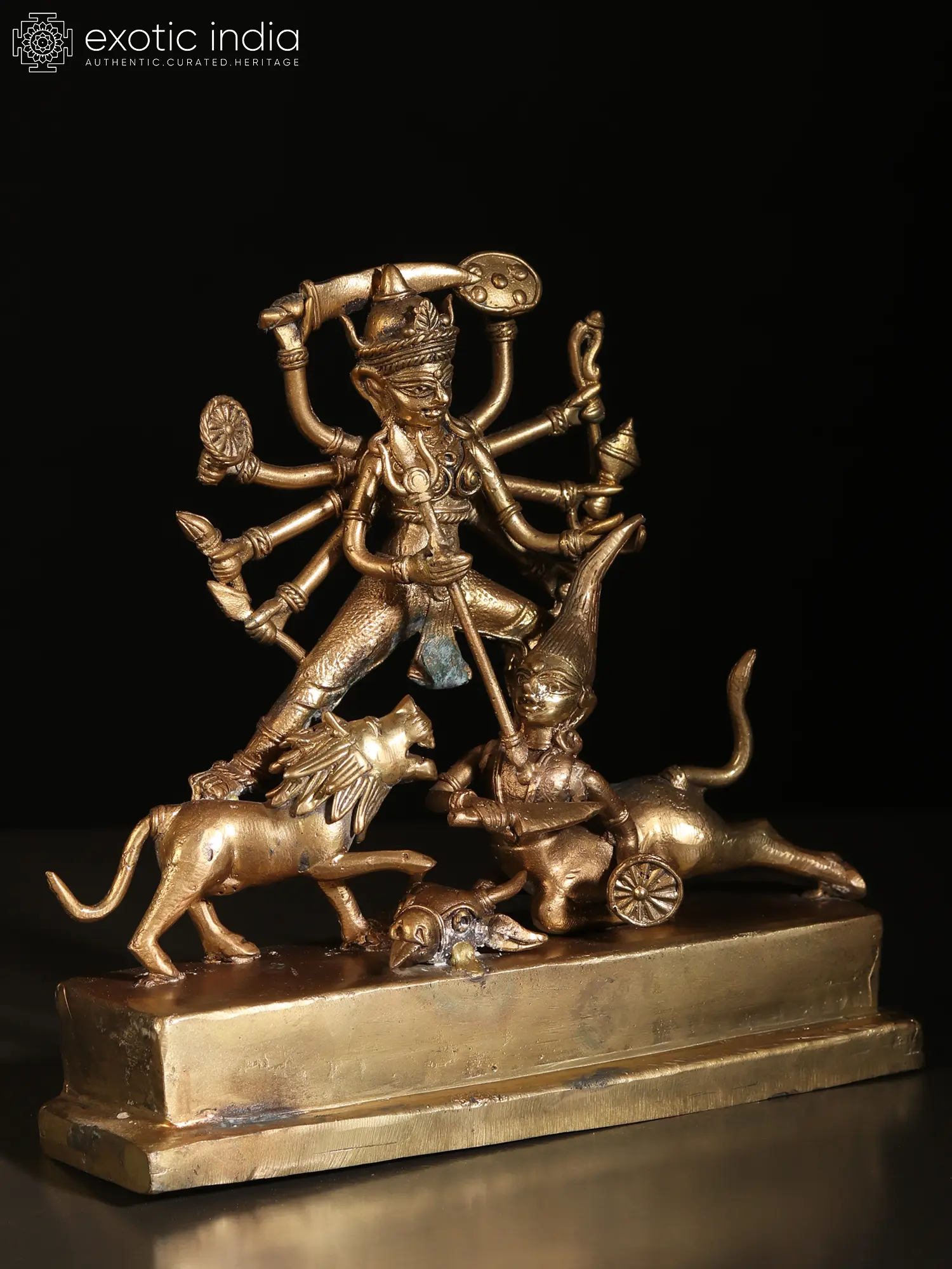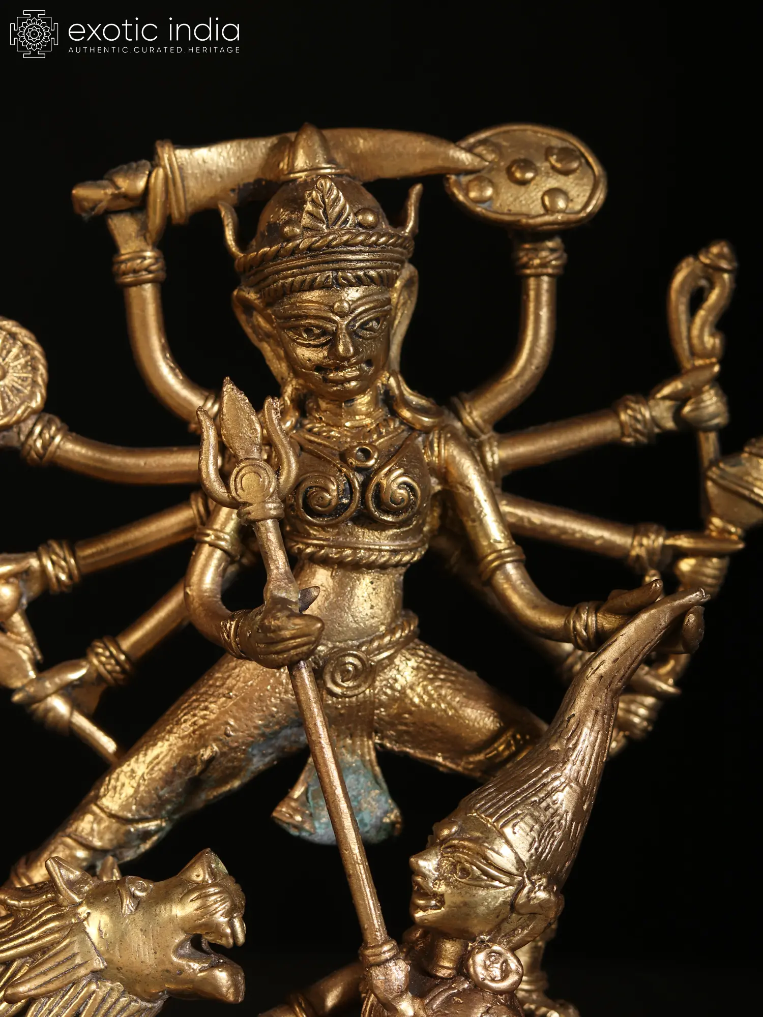 The powerful legends of Durga-Mahishasuramardini have been presented by every art form in Indian culture, each narrating the might of the great goddess beautifully in their own idiom. This Dhokra brass statue of Mahishasuramardini creates a moving atmosphere of Devi’s victory over the forces of evil, represented by the buffalo-demon who lies in her feet, being trampled by goddess, who holds his hair in one hand, and pierces his chest with her trident with the other. The Dashabhuja (ten-armed) goddess with her many weapons around her, weaves an aura of animation and vigor, which is amplified by the roaring lion she stands on, the extended buffalo form of Mahishasura, and his hands attempting to raise his weapons.