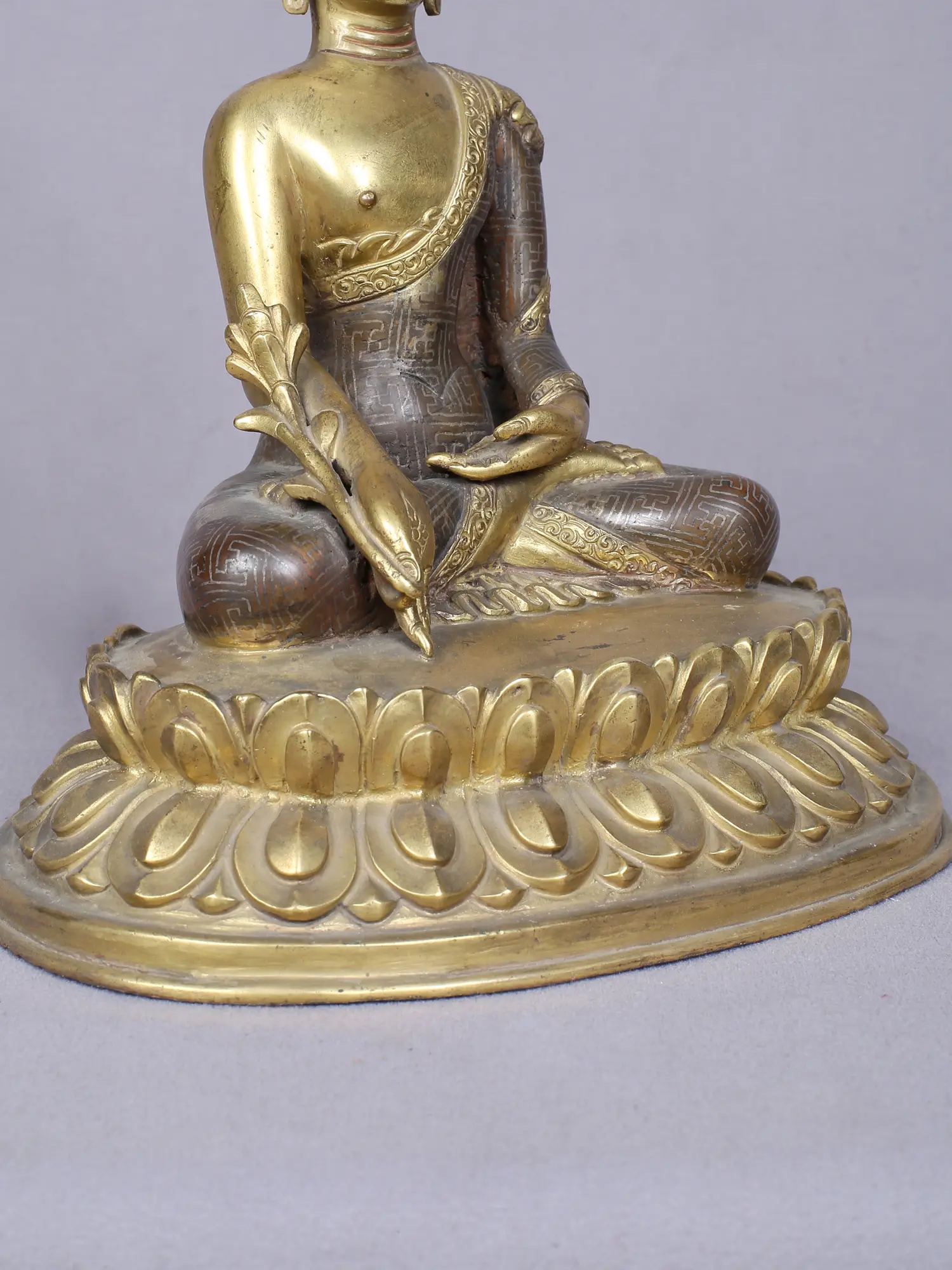 Medicine Buddha is enthroned on a beautifully detailed double-layered lotus throne, in Padmasana (lotus pose), a meditative posture, holding a pot of Ambrosia and herb in his hands. He is wrapped in an artistically designed garment, patterned with the sacred Swastika motif, which in Buddhism symbolizes the lotus foot marks of the Buddha.