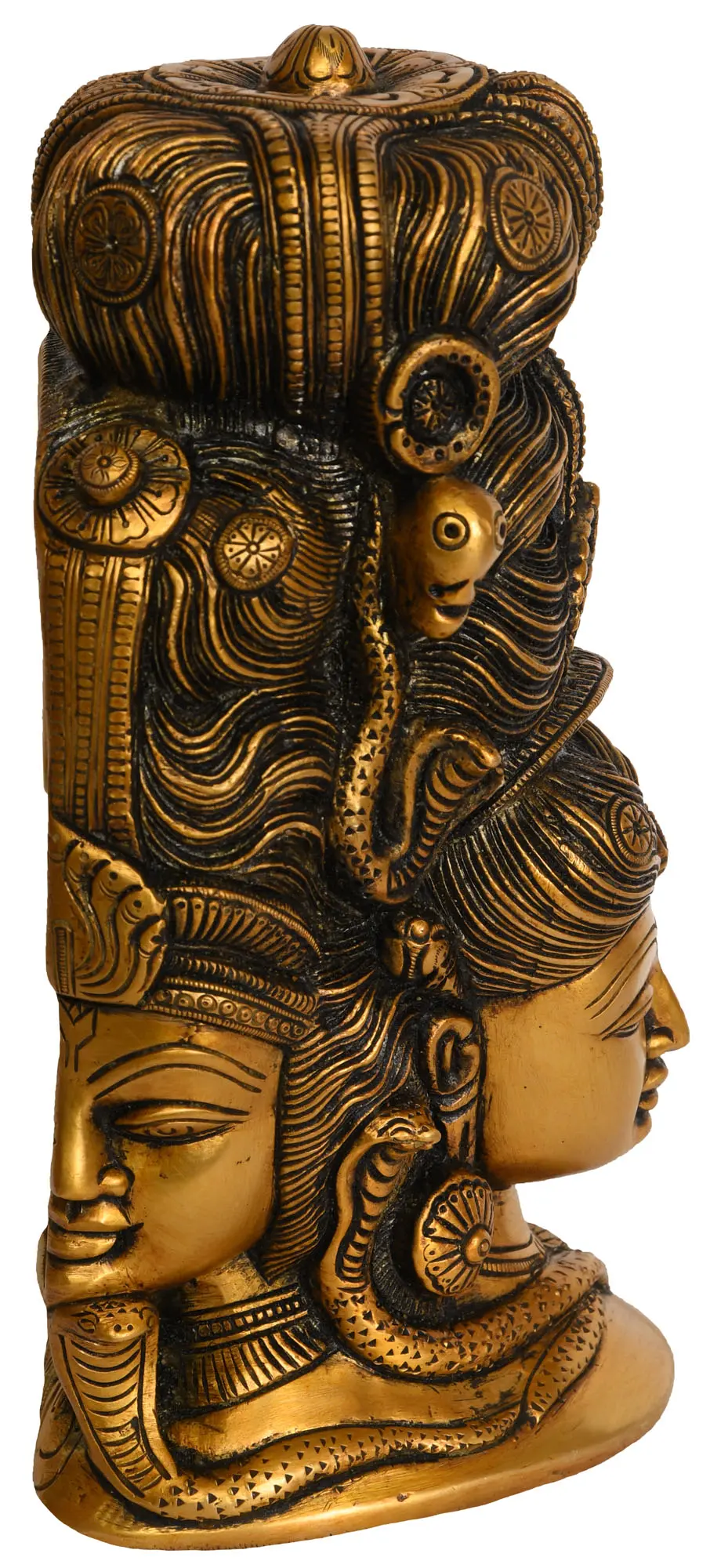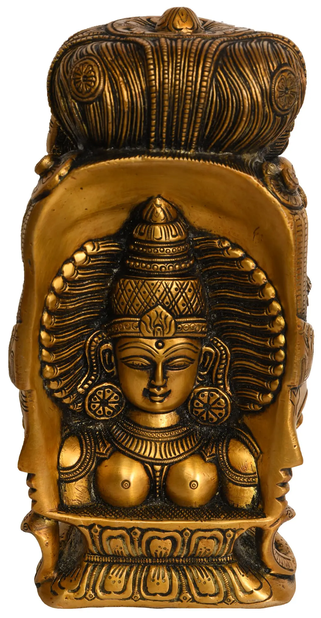 Celebrate the divine union of Shiva and Parvati with this beautifully crafted brass Mukhalingam. This sculpture not only showcases Lord Shiva's iconic lingam but also features a depiction of Parvati on the rear side - it captures the deep spiritual significance of their union. The presence of Parvati on the rear side of the Lingam symbolises the unity of the divine masculine and feminine. Placing this sculpture in your home invites the blessings of Shiva and Parvati, fostering an atmosphere of love, harmony, and spiritual balance.