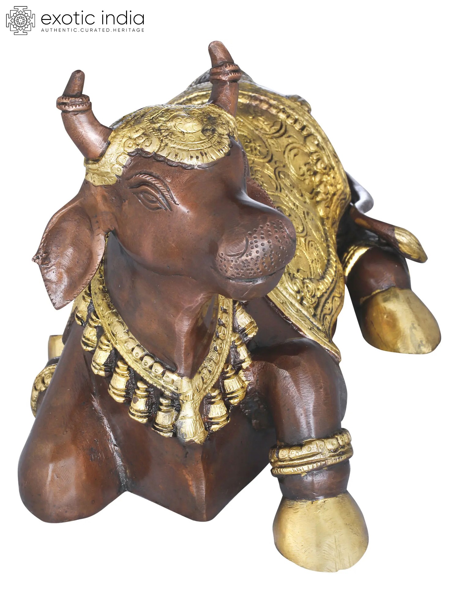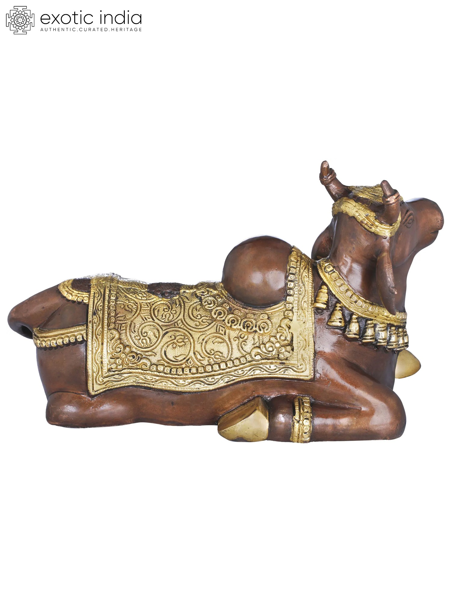 Nandi is arguably the most-loved bull in the subcontinent. The trusted vahana of Lord Shiva, Nandi is immortally devoted to Him. In this fine brass sculpture of the divine bull, He wears a joyous composure of countenance that borders on bliss. His head is turned up slightly leftwards, His eyes directed straight ahead at probably the approaching Lord Shiva. Note the gorgeous golden adornments from the tip of His horns to the base, spreading across His temple.